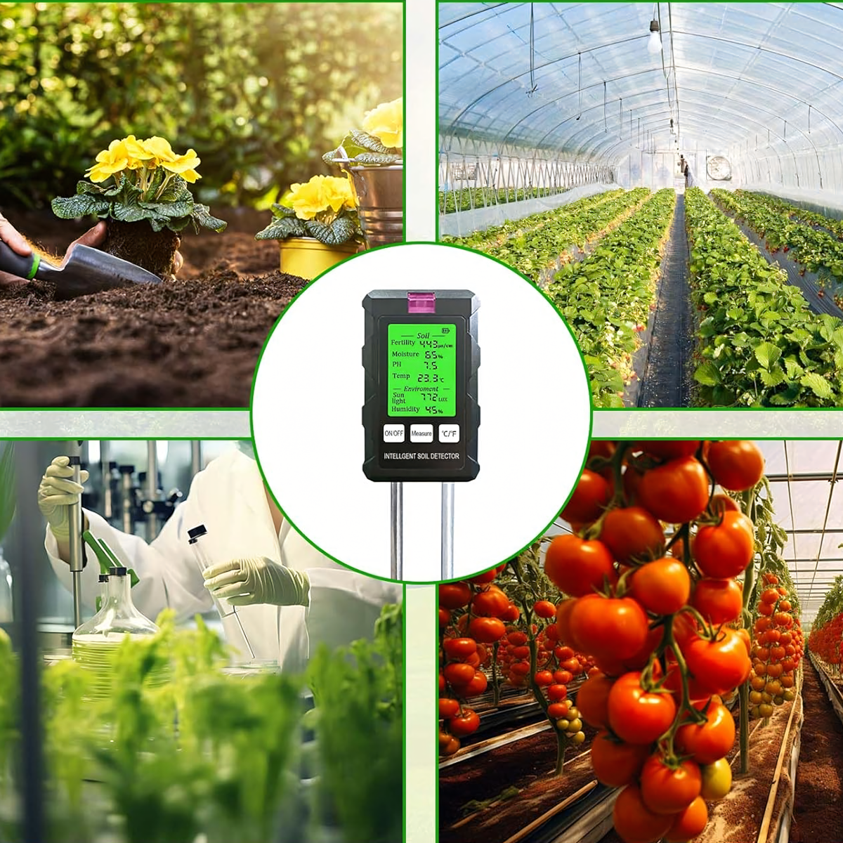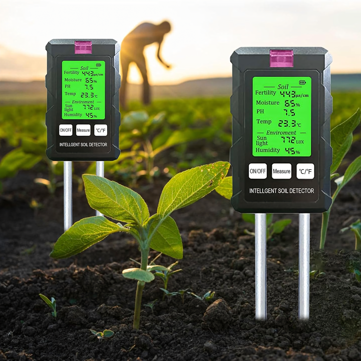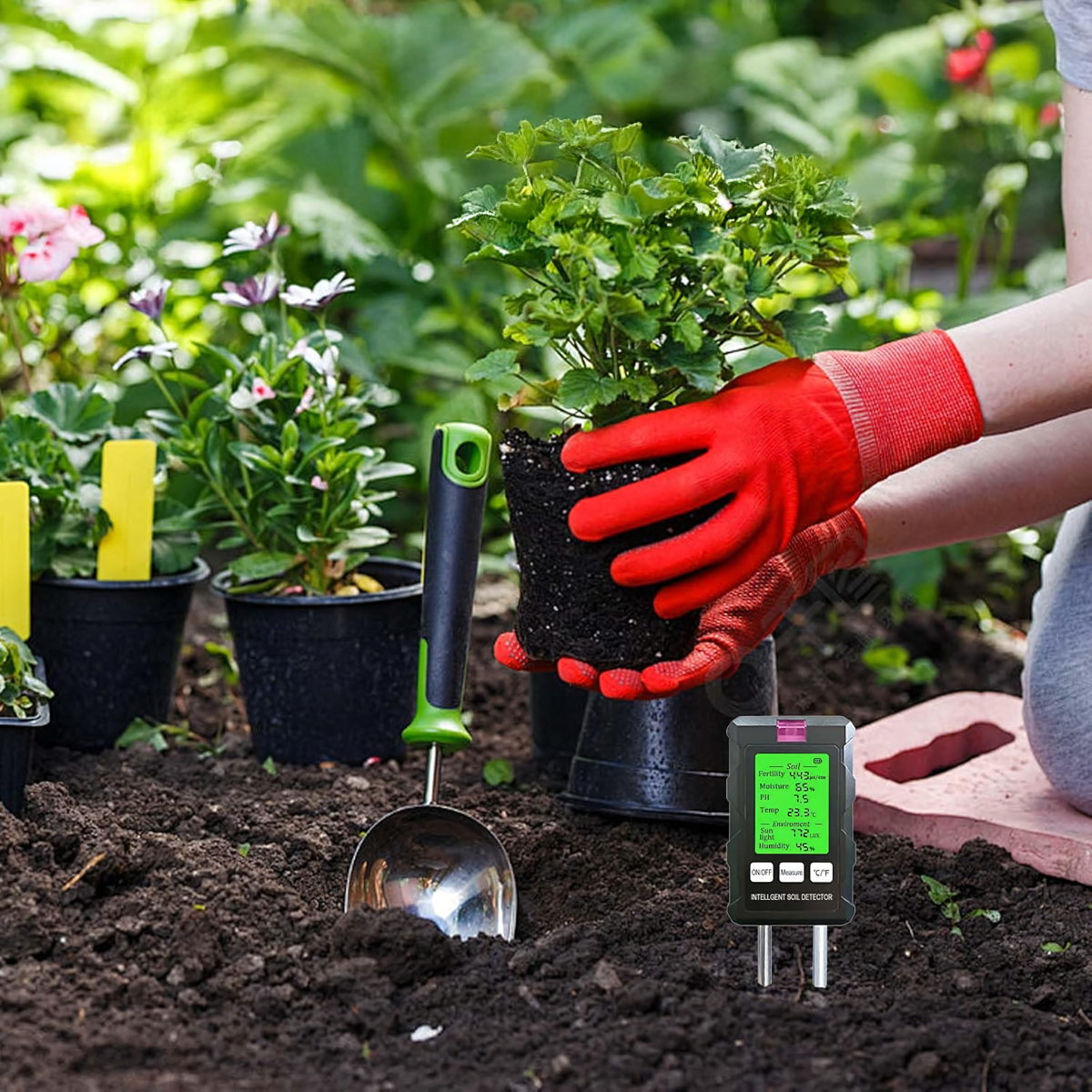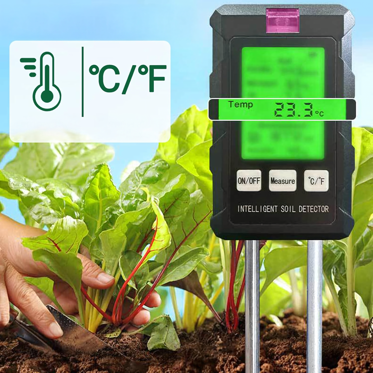 Mērījumu diapazons: pH, augsnes mitrums, augsnes temperatūra, auglība, gaisma, apkārtējās vides mitrums