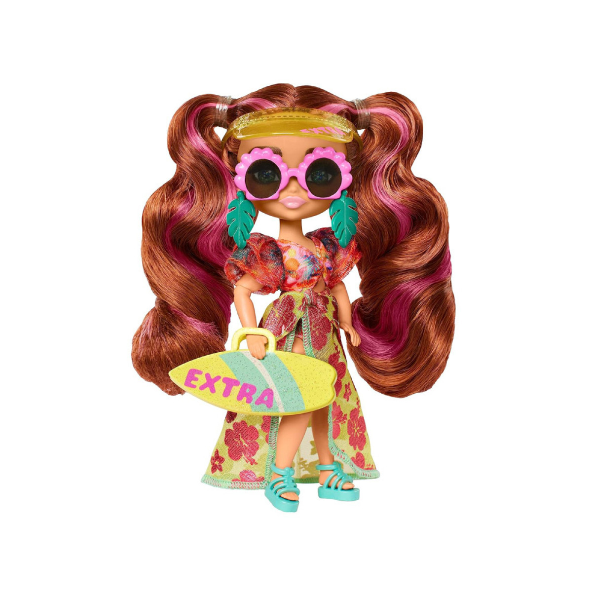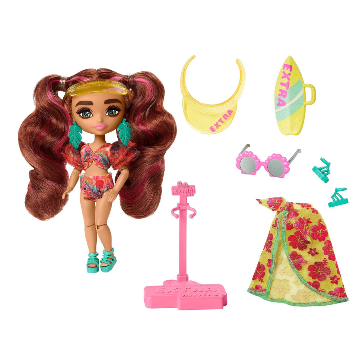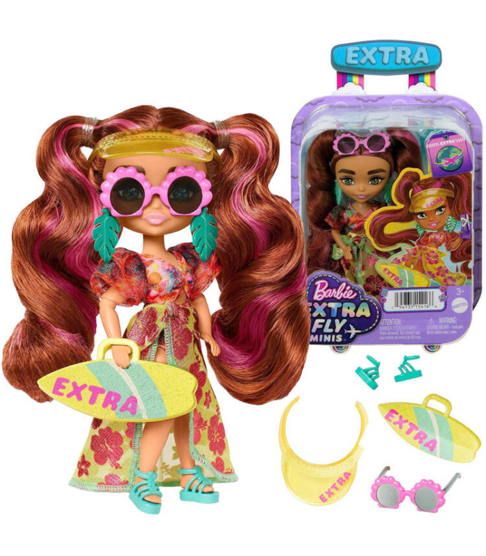 Lelle Barbie no Extra Fly Minis sērijas iepriecinās katru mazu modes cienītāju. Šīs sērijas lelles mīl ceļot ar stilu, pielāgojot savus fantastiskos tērpus ceļojuma galamērķim. Lellei ir gari viļņaini brūni mati ar rozā šķipsnām, tumša iedeguma āda, uz galvas saulesbrilles rozā gliemežvāku formā, stilīgs vasaras lakats un tropisks skaists peldkostīms, kājās zaļas sandales, un ausīs auskari zaļu palmu lapu formā. Pludmales stilam pievienota cepure ar nagu un soma sērfa dēļa formā. Viss komplekts ir ļoti burvīgs un noteikti iepriecinās katru meiteni, bet pievienotais statīvs lellei ļauj to uzstādīt dažādās pozās kolekcijā.