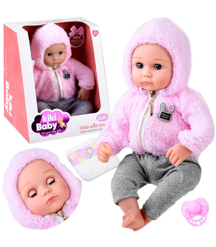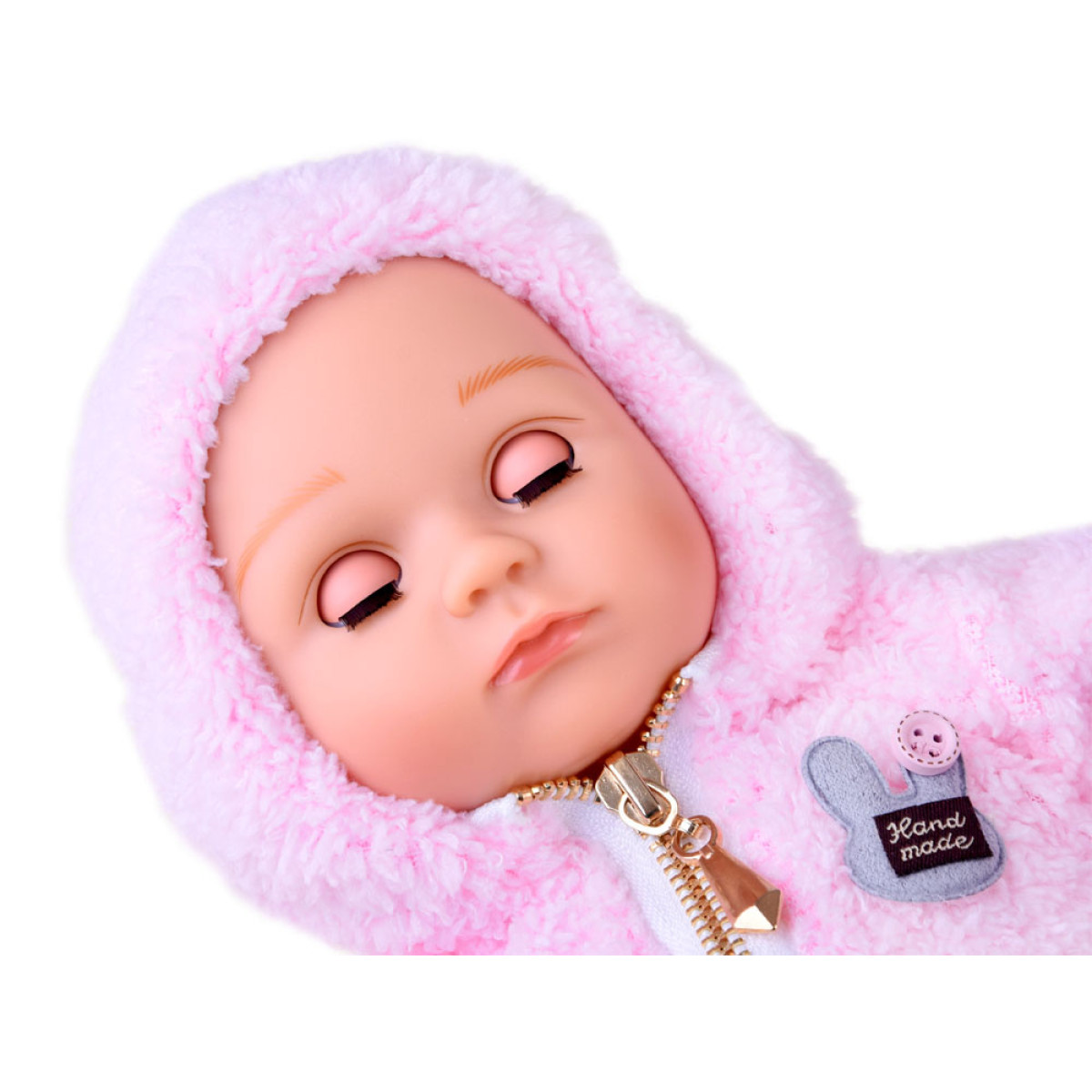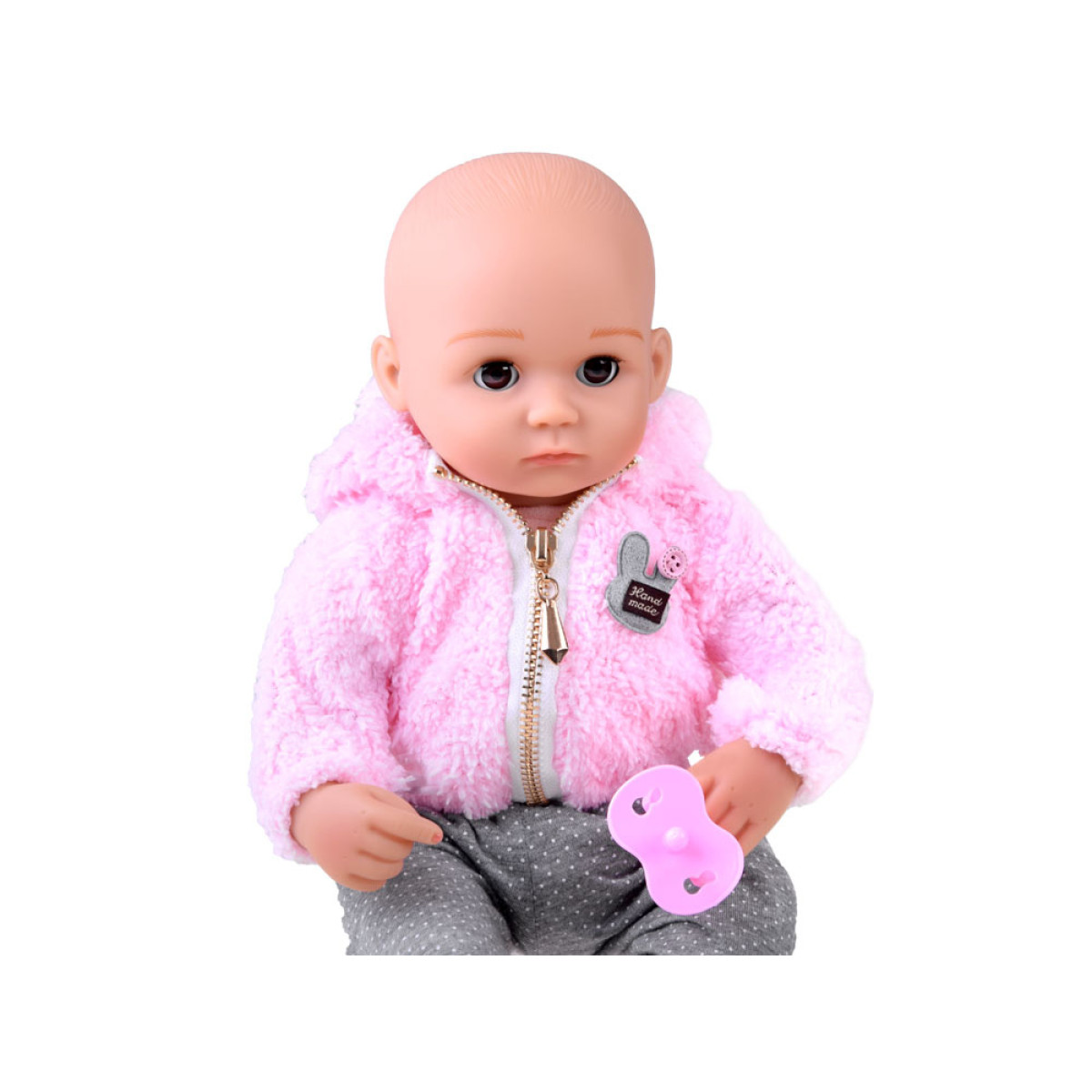 Lelle izskatās kā jaundzimušais. Priekšrocība: Tai ir mīksts auduma vēders, bet galva, rokas un kājas izgatavotas no cietas gumijas. Priekšrocība: Kad lelle tiek nolikta guļus, tās acis aizveras. Tāpat kā īsts zīdainis, tai nav matu uz galvas, bet no aukstuma to pasargā silta, patīkama rozā jaka ar kapuci. Komplektu papildina stilīgas pelēkas legingi ar punktiem. Priekšrocība: Komplektā iekļautā autiņbiksīte ļauj praktizēt mazuļa pārtīšanu.