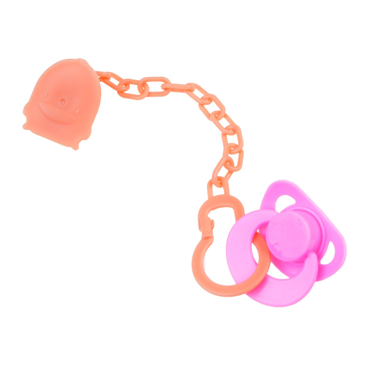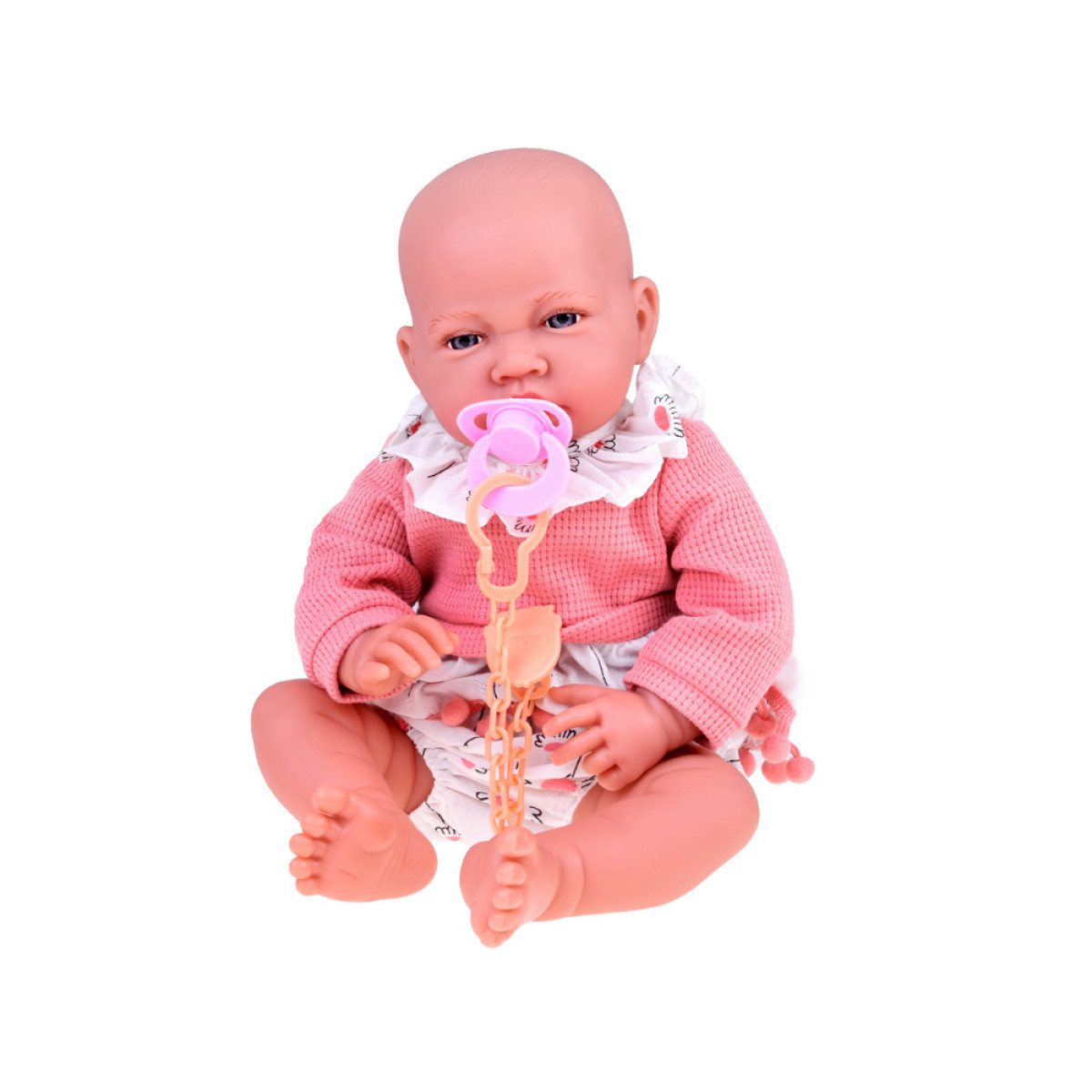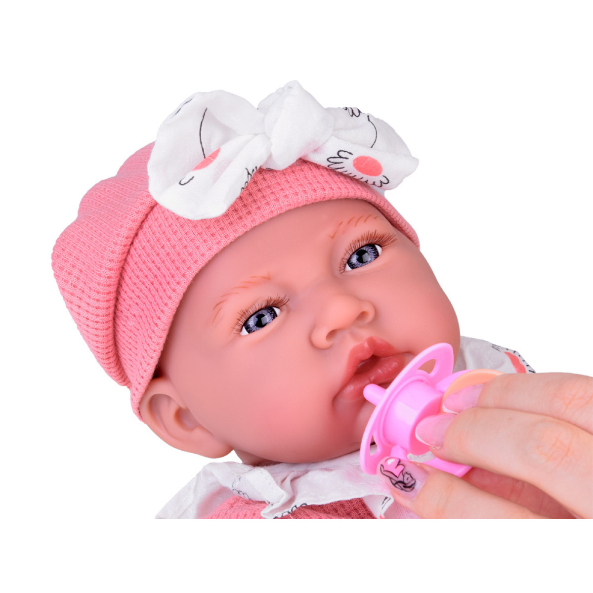 - Lellei ir piestiprināma rozā zīdaiņu knupīte, ko var ievietot viņas mutē.