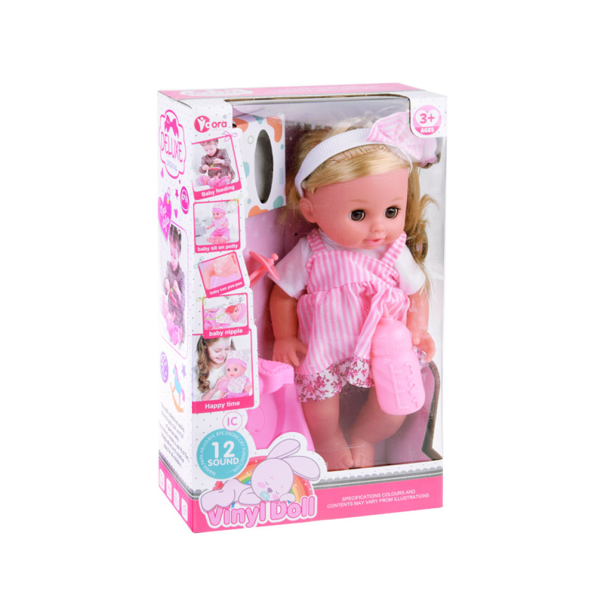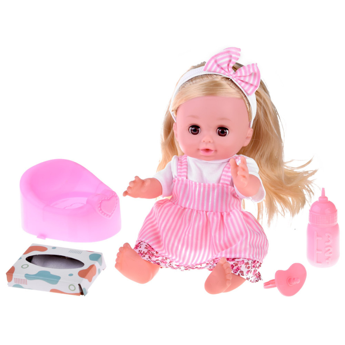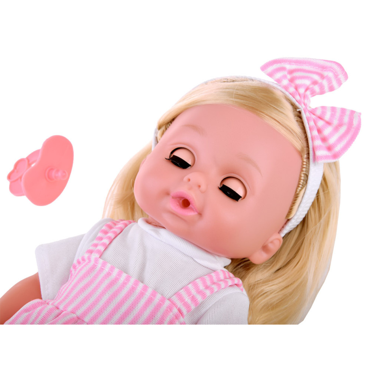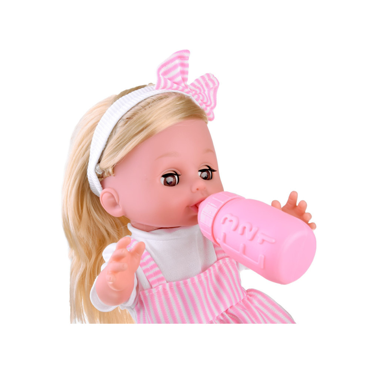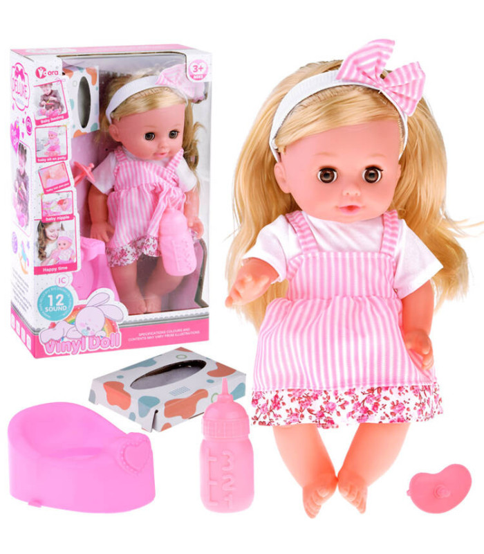 - Daudzpusīgas funkcijas: Lelle ir aprīkota ar skaņas funkcijām, kas aktivizējas, nospiežot pogu uz vēdera, un tai ir spēja dzert un čurāt.