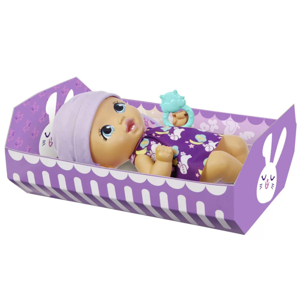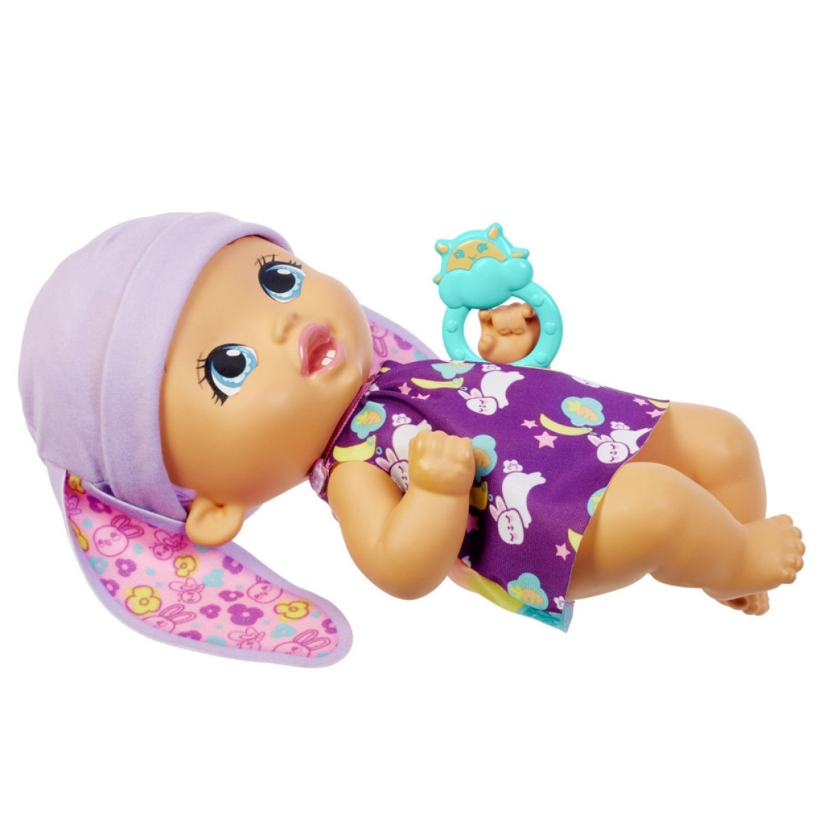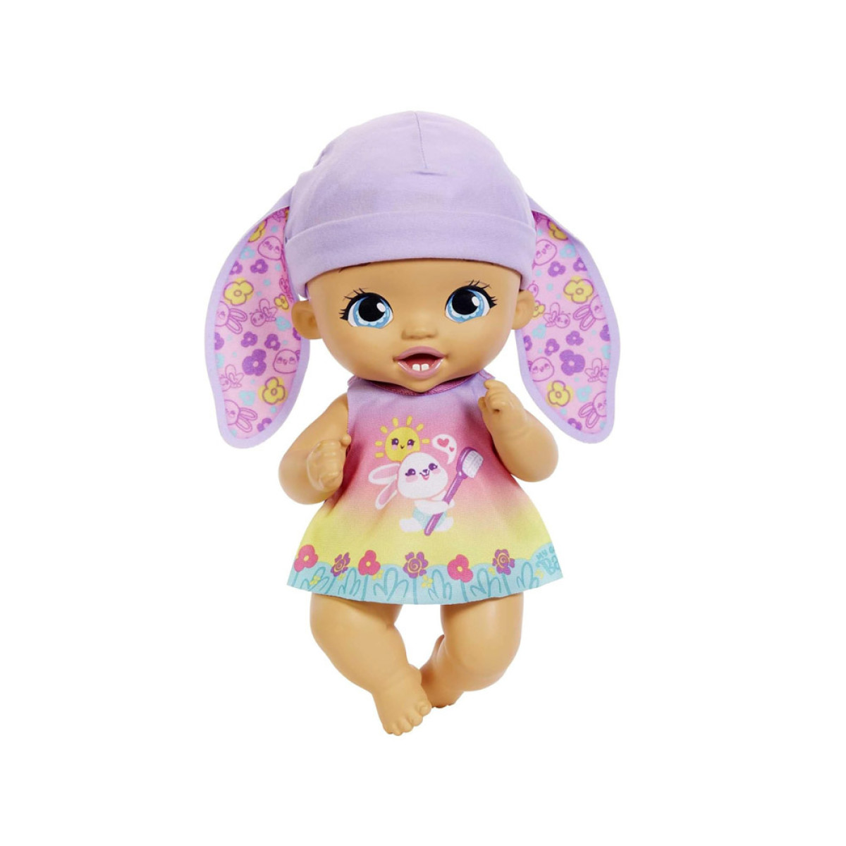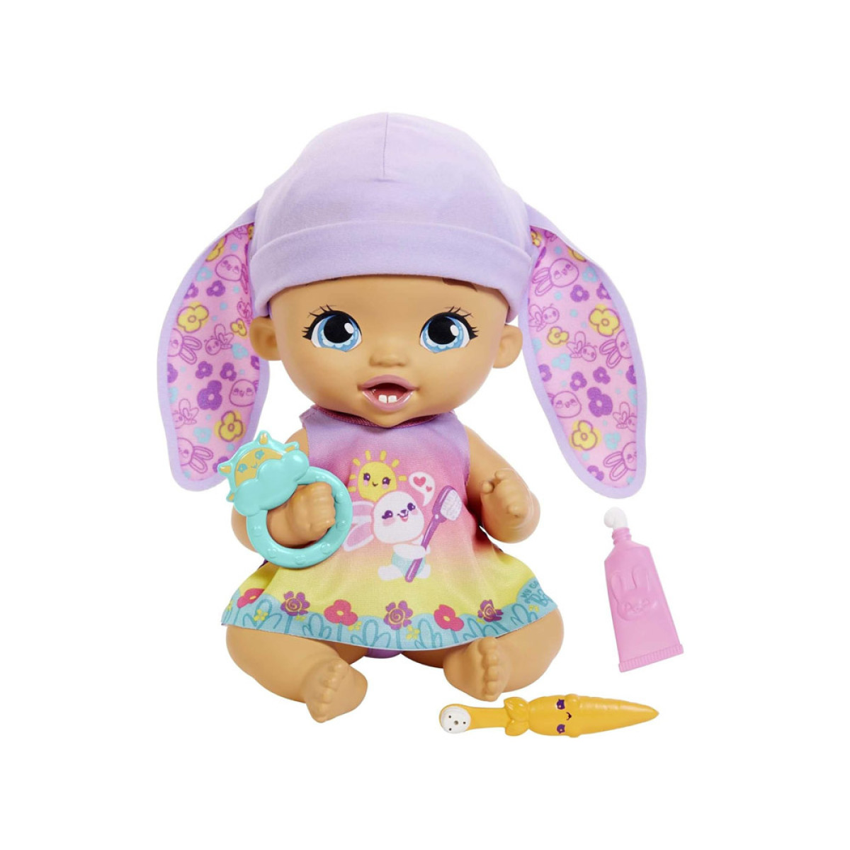 Bērns ir izgatavots no plastmasas. Uzmanību pievērš tās lielās, zilas acis un mīļās lūpiņas. Īsu, violetu frizūru rotā cepurīte ar truša ausīm. Mūsu mazulis ir ģērbts jaukā kleitiņā ar truša grafiku, kurā ir zobu birste ziedu vidū. Apģērbu var noņemt un nomainīt uz nakts versiju gulēšanai. Apģērbs mainās uz tumšu kleitu ar guļošu mazu trušu grafiku. Komplektā ietilpst piederumi, kas nepieciešami bērna kopšanai.