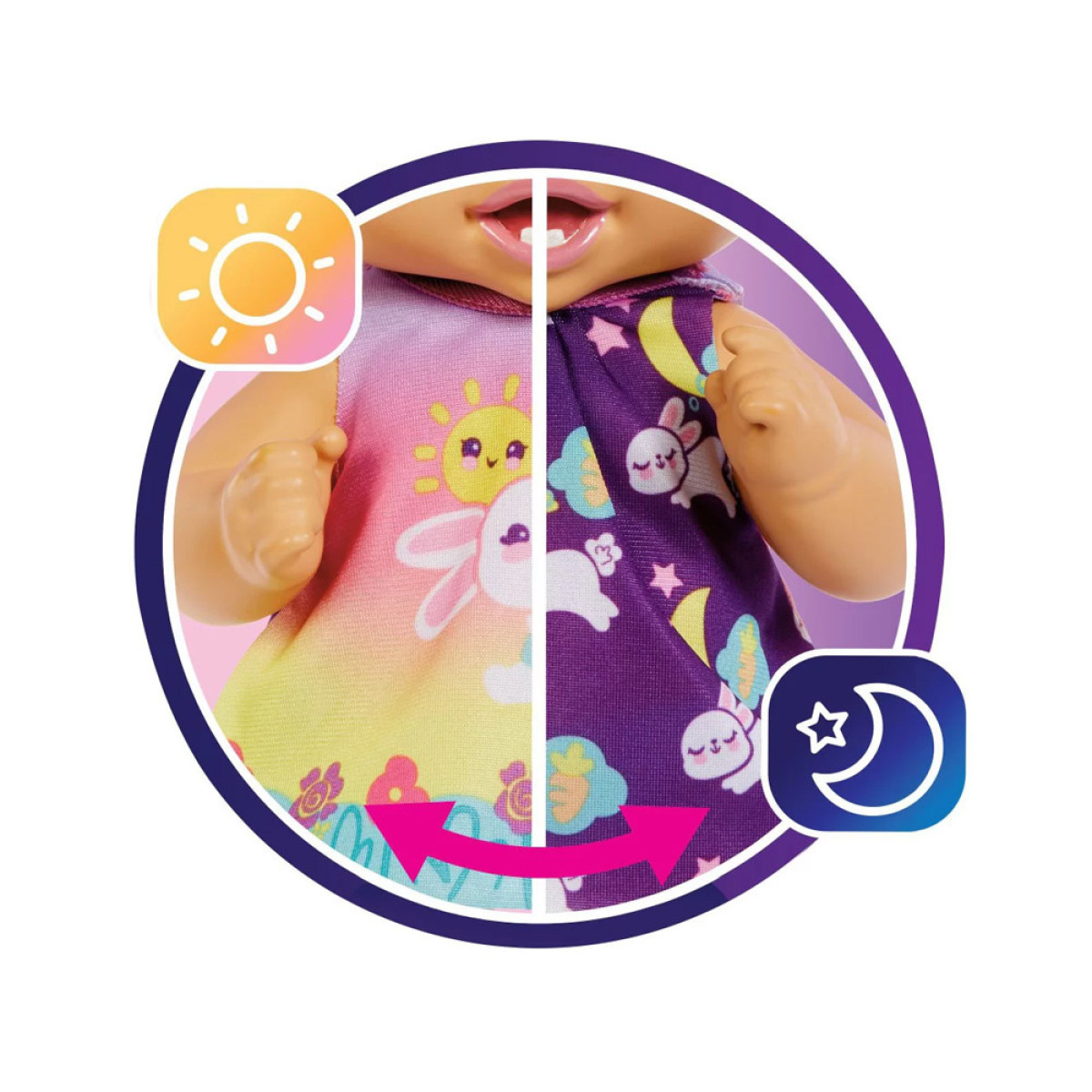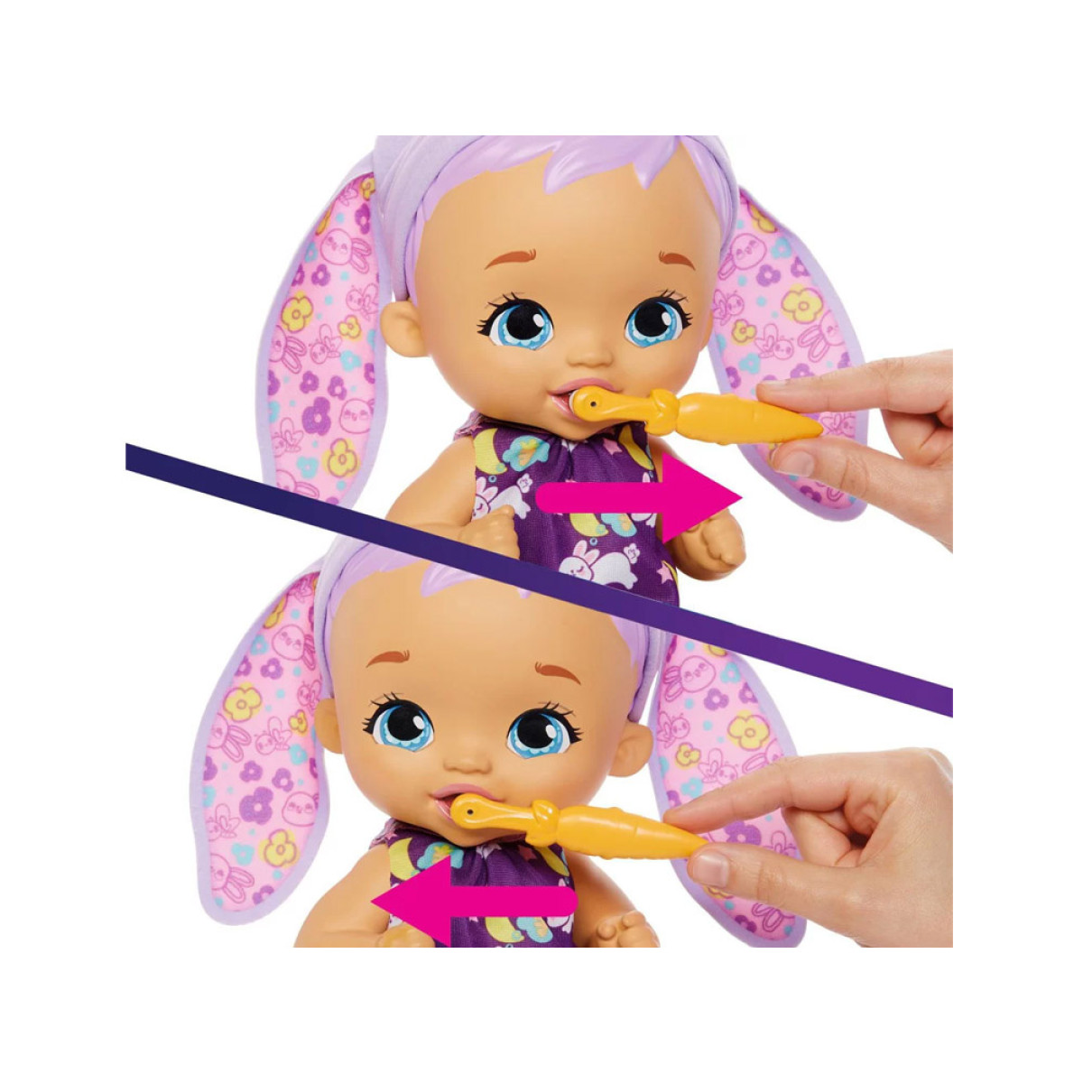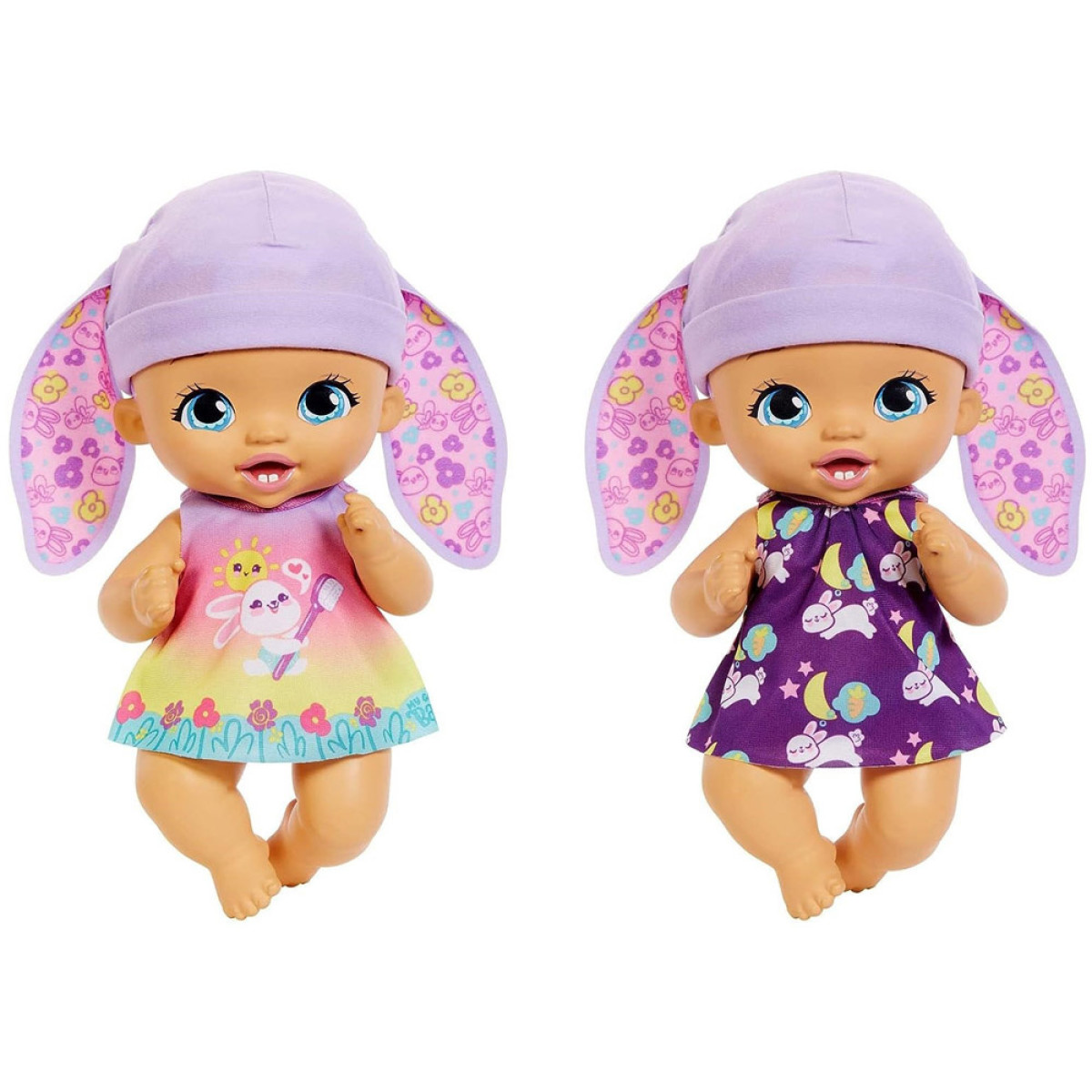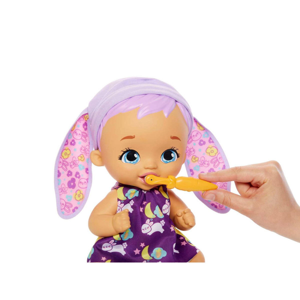 Bērns ir izgatavots no plastmasas. Uzmanību pievērš tās lielās, zilas acis un mīļās lūpiņas. Īsu, violetu frizūru rotā cepurīte ar truša ausīm. Mūsu mazulis ir ģērbts jaukā kleitiņā ar truša grafiku, kurā ir zobu birste ziedu vidū. Apģērbu var noņemt un nomainīt uz nakts versiju gulēšanai. Apģērbs mainās uz tumšu kleitu ar guļošu mazu trušu grafiku. Komplektā ietilpst piederumi, kas nepieciešami bērna kopšanai.