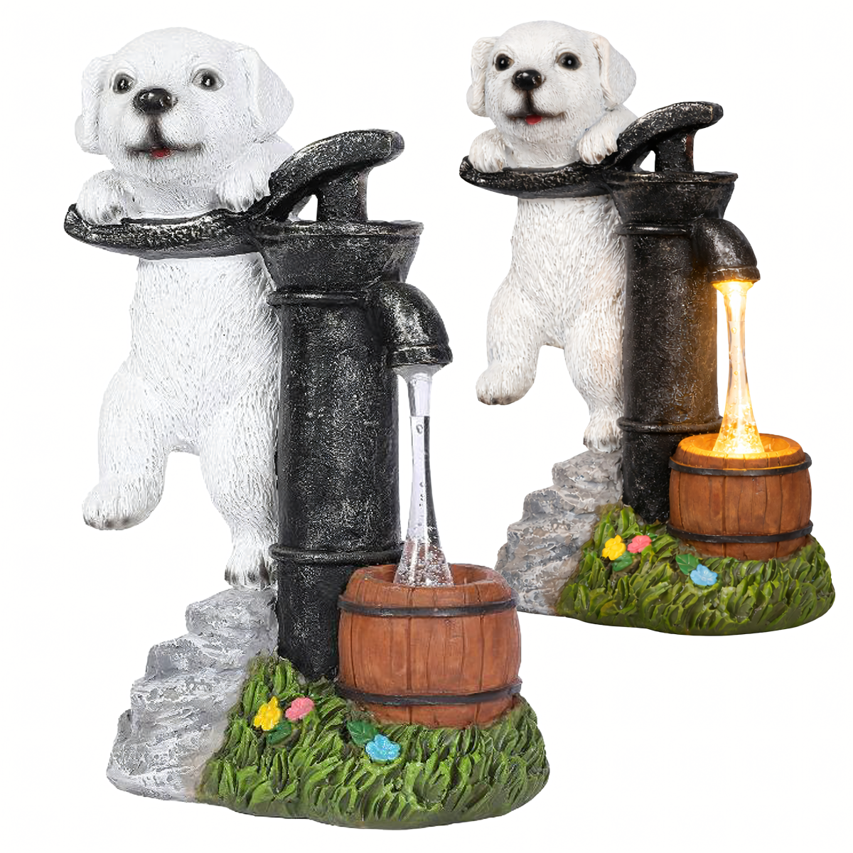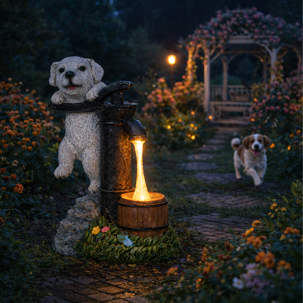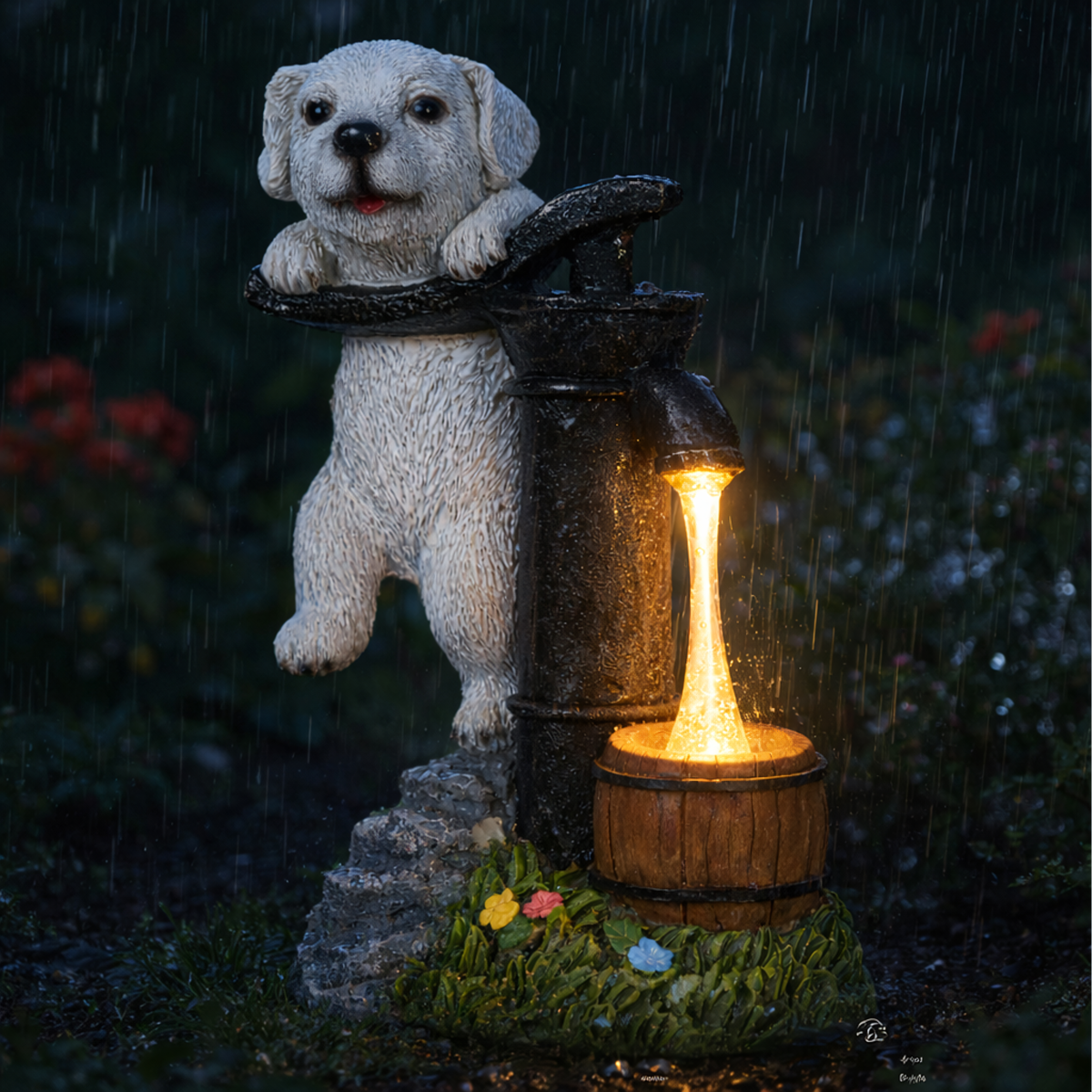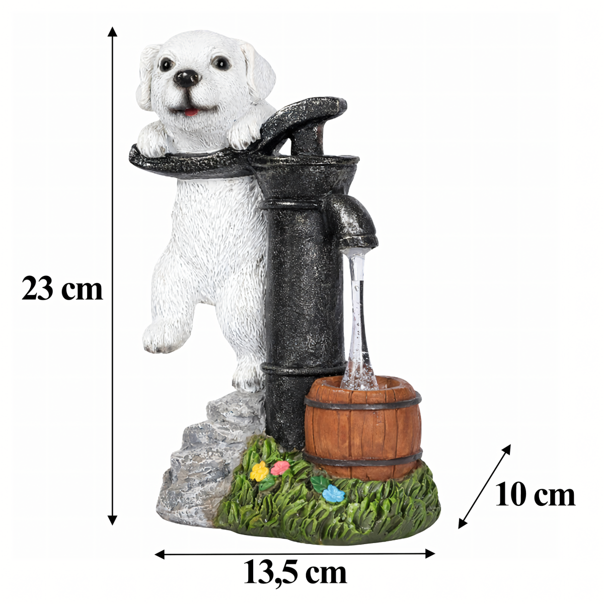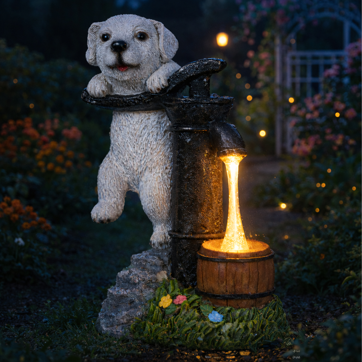 - Dekoratīvs dizains: Piesaista uzmanību un papildina dārza estētiku ar kucēna figūru.