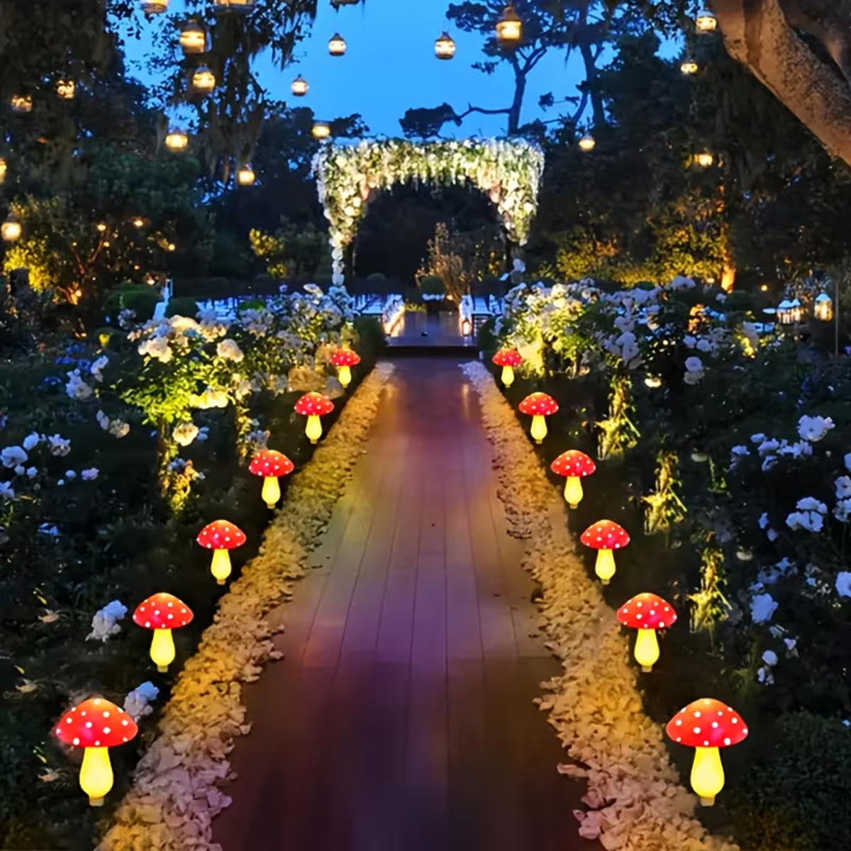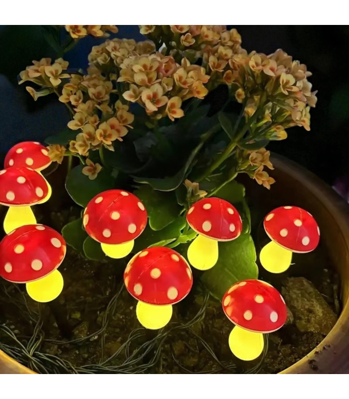 Saules dārza lampas ar sēņu formas LED gaismām. Garums 5,5m, komplektā 8 gab.