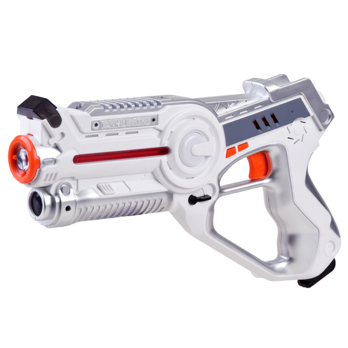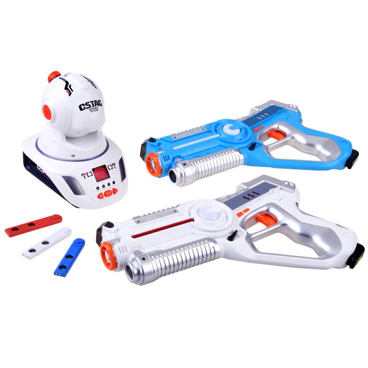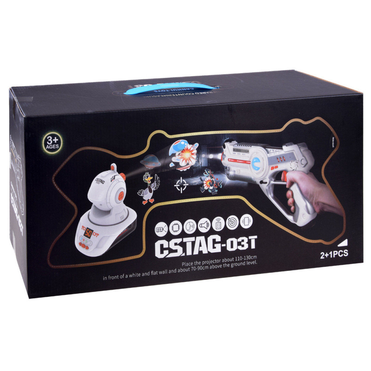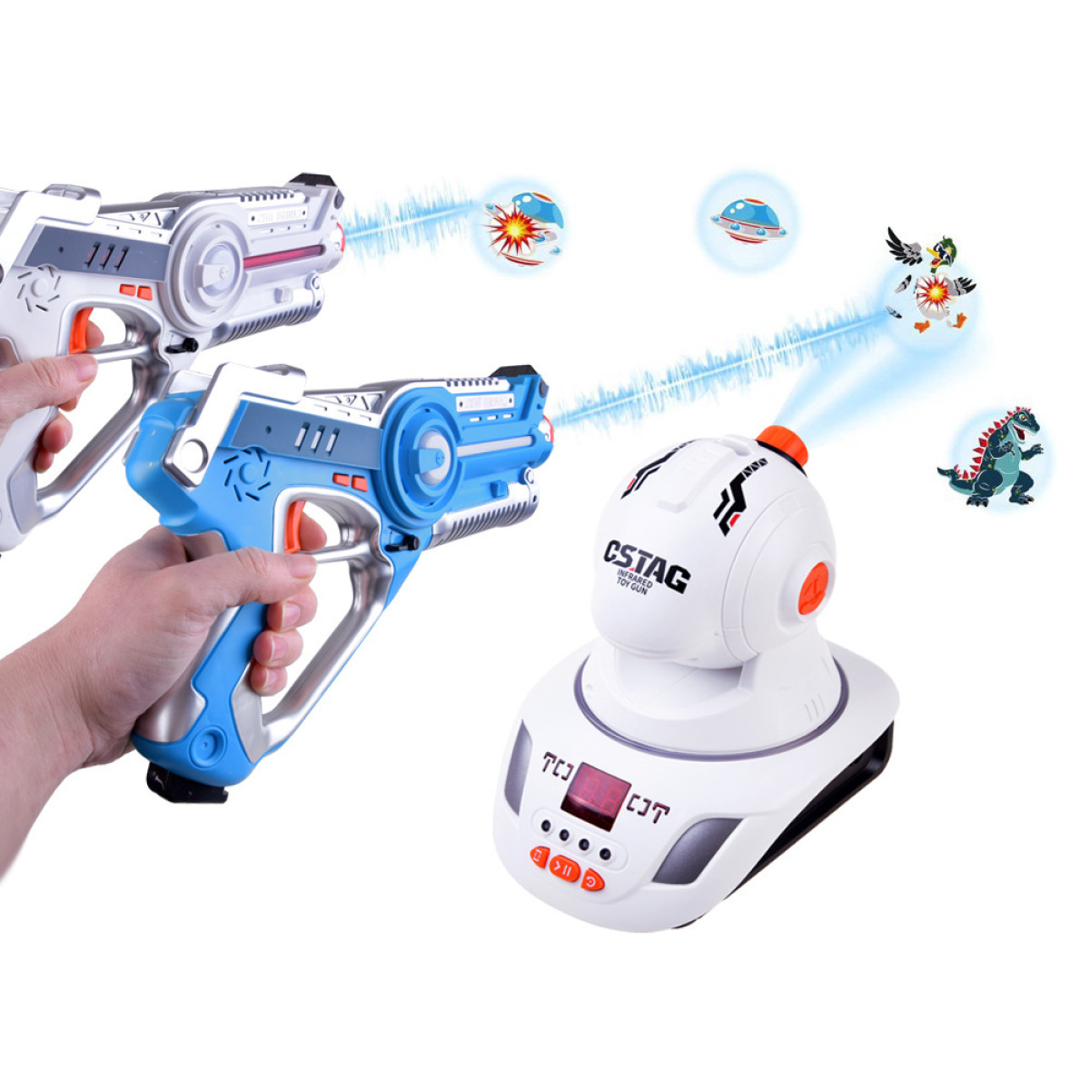 Divas lāzeru pistoles ar projektoru, kas projicē lidojošus mērķus, ir rotaļlieta, kas sniegs daudz emociju un nodrošinās izklaidi uz ilgu laiku. Mūsdienīgas infrasarkanās lāzeru pistoles aizvedīs spēli uz pavisam jaunu līmeni. Tā ir lieliska ideja bērniem, kuriem patīk mūsdienu tehnoloģijas, šaušanas spēlēm. Spēles laikā bērns trenē precizitāti, refleksus un koncentrēšanos. Pistoles neprasa munīciju - šāviņi ir aizstāti ar kodētu infrasarkano staru signālu, ko parasti sauc par lāzeru. Gaismas un skaņas efekti rotaļlietā palielina emocijas un motivēs spēlētājus vēl vairāk. Ar rotaļlietu var spēlēties vienatnē vai kopā ar draugiem. Visi elementi ir rūpīgi izgatavoti no augstas kvalitātes plastmasas.