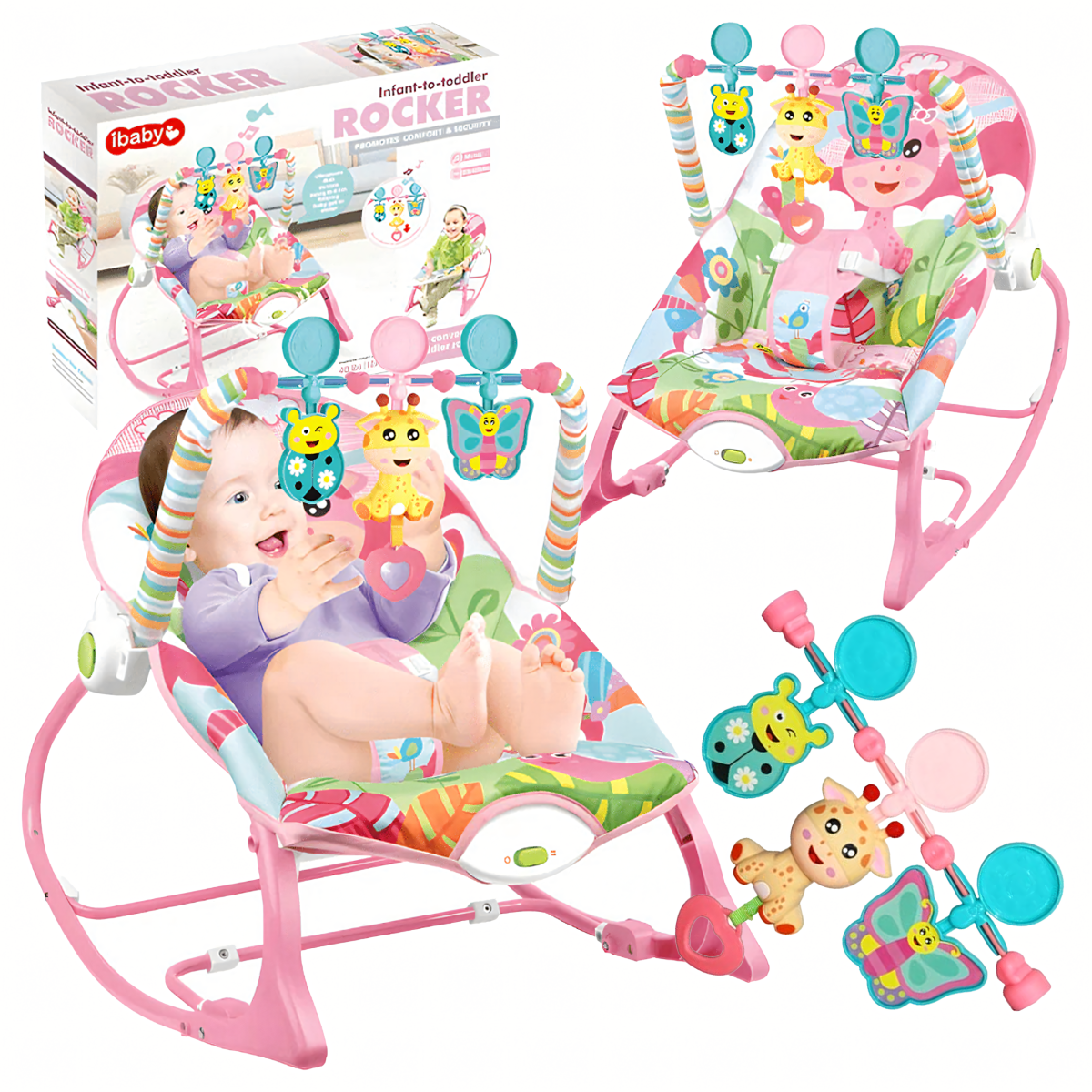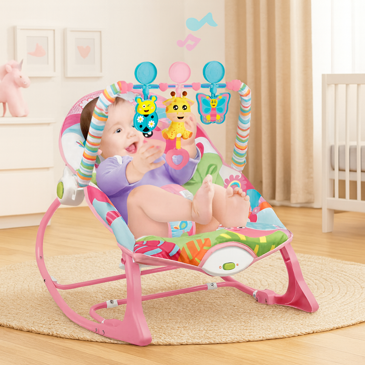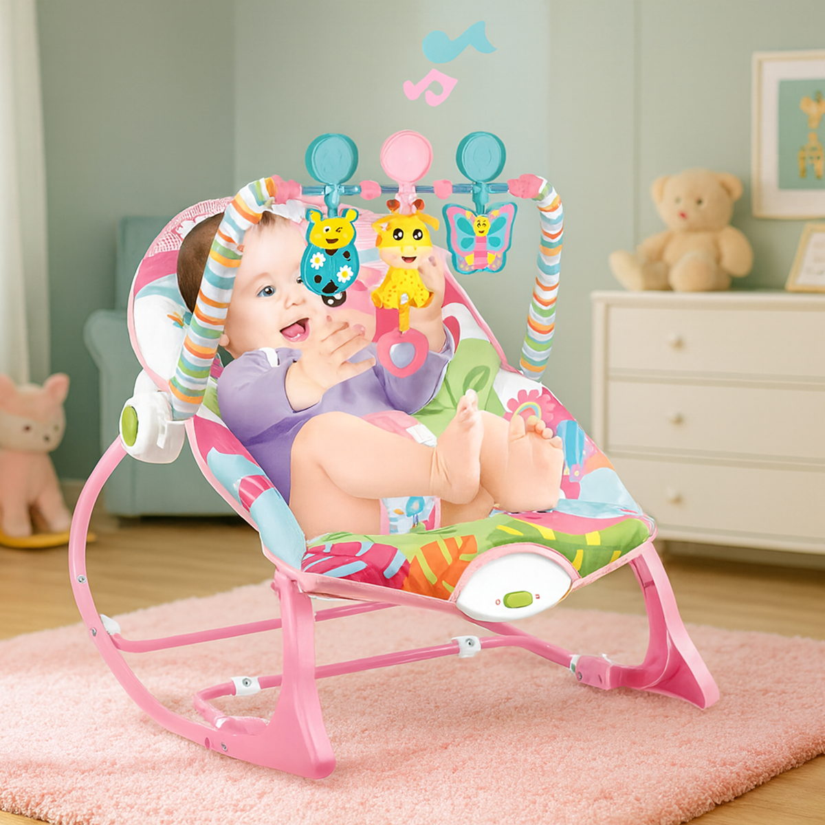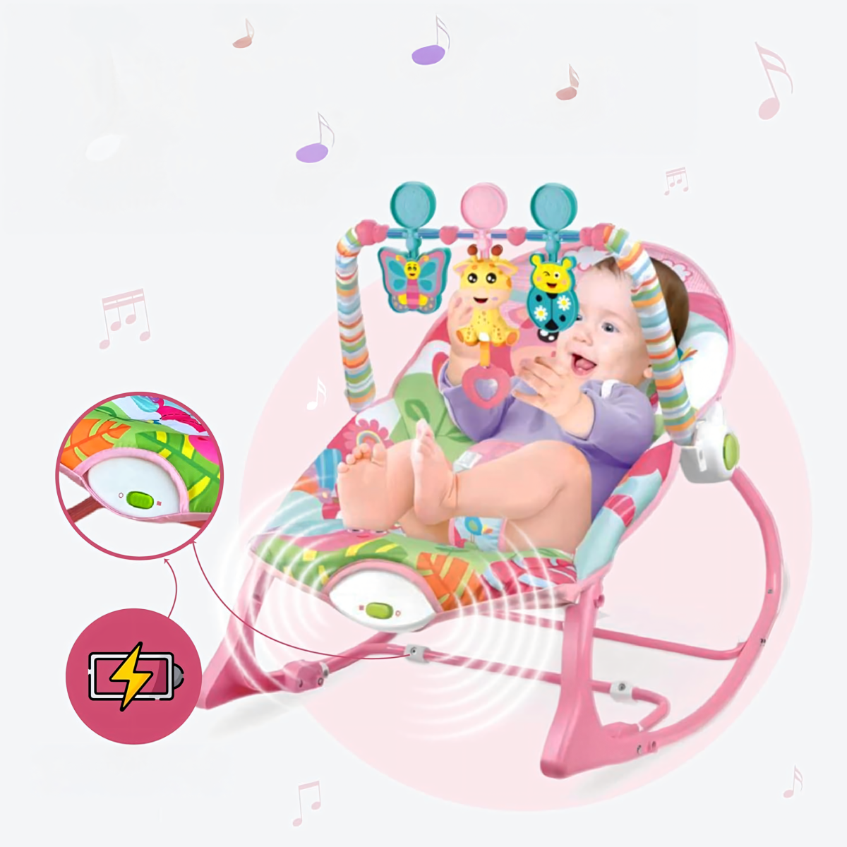 Bērnu šūpuļkrēsls ar vibrācijām un mūziku ir ideāla komforta, izklaides un drošības kombinācija jūsu mazulim. Maigas vibrācijas, nomierinoša mūzika un krāsaini grabulīši palīdzēs bērnam nomierināties, aizmigt vai jautri spēlēties. Ērts, regulējams atzveltne un mīksts sēdeklis nodrošina komfortu no pirmajām dzīves dienām līdz 18 kg.