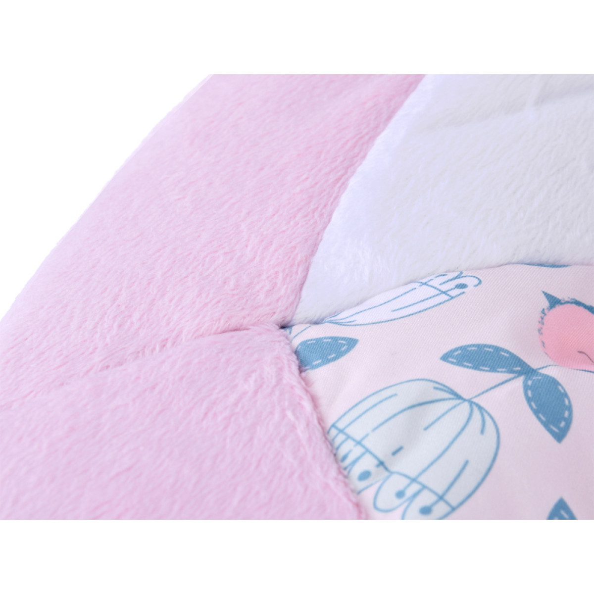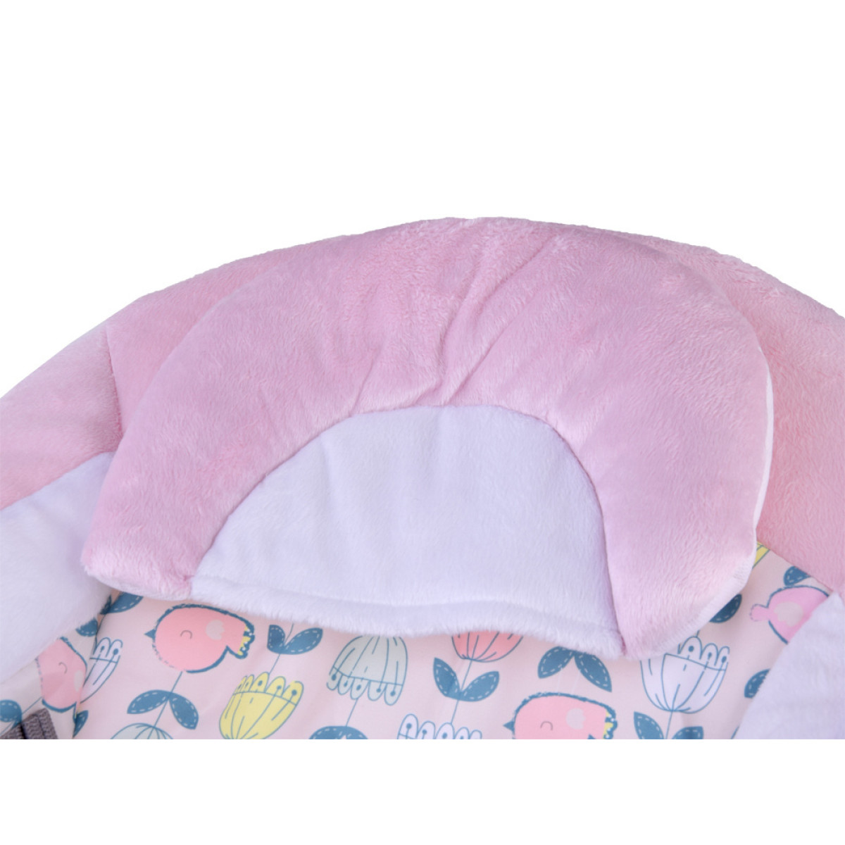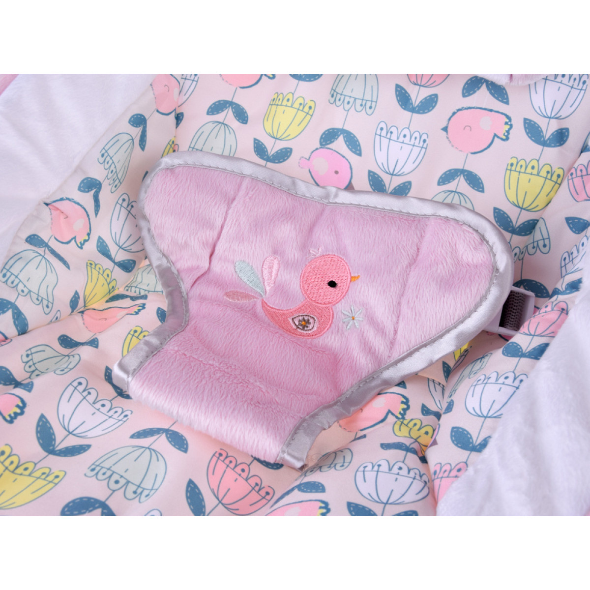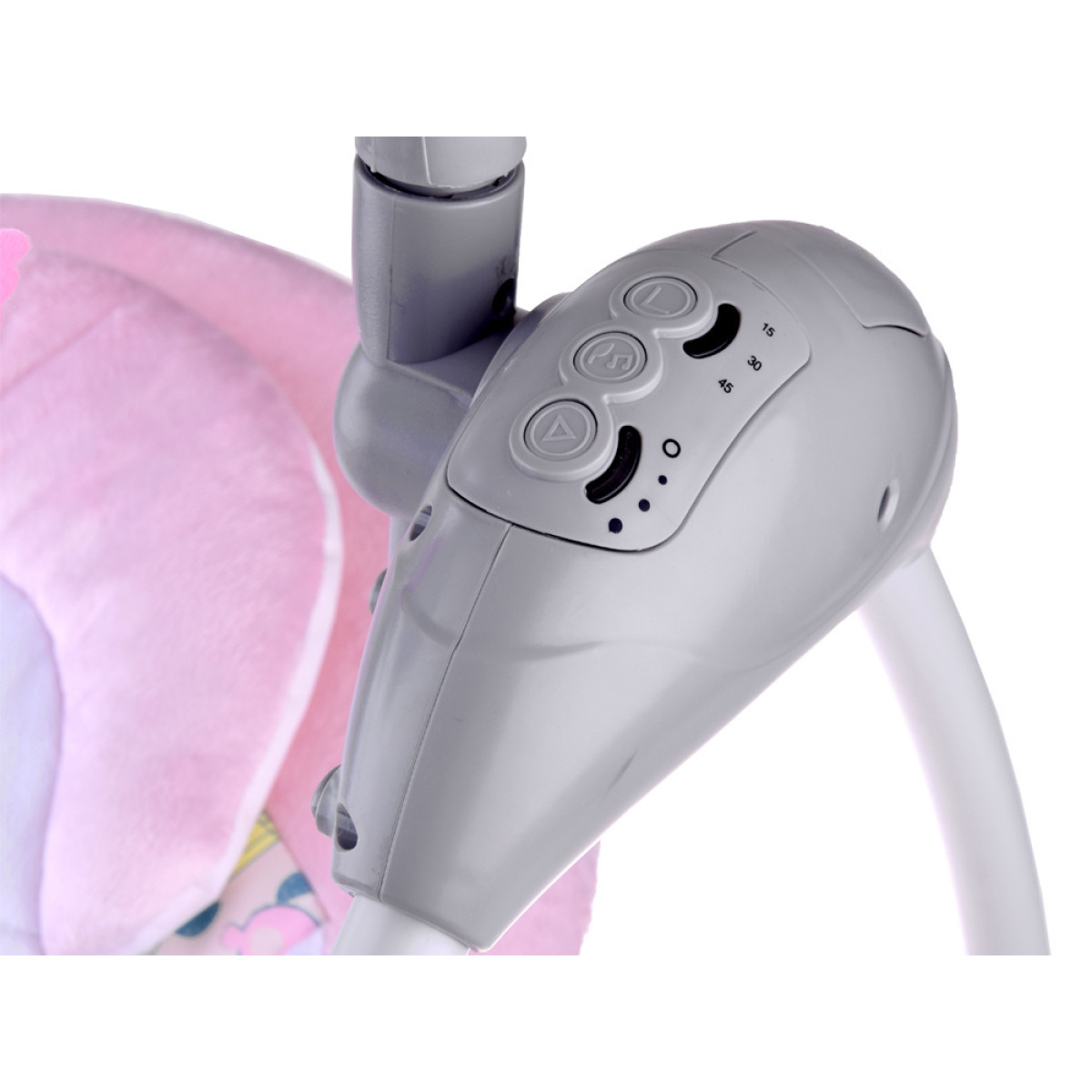 Bērna drošību nodrošina drošības jostas ar regulēšanas iespējām. Mīksts un ērts sēdeklis ar noņemamu plīša spilventiņu garantē komfortu. Apvilkumu ir viegli noņemt un tīrīt, kas ir īpaši svarīgi zīdaiņiem. Virs šūpuļkrēsla karājas trīs jaukas plīša rotaļlietas, kas piesaista bērna uzmanību un veicina smalko motoriku. Šūpuļkrēslu var bloķēt, lai tas kalpotu tikai kā sēdeklis. Metāla caurules nodrošina konstrukcijas stabilitāti. Šūpuļkrēsls ir pieejams neitrālā, pelēkrozā krāsā, tāpēc tas iederēsies jebkurā bērnu istabā.