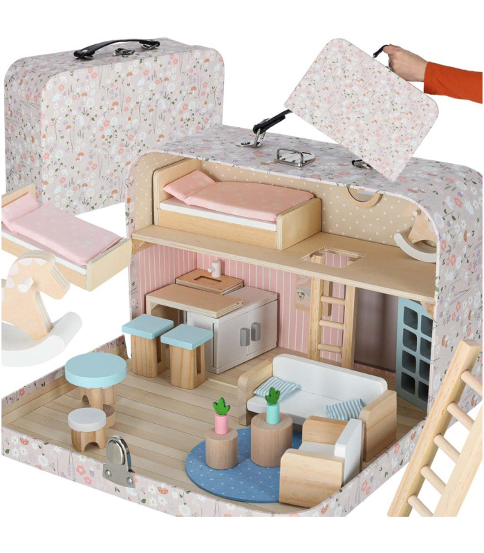 Miniatūra māja lellēm koferī, kas ietver koka mēbeles un auduma detaļas, ir ideāla rotaļlietu kolekcija bērniem. Kofera lelles mājas priekšrocības: