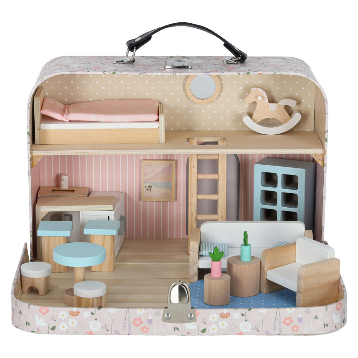 - Piemērota mazām lellēm un figūriņām – komplektā iekļautas 25 mēbeles, kas ļauj brīvi iekārtot māju koferī.