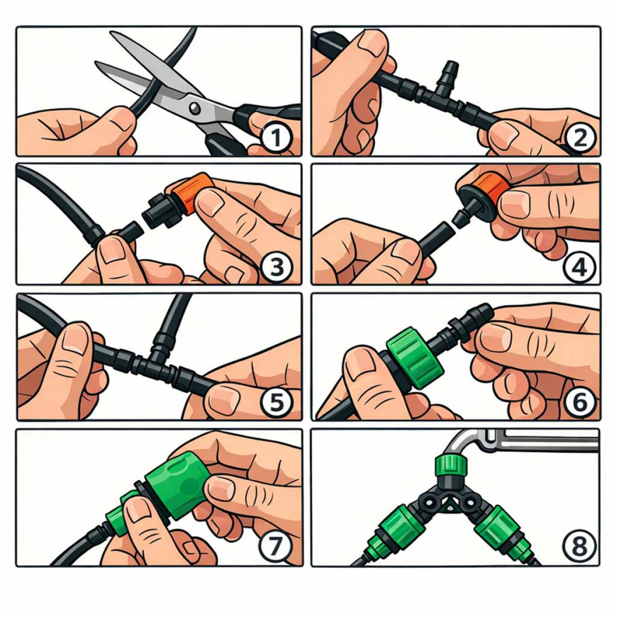 - Vienkārša pieslēgšana - komplekts aprīkots ar smidzinātāju sprauslām, kas ļauj ātri pieslēgties ūdens avotam un nekavējoties sākt laistīšanu bez sarežģītas montāžas