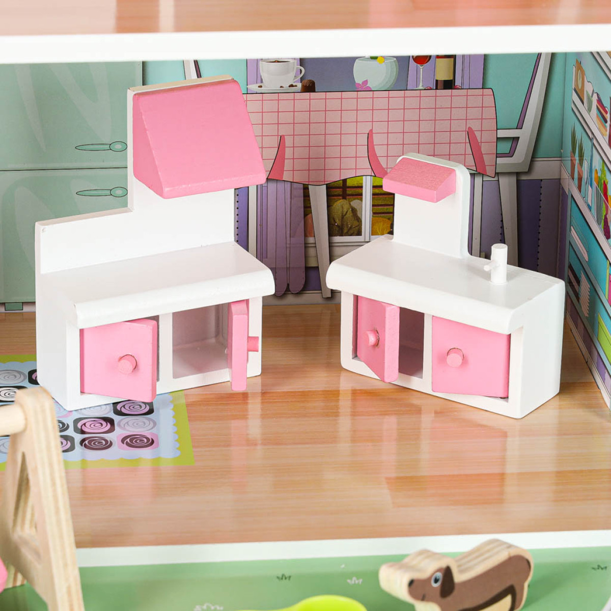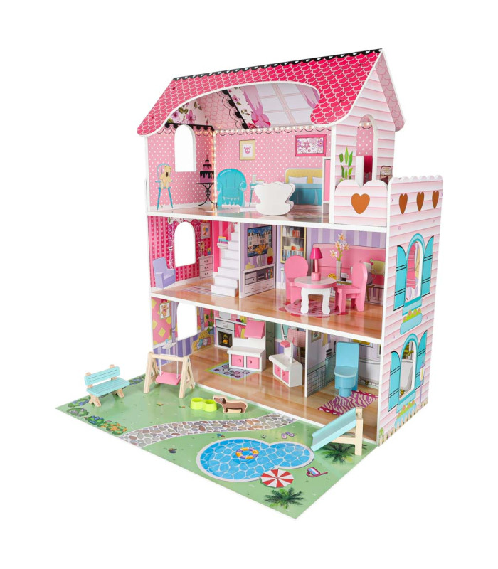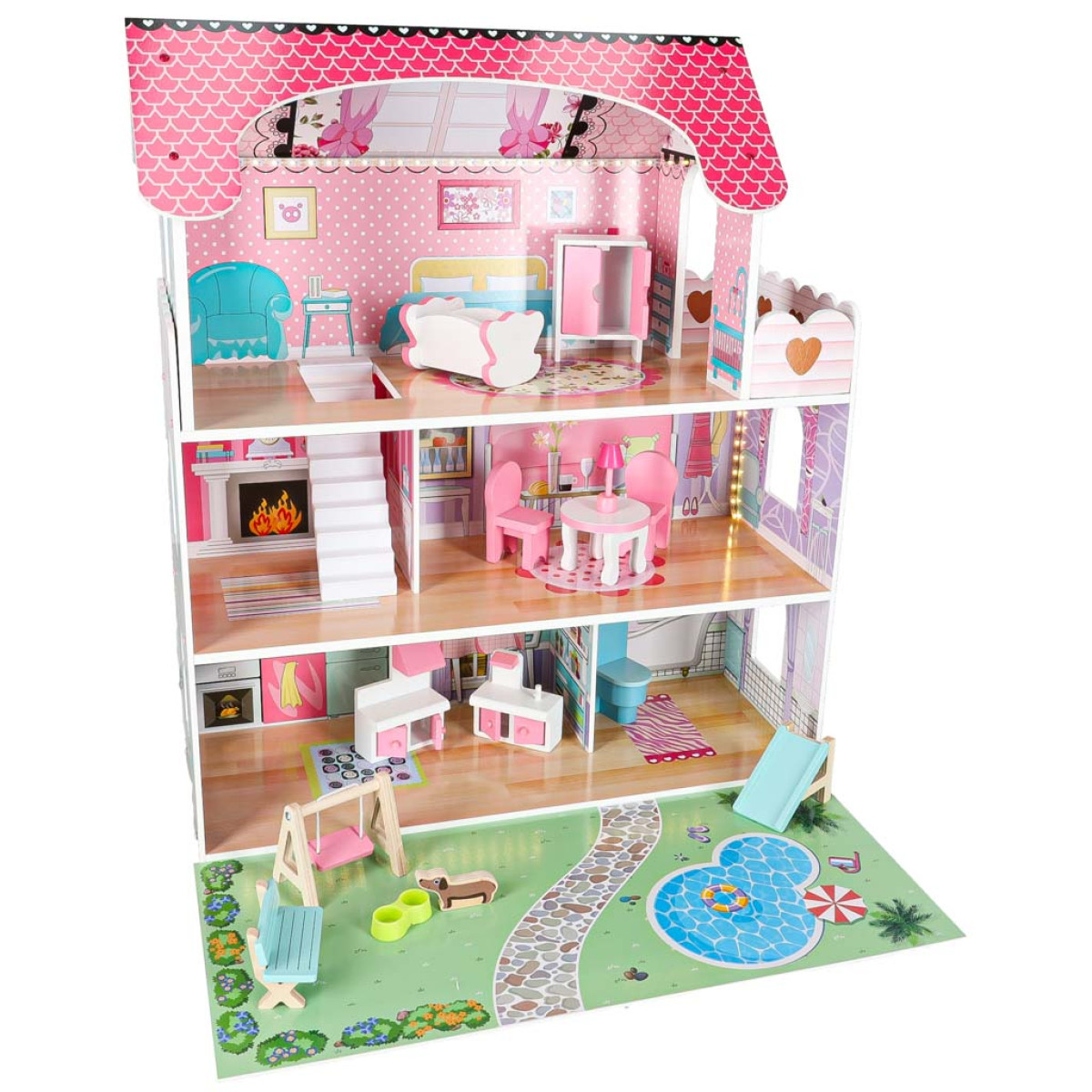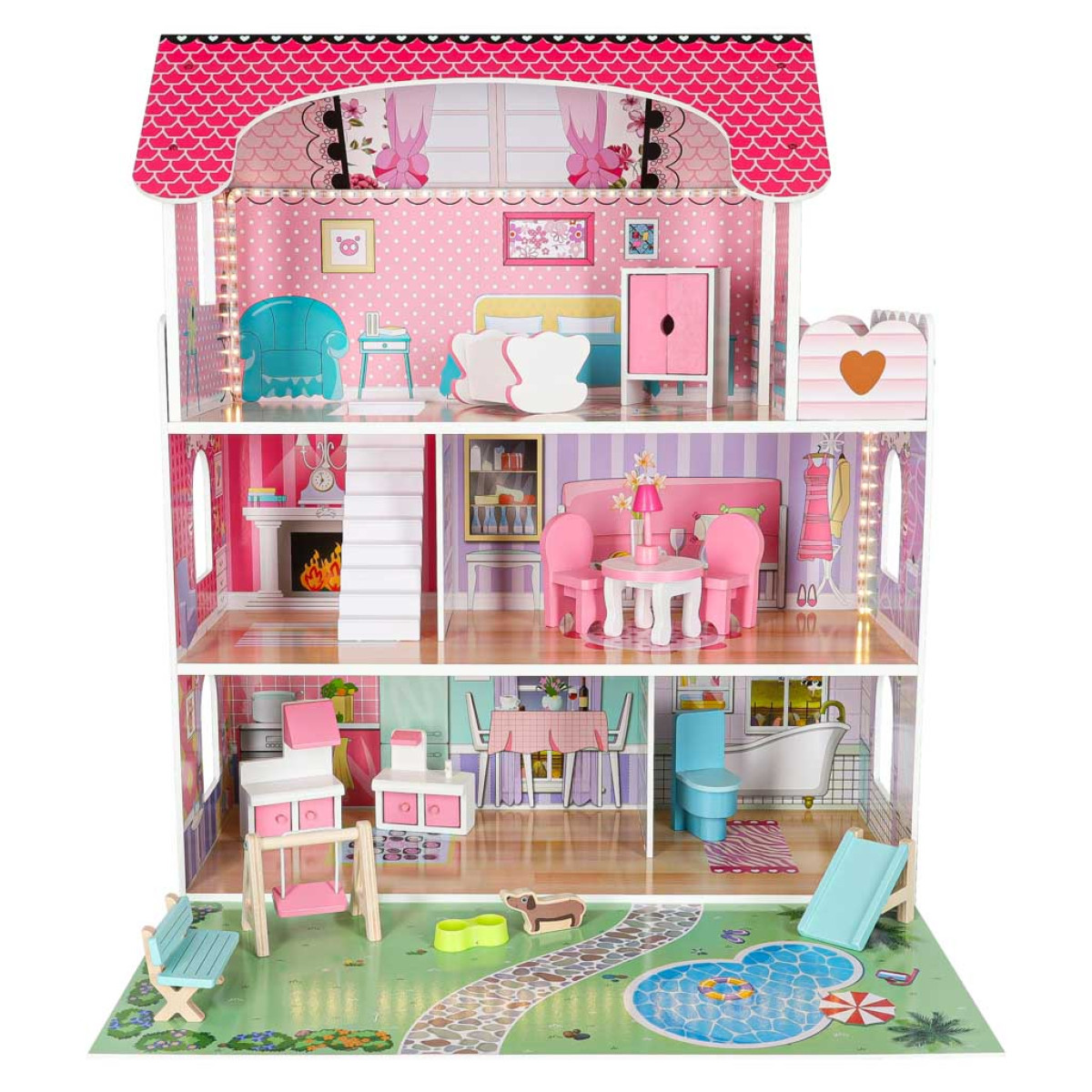 Drewniany domek dla lalek z ogrodem i oświetleniem LED