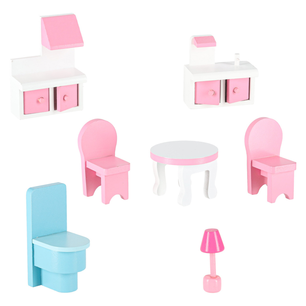 - Mebelki – stół, 2 krzesła, huśtawka, toaleta, zjeżdżalnia, ławka, łóżeczko dziecięce, lampa, miska dla psa, szafa, kuchenka, zlew