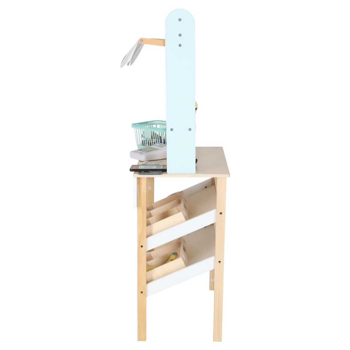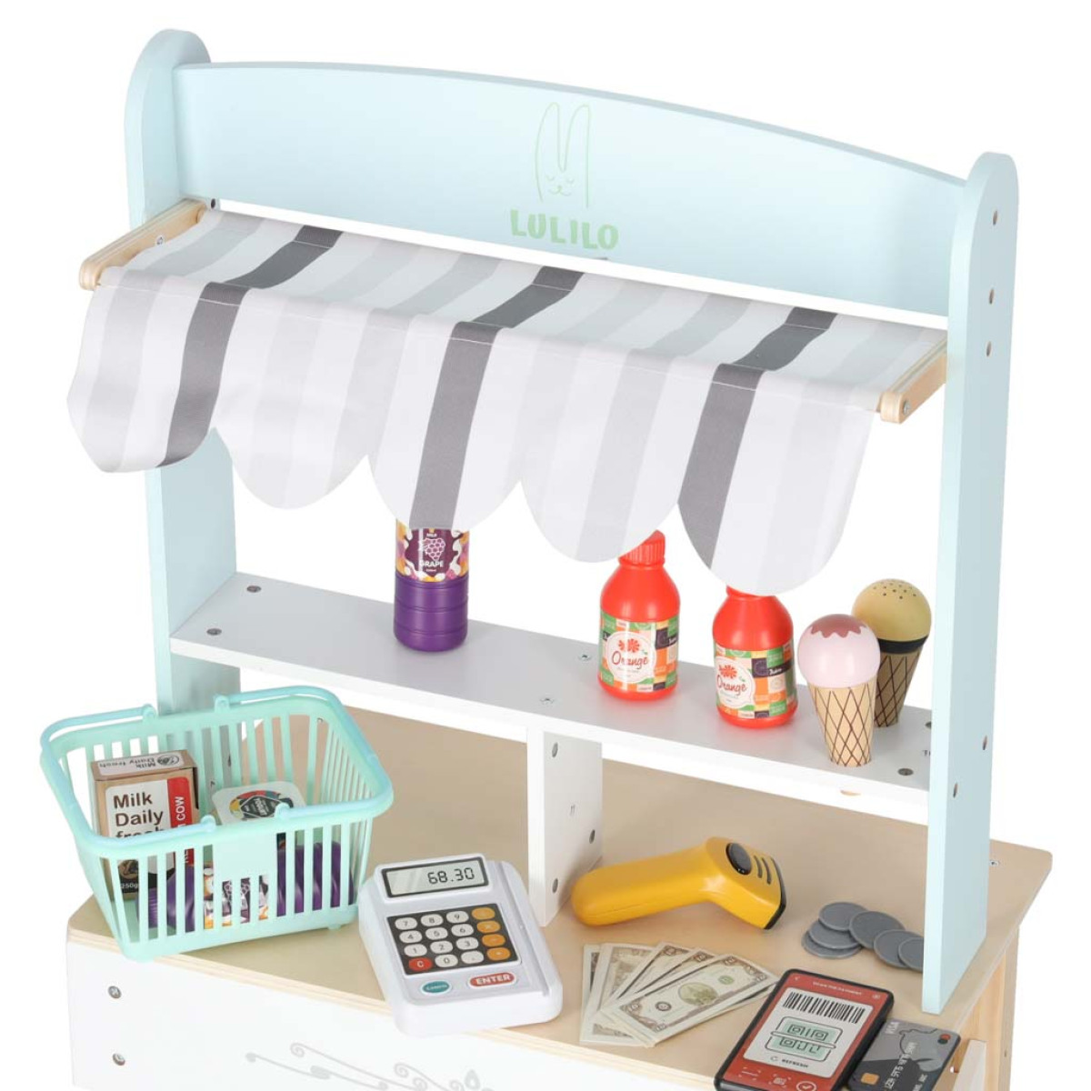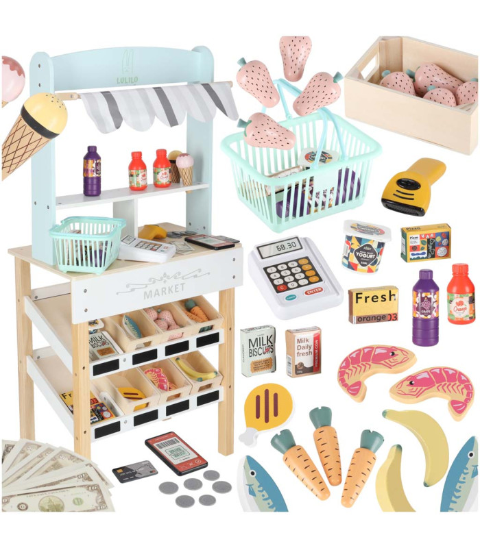 Bērns var iegādāties pārtikas produktus ar dažādām formām un faktūrām un pēc tam summēt pirkumu saturu pie kases. Var norēķināties ar karti vai skaidru naudu, kā arī skenēt lietotni telefonā. Spēlēšanās veikalā attīsta sociālās prasmes un nodrošina telpu skaitīšanas apguvei.