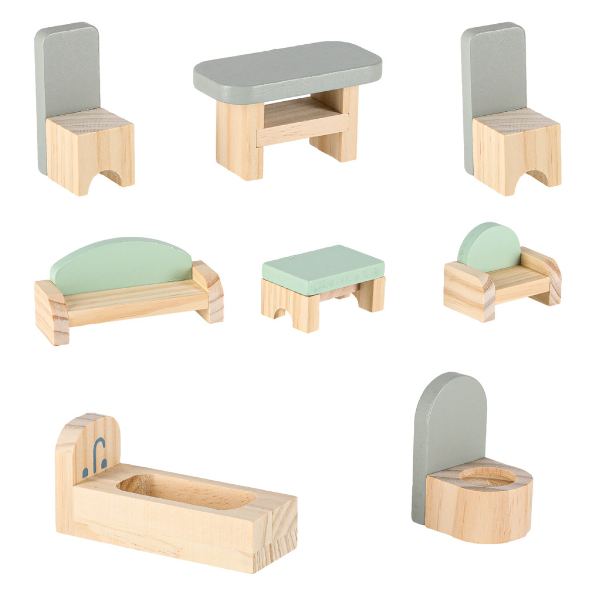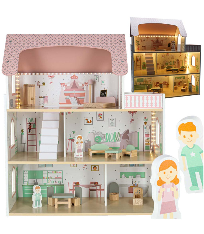 Pasteļu krāsas leļļu māja ar koka mēbelēm pārceļ jūsu bērnu uz burvīgu fantāzijas pasauli. Figūriņas cilvēku formā piešķir mājai reālismu. Mājas iemītnieki ir puisītis un meitenīte, kuru ikdienas piedzīvojumi noteikti ieinteresēs mazākos.