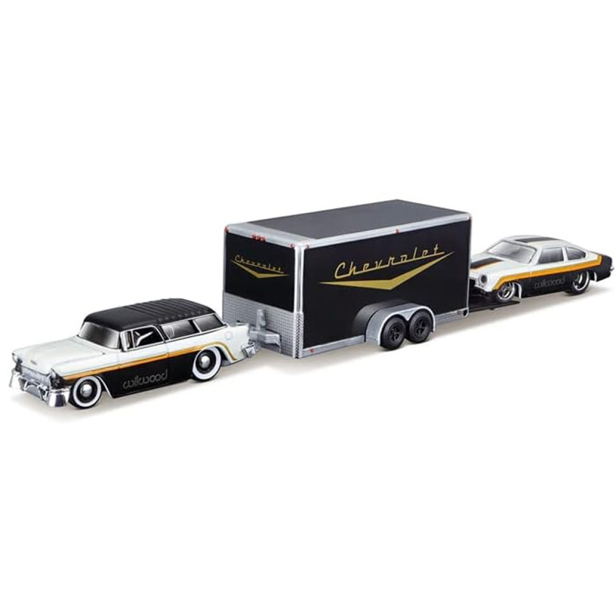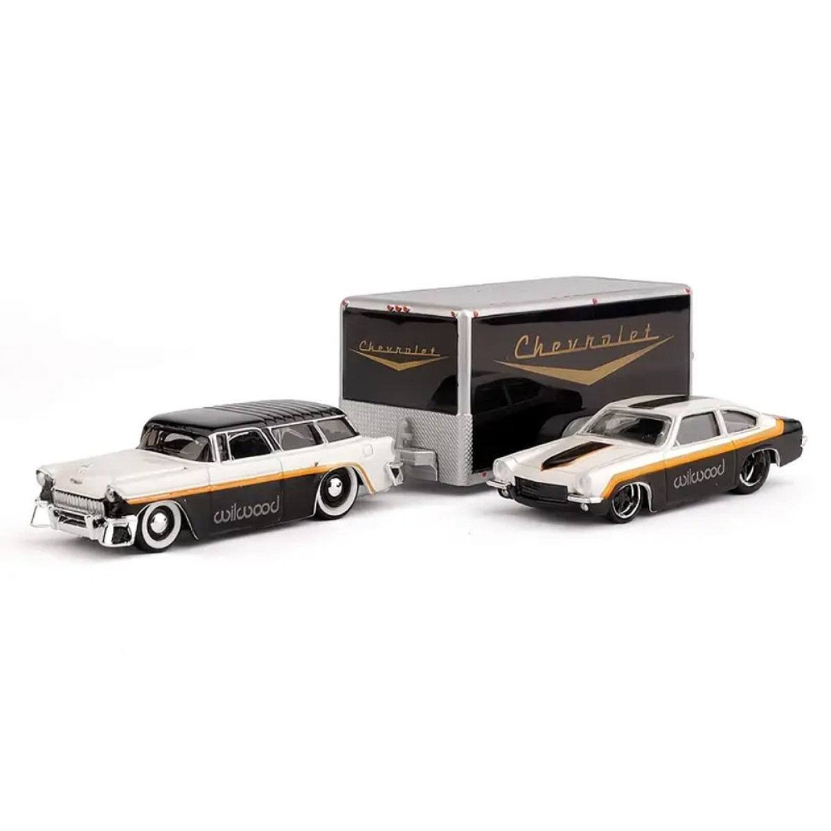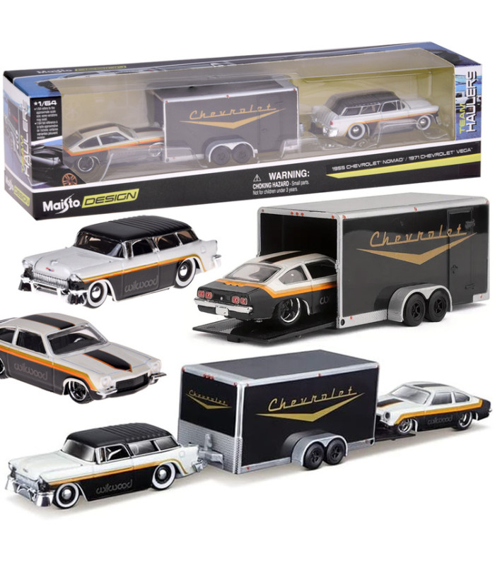 Modeļi ir elegantā melnbaltā krāsu shēmā, kas piešķir tiem klasisku un mūžīgu izskatu. Chevrolet Nomad 1955 ir aprīkots ar noņemamu āķi, kas ļauj pievienot komplektā esošo piekabi. Chevrolet Vega 1971 ideāli iederas uz piekabes, padarot šo komplektu funkcionālu un pievilcīgu spēlēšanai vai izstādīšanai.