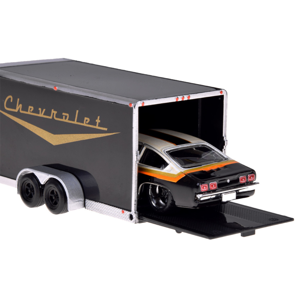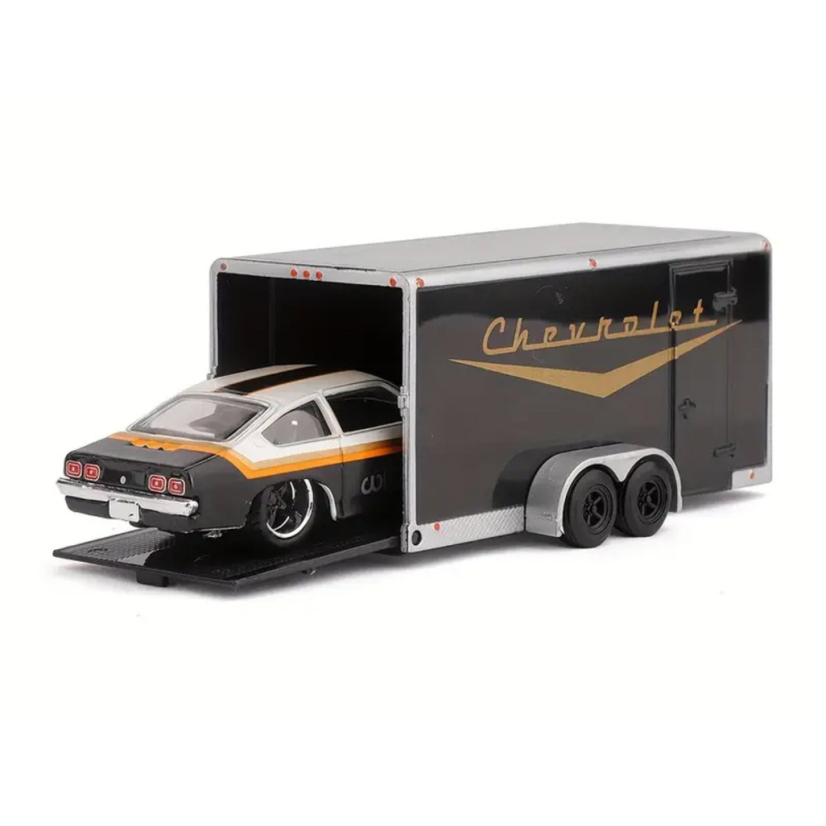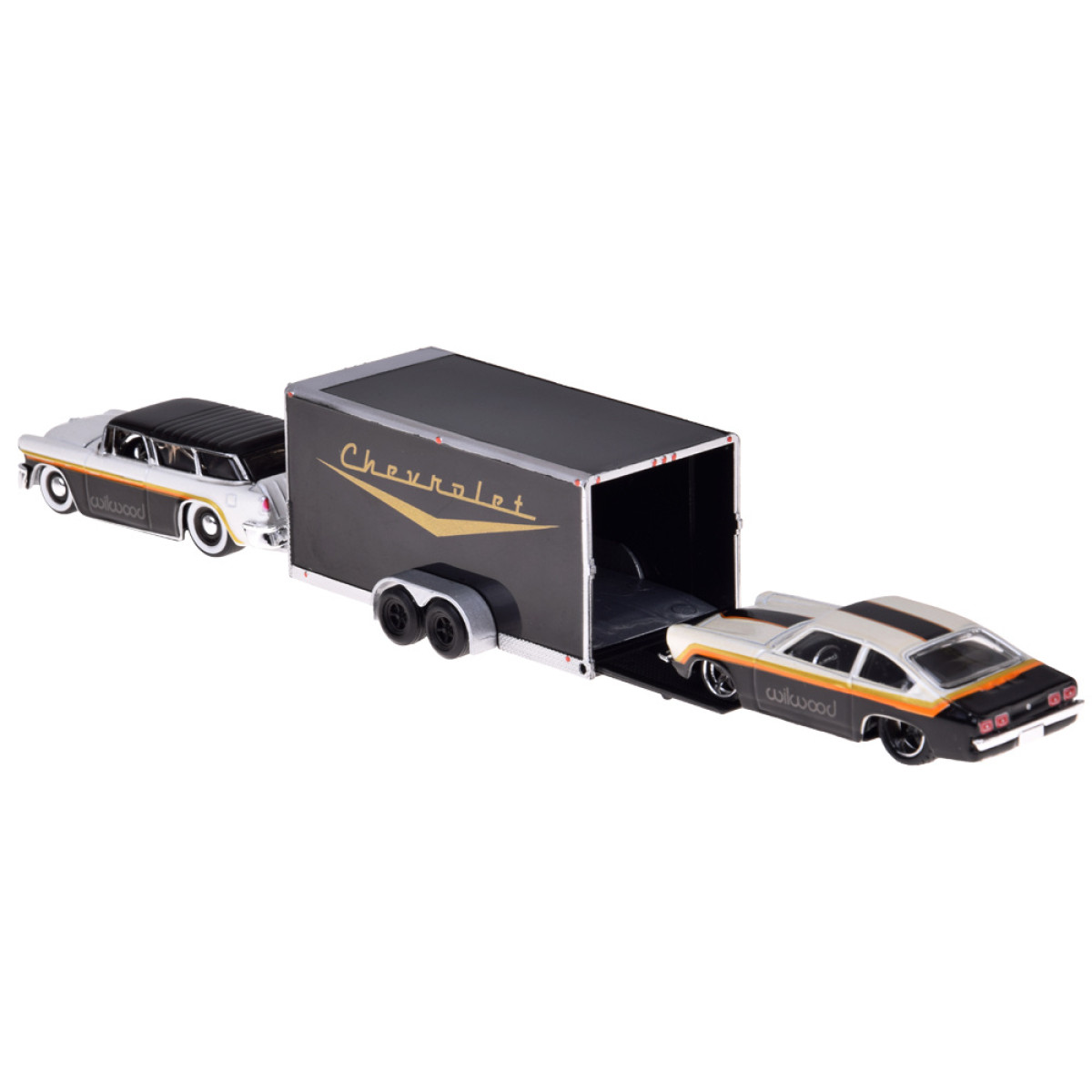 Modeļi ir elegantā melnbaltā krāsu shēmā, kas piešķir tiem klasisku un mūžīgu izskatu. Chevrolet Nomad 1955 ir aprīkots ar noņemamu āķi, kas ļauj pievienot komplektā esošo piekabi. Chevrolet Vega 1971 ideāli iederas uz piekabes, padarot šo komplektu funkcionālu un pievilcīgu spēlēšanai vai izstādīšanai.