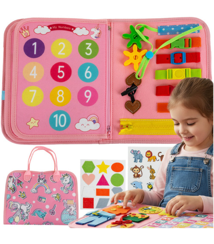 Piedāvājam oriģinālo, izglītojošo Montessori Manipulatīvo Dēli filca grāmatiņas formā ar vienradža motīvu, radītu īpaši bērniem no 3 gadu vecuma. Šī interaktīvā rotaļlieta stimulē manuālo attīstību, koncentrāciju un radošumu, iesaistot visus bērna sajūtu orgānus. Kompaktie izmēri (22,5 cm platums un 28 cm augstums salocītā veidā) padara to ērti pārnēsājamu un ideāli piemērotu rotaļām mājās vai ceļojumos.