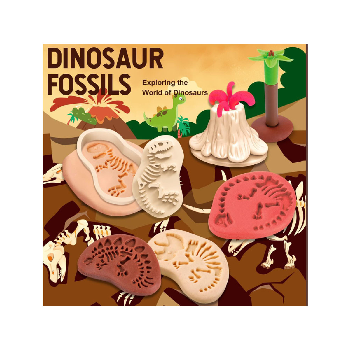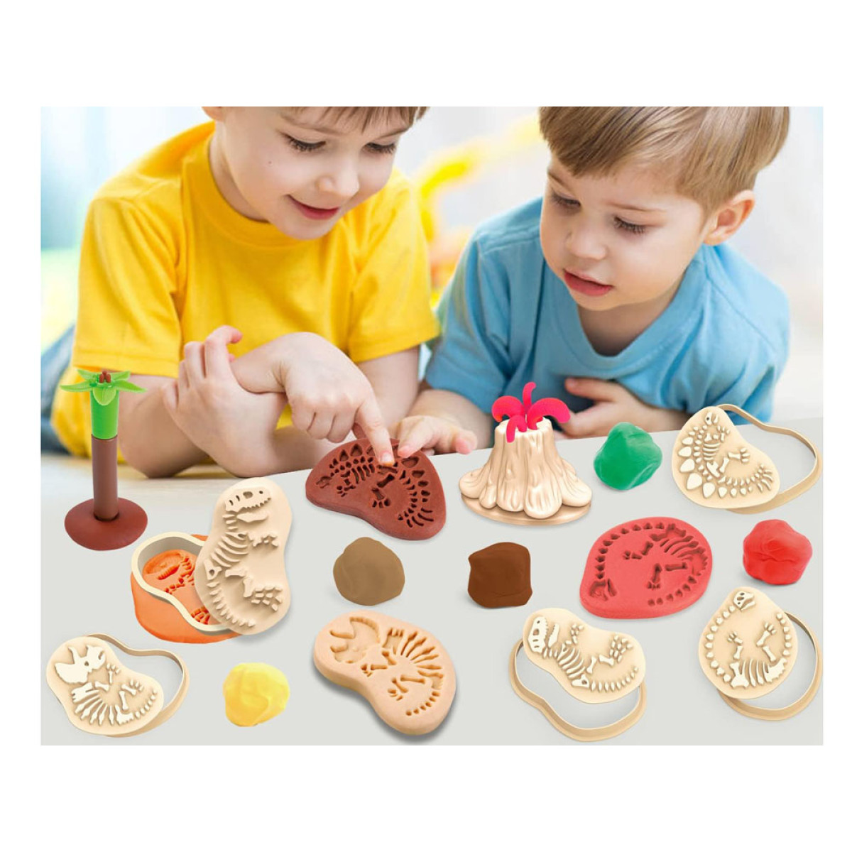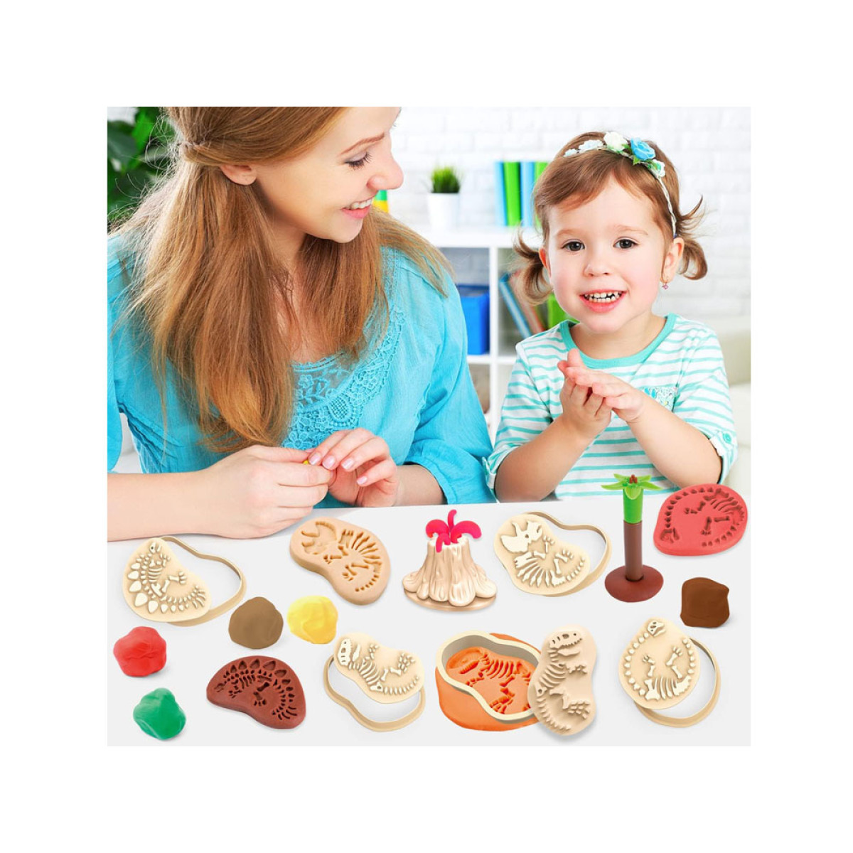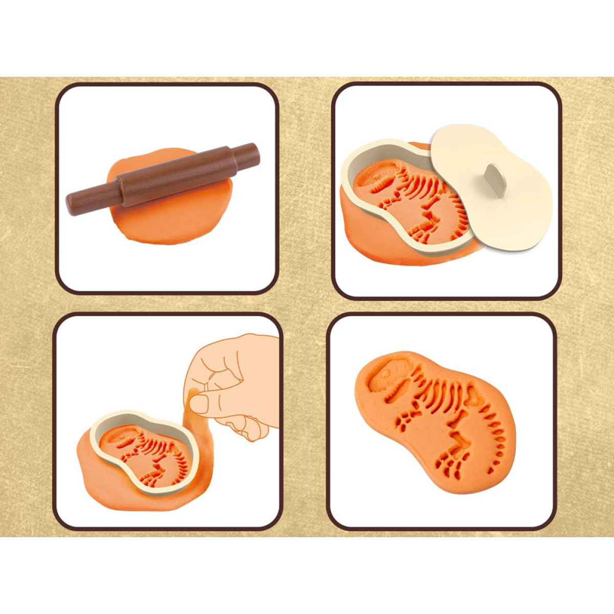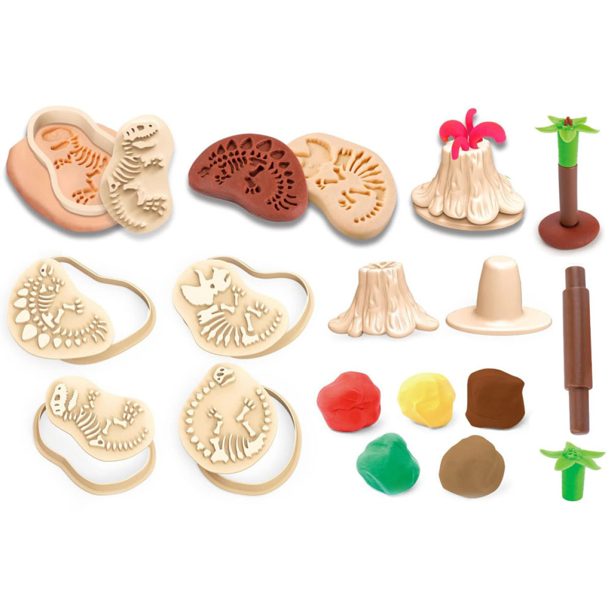 Komplekts ar plastilīnu ir lieliska izklaide katram bērnam, kuram patīk veidot formas. Spēlēšanās ar plastilīnu rosina bērnu iztēli un veicina radošumu, piedāvājot neierobežotas iespējas veidot. Tas viss pateicoties vienkāršiem un drošiem piederumiem un instrumentiem. Komplekts ļauj ienirt arheologu pasaulē, pētot dinozauru aizvēsturisko pasauli. Vienkārši izrullē plastilīnu plānā slānī un uzliec formu ar izvēlēto dinozauru fosiliju rakstu.