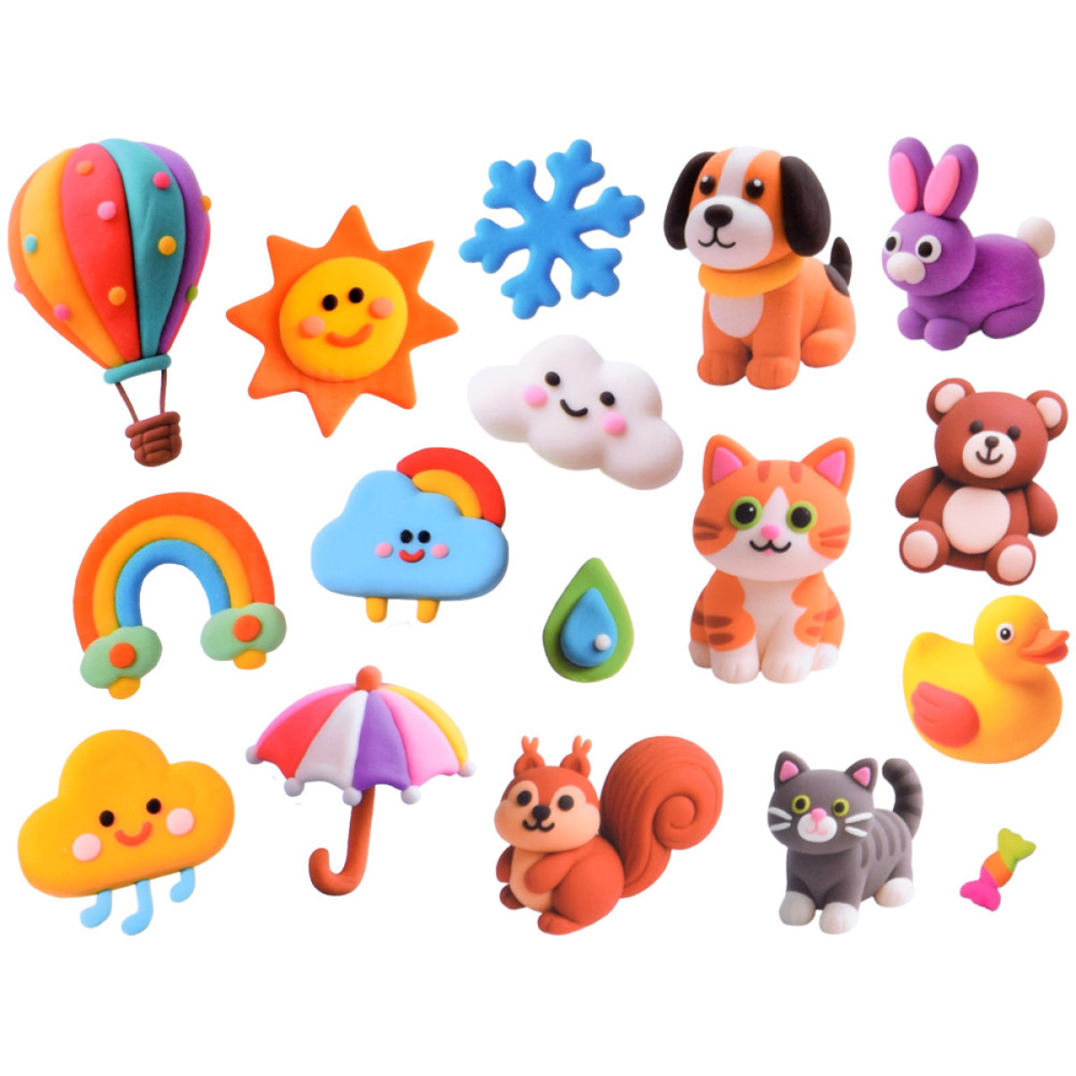 radošs plastilīna komplekts bērniem, kuriem patīk veidot, mīcīt un radīt savus tēlus. Ar šo komplektu bērns var izveidot krāsainu pasauli ar dzīvnieku figūriņām un ar laikapstākļiem saistītiem elementiem. Krāsainā plastilīna masa palīdz veidot dažādas formas, bet īpašās veidnes ļauj viegli izgatavot mīļas figūriņas.