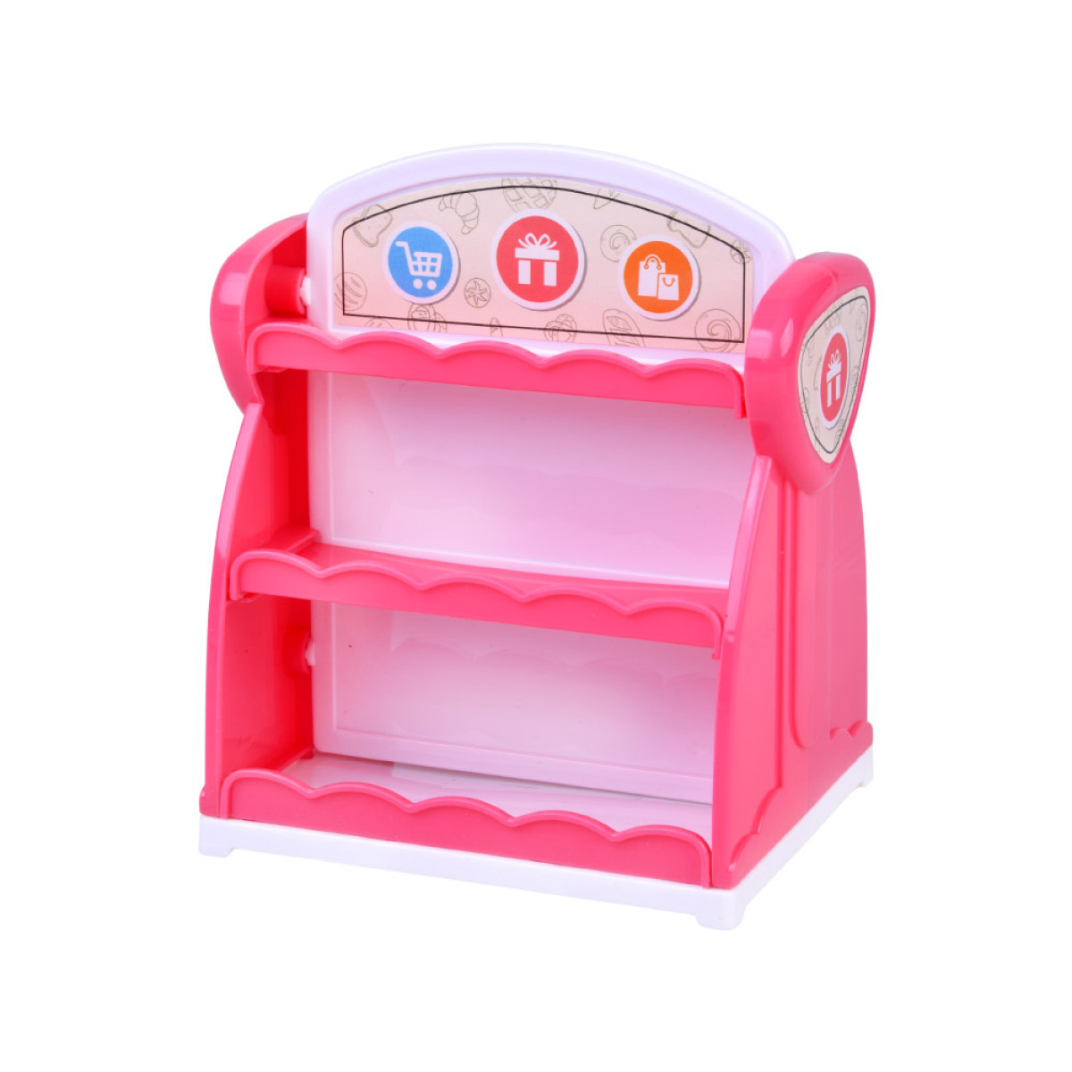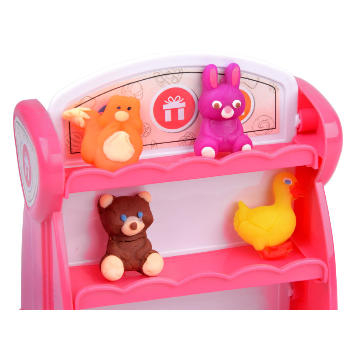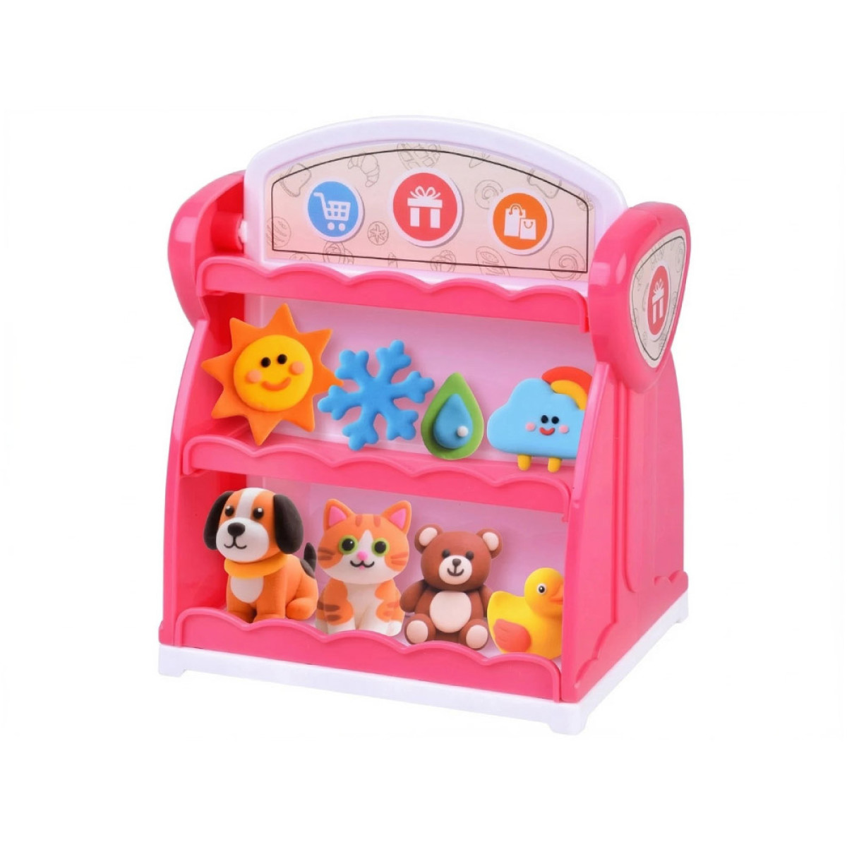 Komplektā ir divpusējs rozā plaukts veikala formā, kas atgādina mazu veikaliņu. Abās pusēs ir trīs plaukti, uz kuriem var novietot izveidotās figūriņas. Tas ļauj bērnam ne tikai modelēt, bet arī skaisti parādīt savus darbus kā īstā skatlogā.