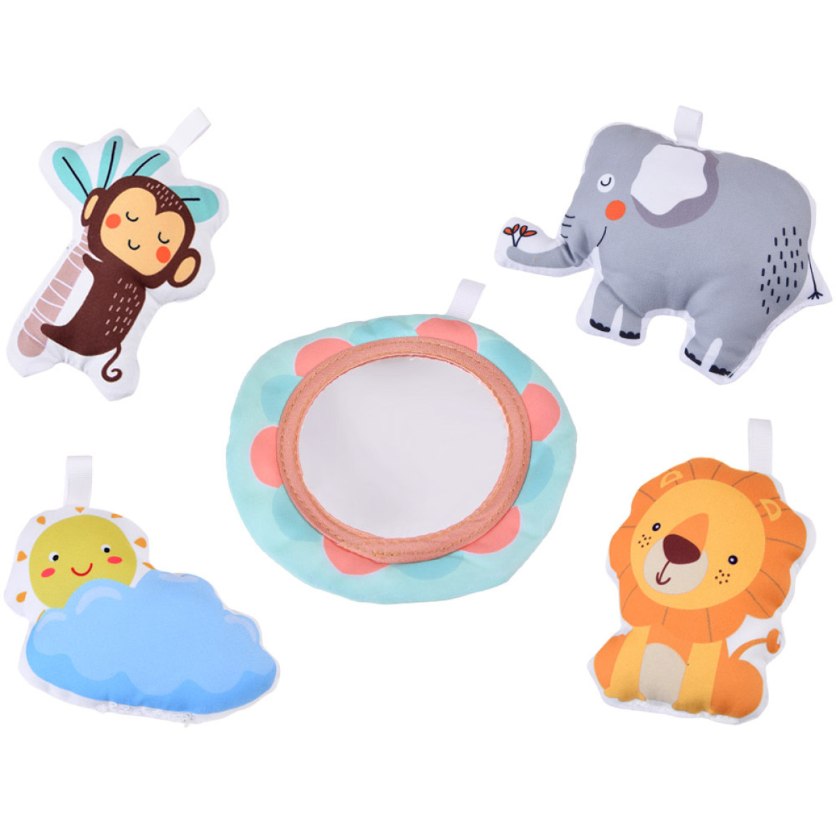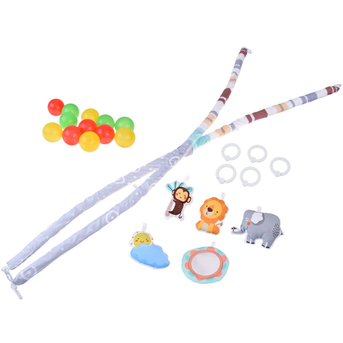 - Karabīnes un rotaļlietas (piemēram, spogulis, saulīte ar mākoņiem, dzīvnieciņi – lauva, zilonis, mērkaķis).