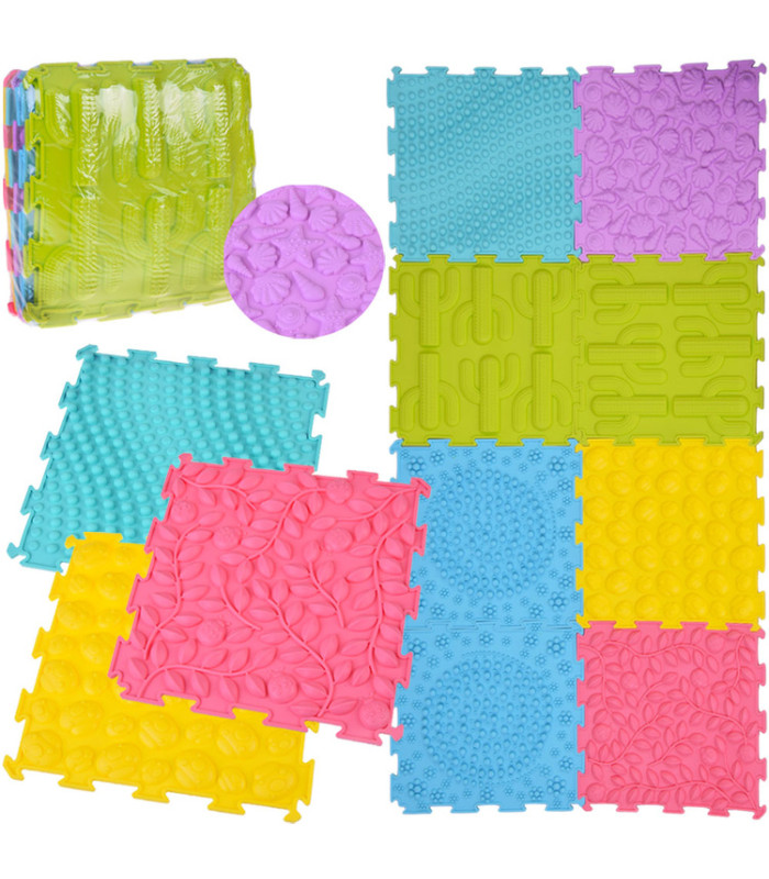 Sensorā paklājs PUZZLE veidā sastāv no 8 puzļiem ar izmēriem 24,5 cm x 24,5 cm un biezumu 1 cm. Katrs elements ir izgatavots pasteļtoņos un tam ir dažādi raksti un reljefi, kas stimulē bērna maņas, ejot un vingrojot.
