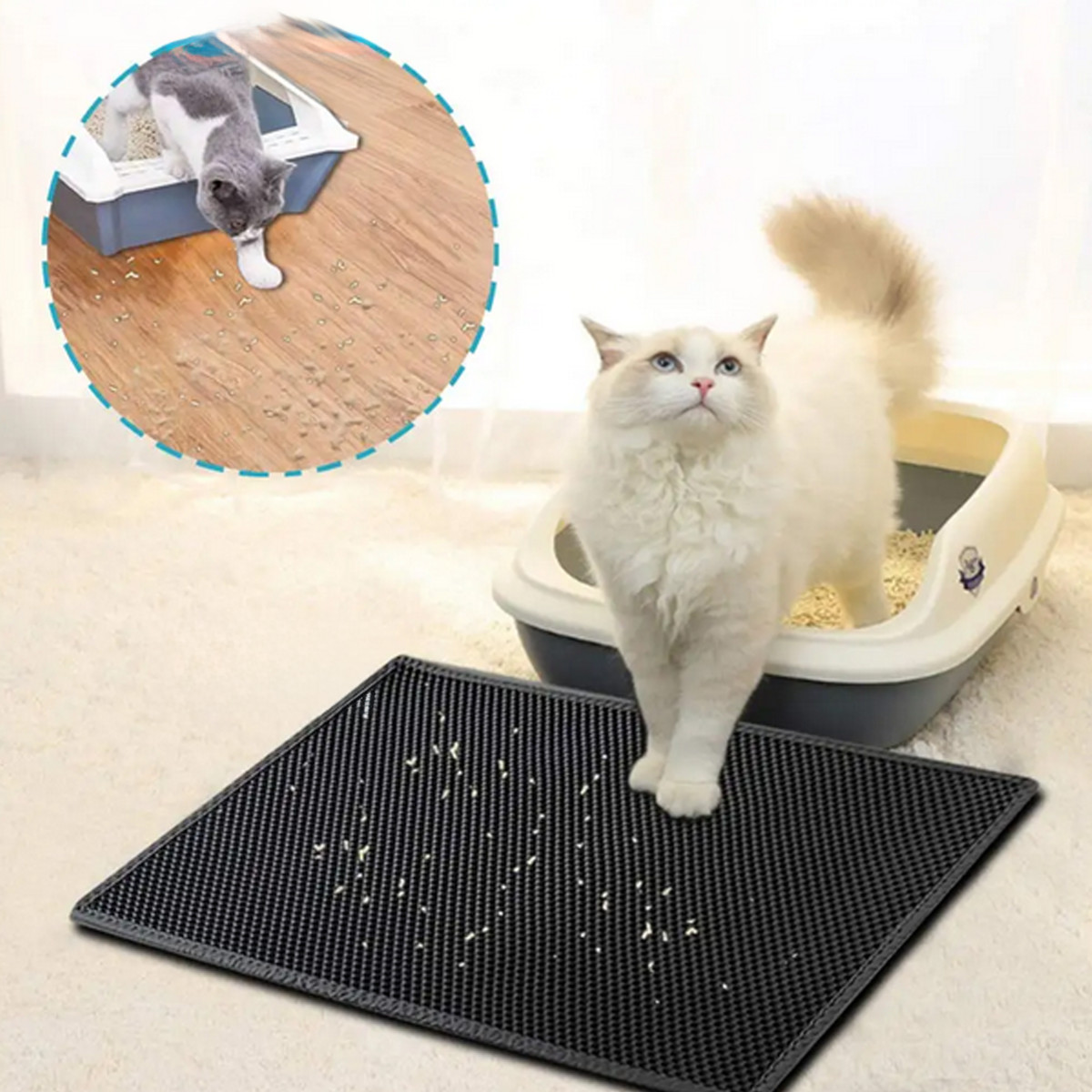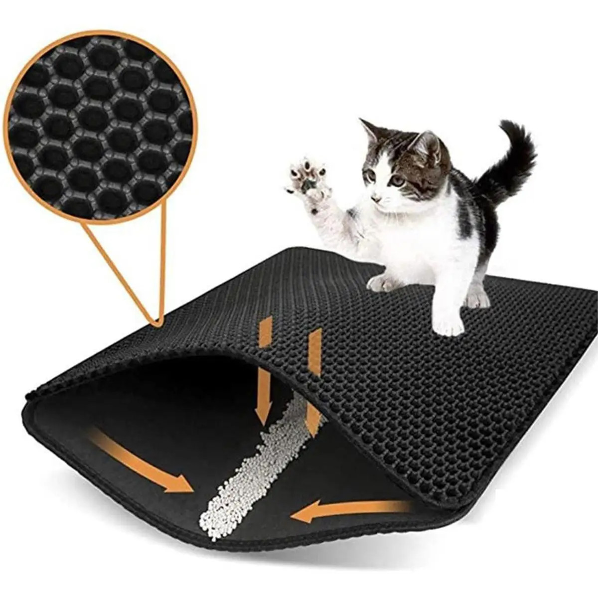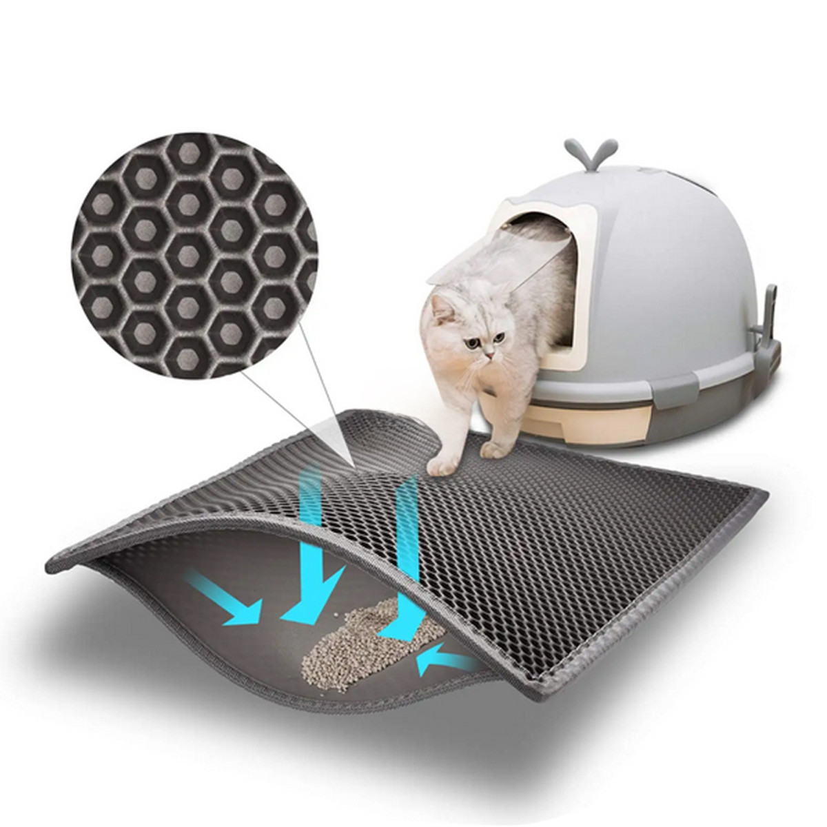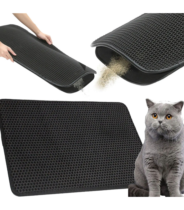 Divslāņu higiēniskais paklājiņš efektīvi uztur smiltis, kas paliek uz kaķa ķepām pēc tualetes apmeklējuma. Smilšu daļiņas un citas nešķīstības iekrīt atverēs un nonāk iekšējā slānī. Vienkārši novietojiet to blakus tualetei, lai kaķis neizplatītu netīro smilti pa visu telpu.