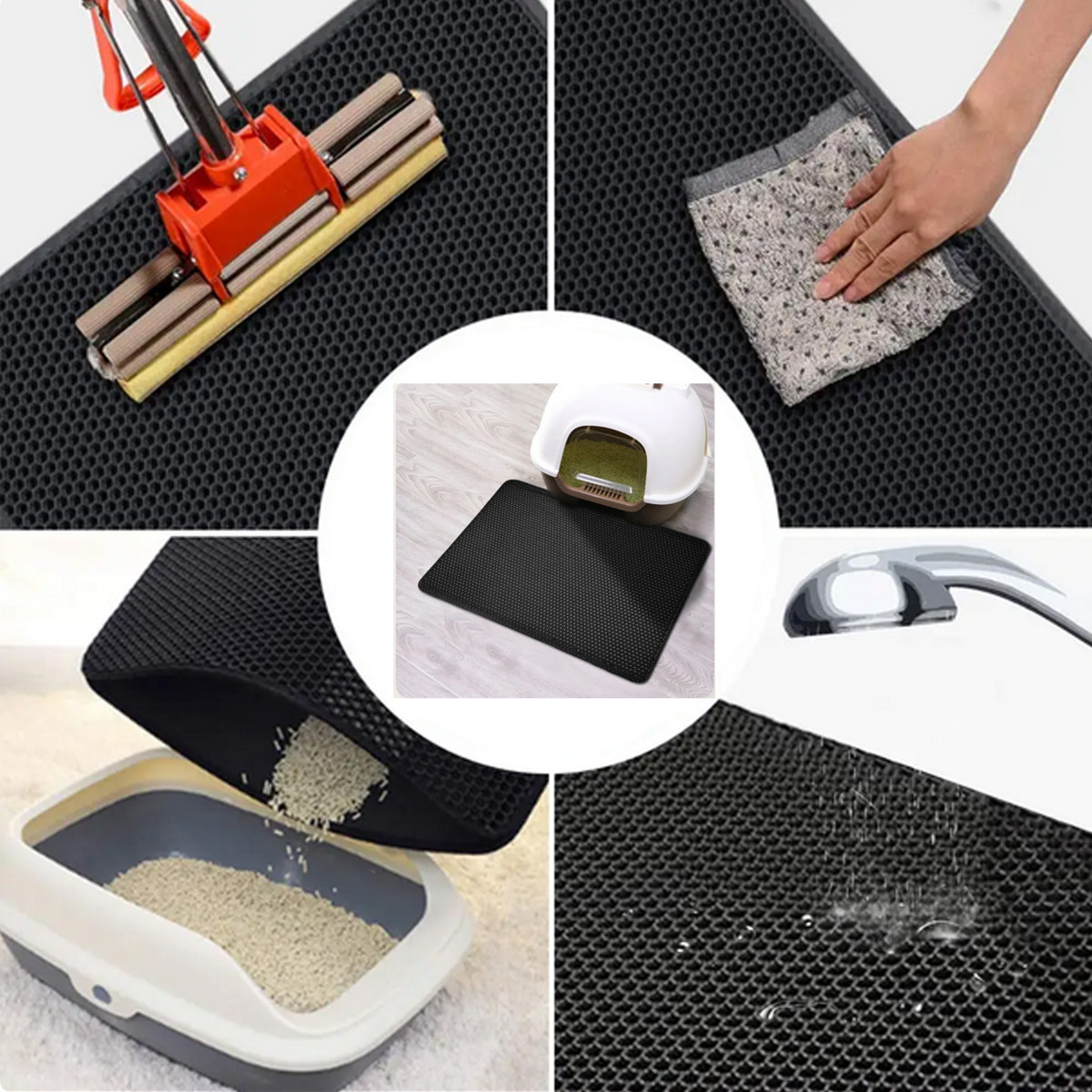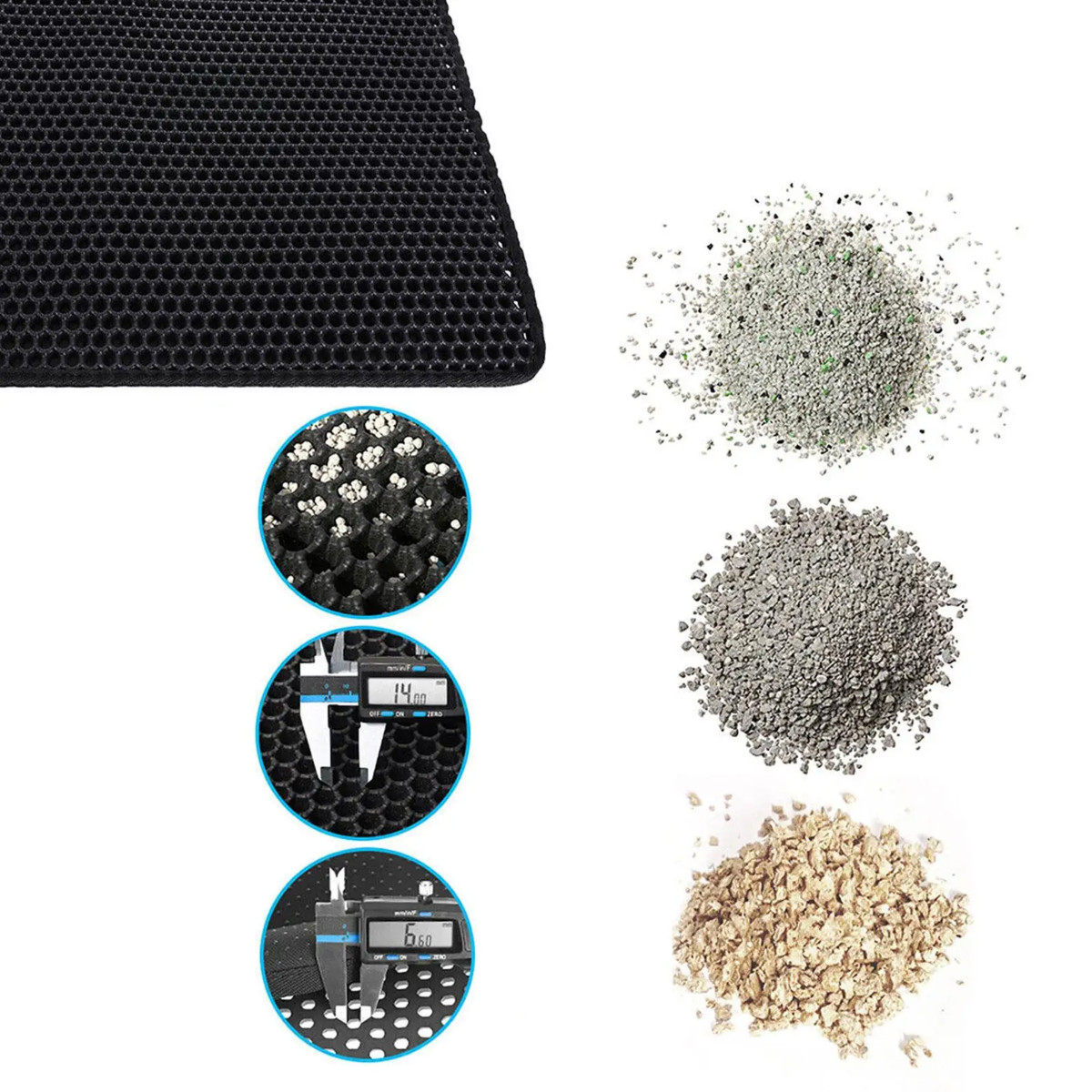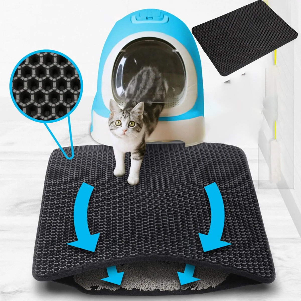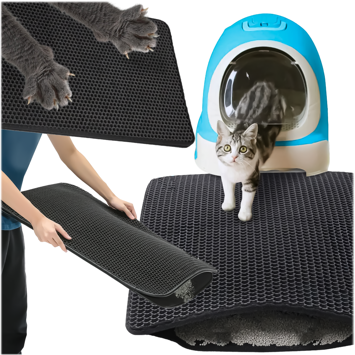 Divslāņu higiēniskais paklājiņš efektīvi uztur smiltis, kas paliek uz kaķa ķepām pēc tualetes apmeklējuma. Smilšu daļiņas un citas nešķīstības iekrīt atverēs un nonāk iekšējā slānī. Vienkārši novietojiet to blakus tualetei, lai kaķis neizplatītu netīro smilti pa visu telpu.