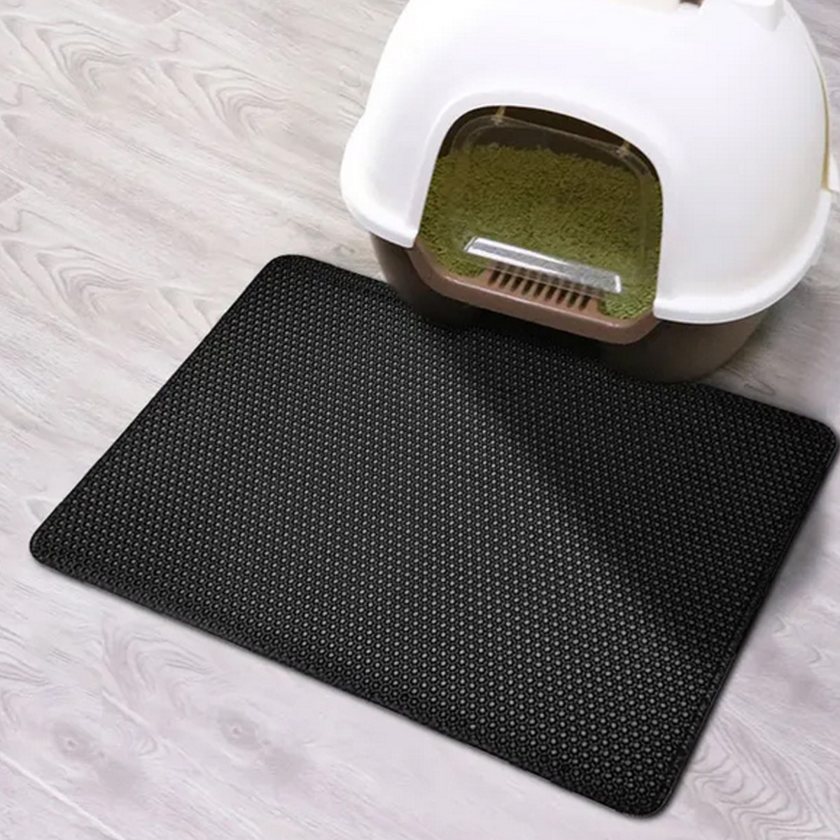 Melns XXL izmēra paklājs kaķu tualetes priekšā, lai savāktu izbirušo smilti.
