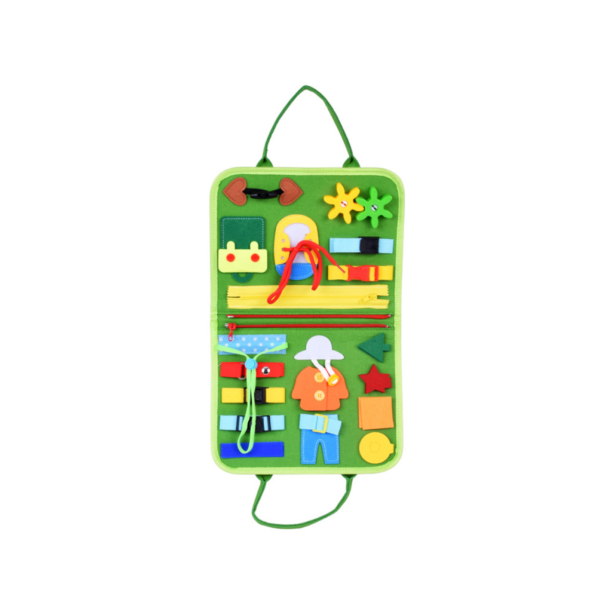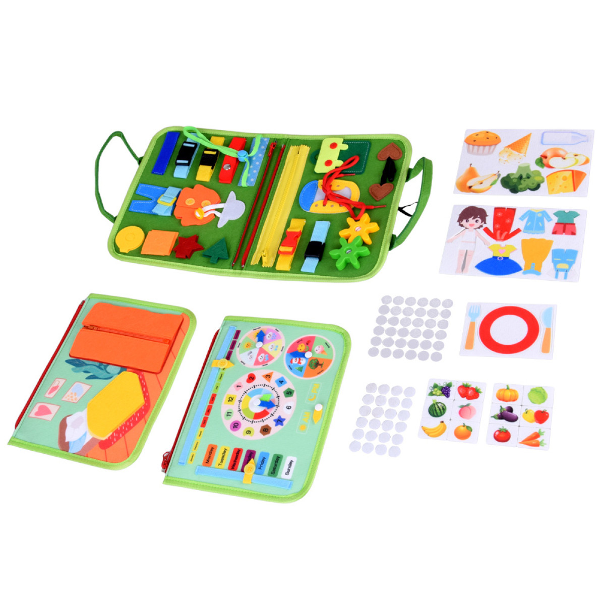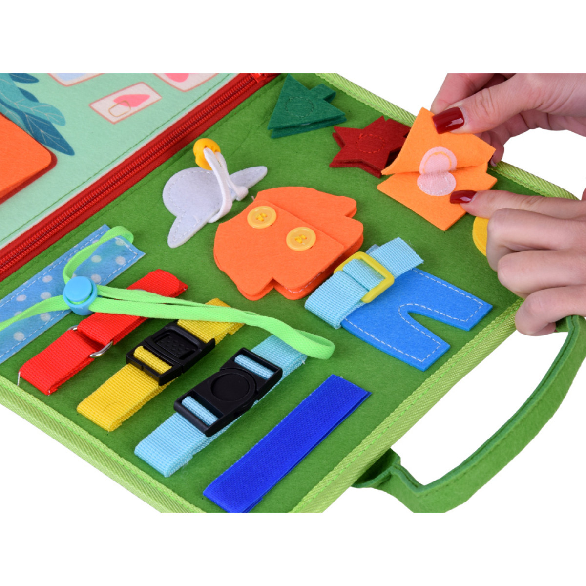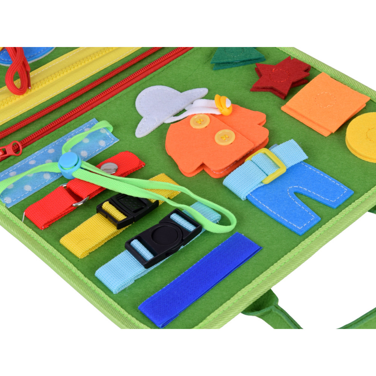 - Mācību par apģērbu uzvilkšanu: apģērbu elementi, ko var atvērt, aizvērt, sasiet un ievērt. Bērns vingrina pirkstus un mācās patstāvību apģērba uzvilkšanā.
