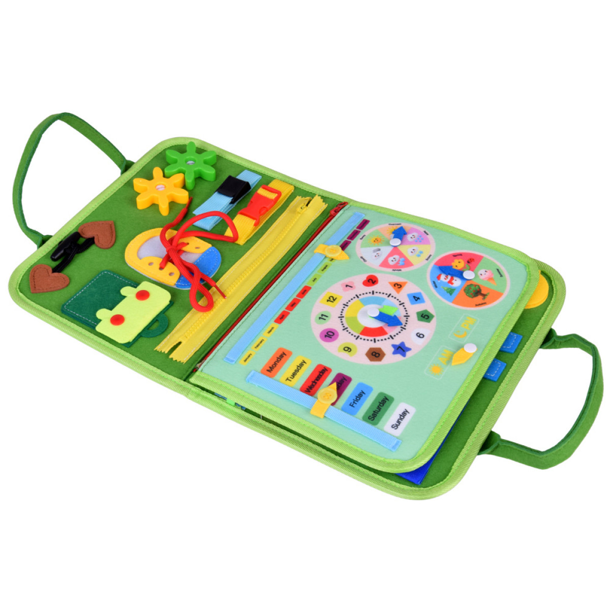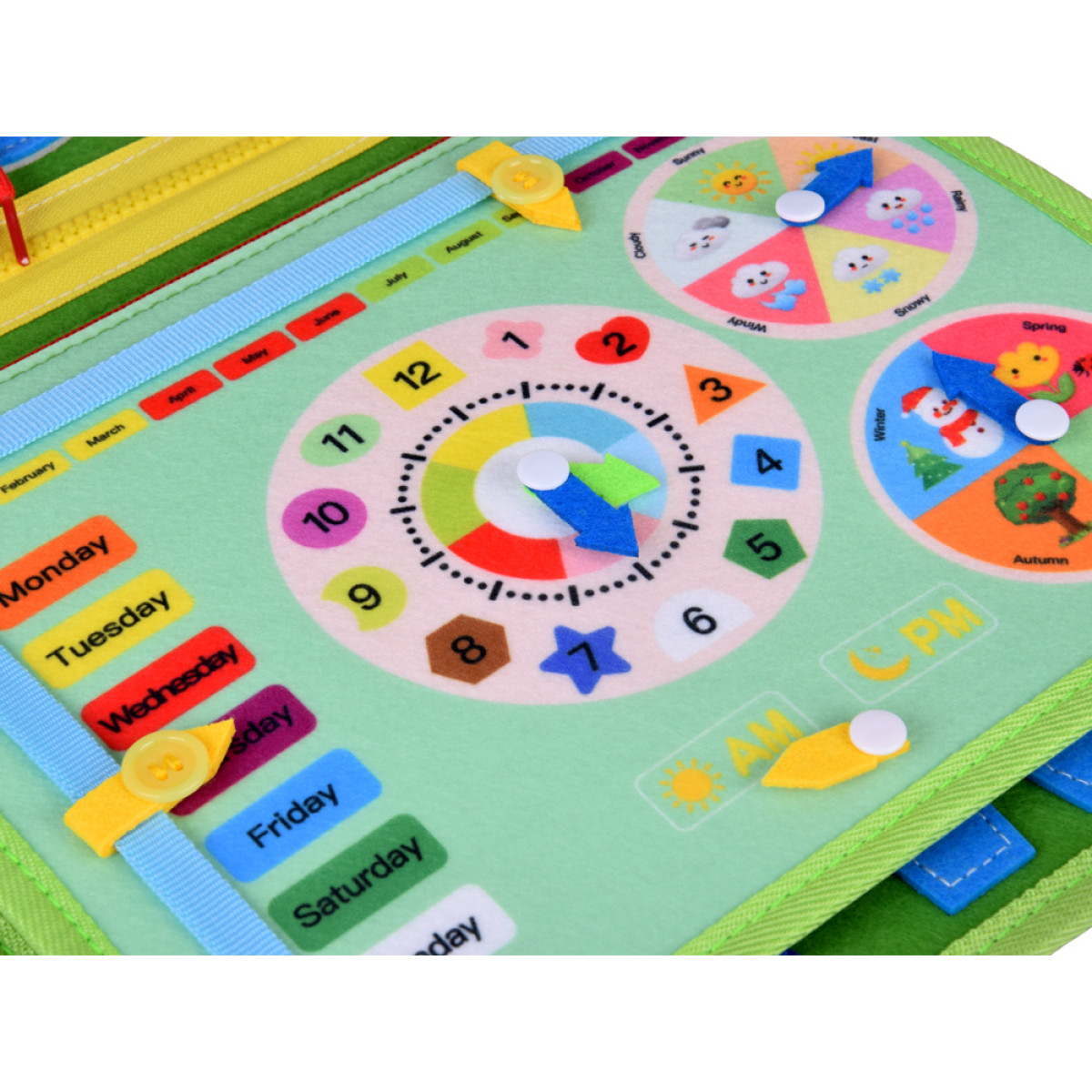 - Kalendārs un pulkstenis: nedēļas dienu, mēneša, gadalaiku un laika apstākļu rādītāji, kā arī pulkstenis ar rotējošām bultiņām – laika un dienas ritma mācīšanās caur spēli.