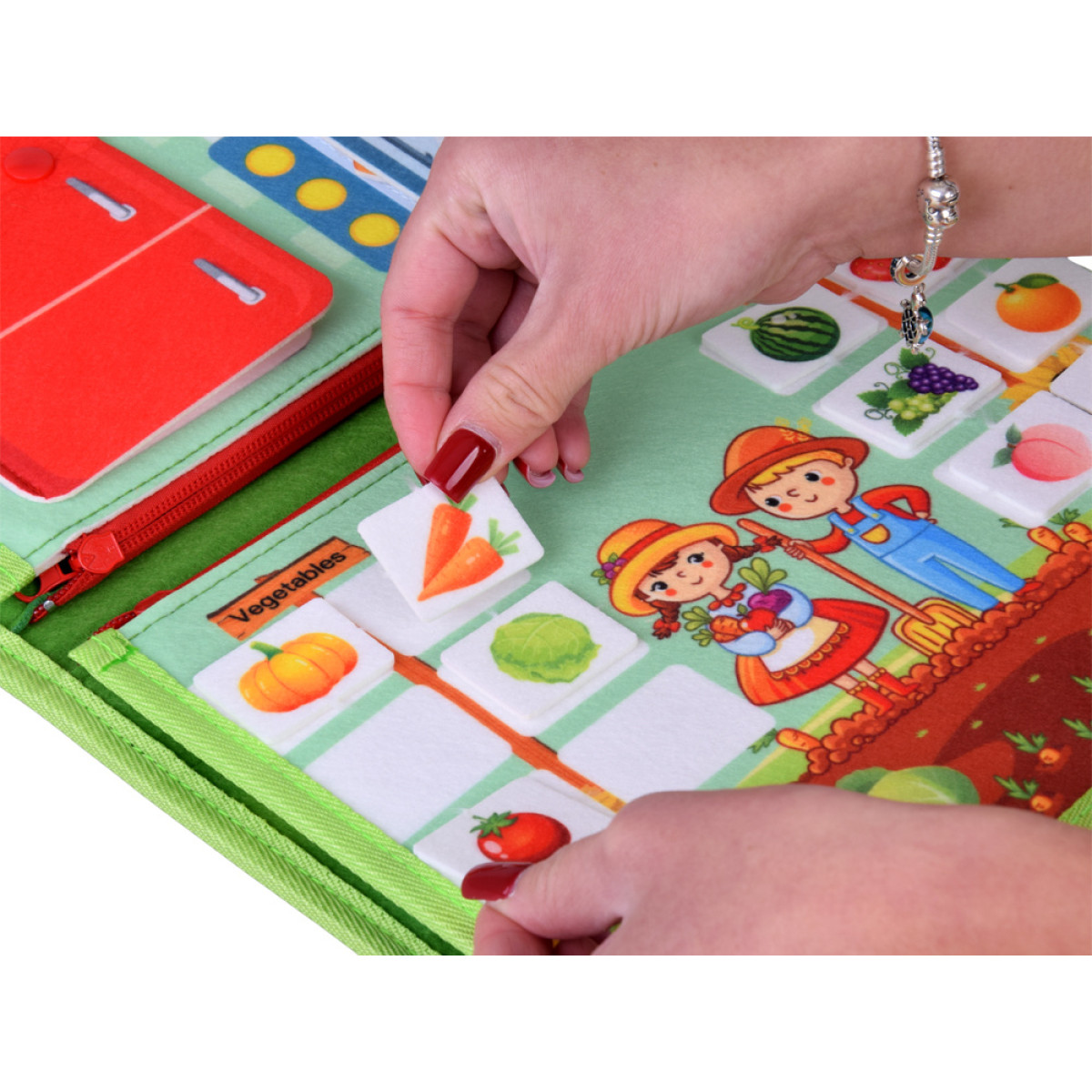- Dārzs: bērns mācās atšķirt augļus un dārzeņus, piestiprinot tos ar aizdares palīdzību.
