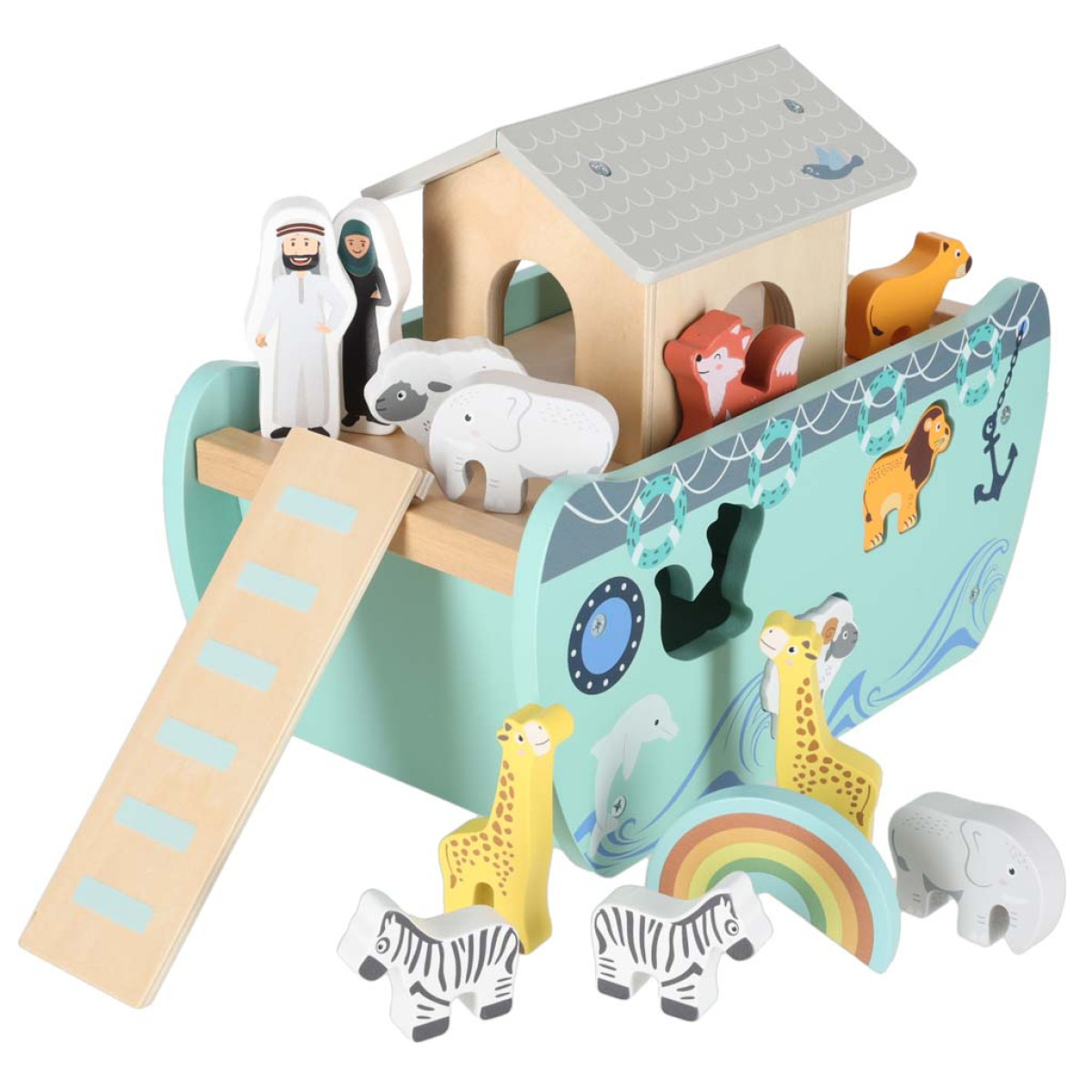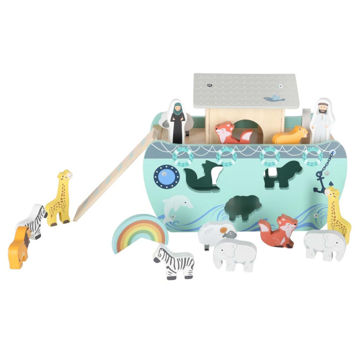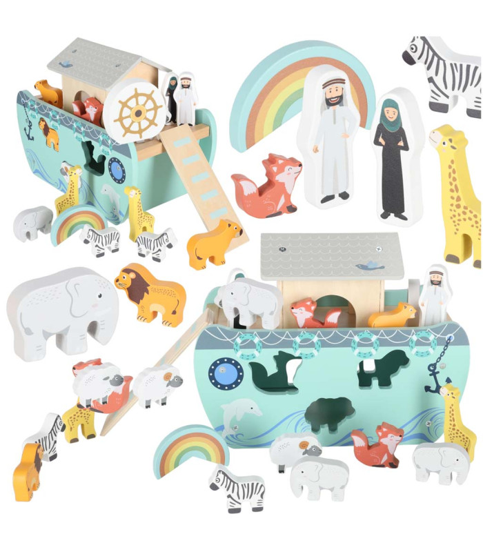 Komplektā ir koka rūpīgi izgatavotas dzīvnieku figūras (zebras, žirafes, ziloņi, aitas, lauvas, lapsas), kas iepazīstina bērnus ar laika gaitā pārbaudītu stāstu. Papildus tam ir arī Noasa un viņa sievas figūras. Pateicoties tām, rotaļas pārvēršas stāstā par to, kā Noasa šķirsts palīdzēja izglābt dzīvniekus.