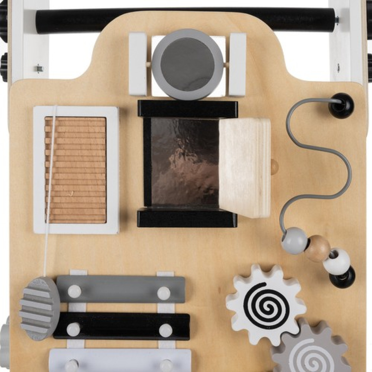 ✔️ Manipulācijas panelis - staigulis ir aprīkots ar daudzfunkcionālu manipulācijas paneli, kas ietver: zvaniņus, skaitļus, labirintu, kustīgās bumbiņas, zobratus, spoguli, atveramas durtiņas un formu puzles, katra siena piedāvā atšķirīgu aktivitāti, nodrošinot garas spēles stundas un atbalstot bērna spēju attīstību