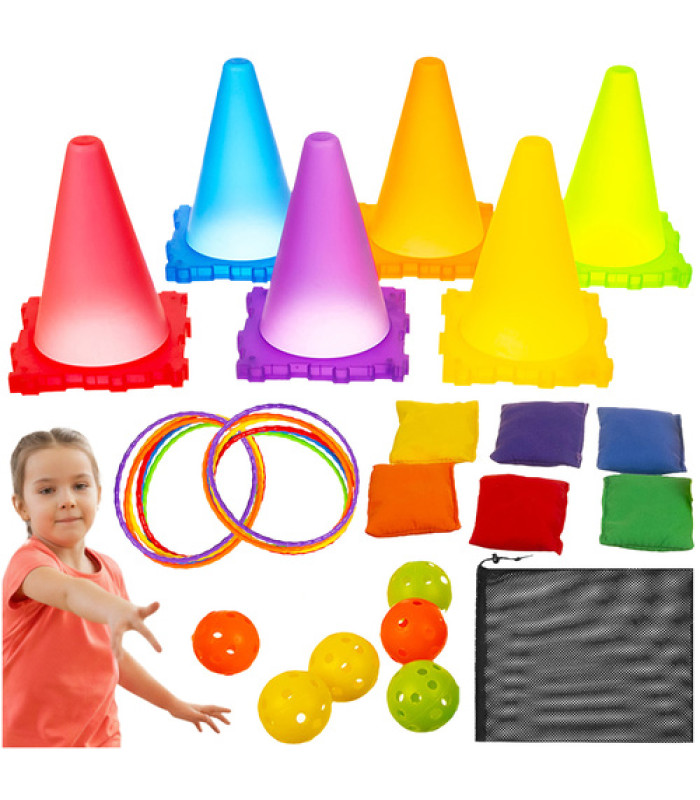 Prasmju spēle "Mērķa mešana" Kruzzel ir lieliska izvēle bērnu izklaidei un attīstībai. Tā piedāvā daudzveidīgus piederumus, kas ietver 6 konusus, riņķus, bumbas un vingrošanas maisiņus košās krāsās, kas piesaista bērnu uzmanību.