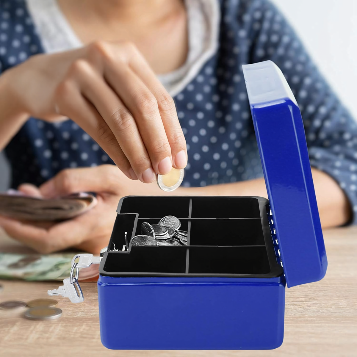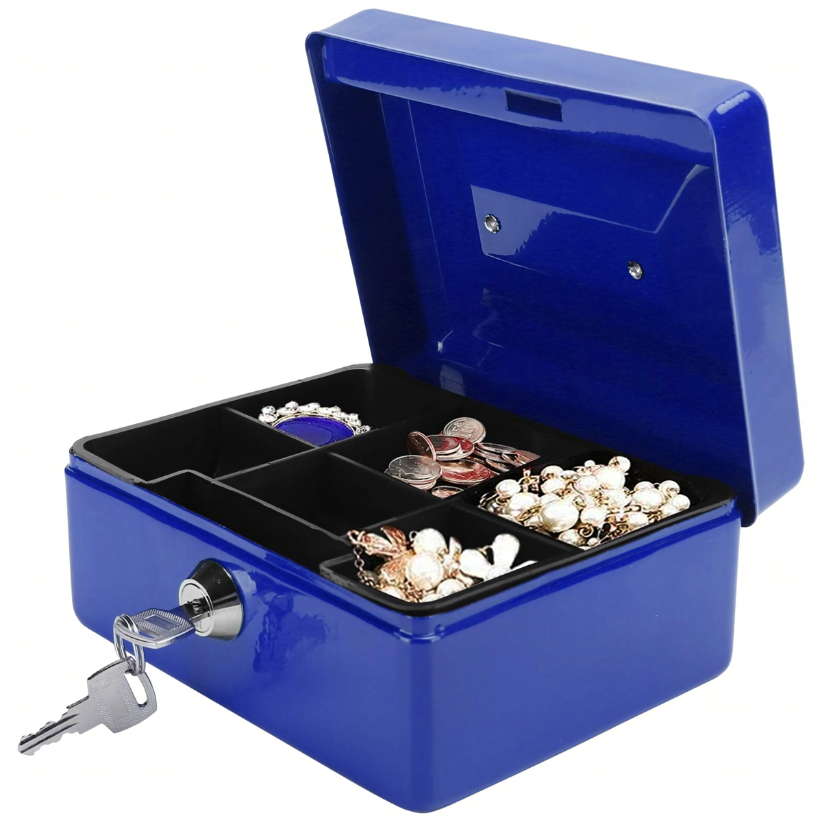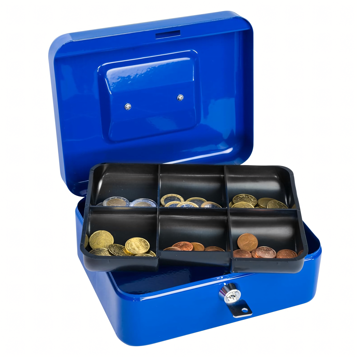 Metāla kase ar atslēgu slēdzeni ir lielisks veids, kā uzglabāt mazas un lielas summas, dokumentus un citus sīkus priekšmetus. Tā ir aprīkota ar plauktu ar nodalījumiem, kas ļauj viegli kārtot monētas.