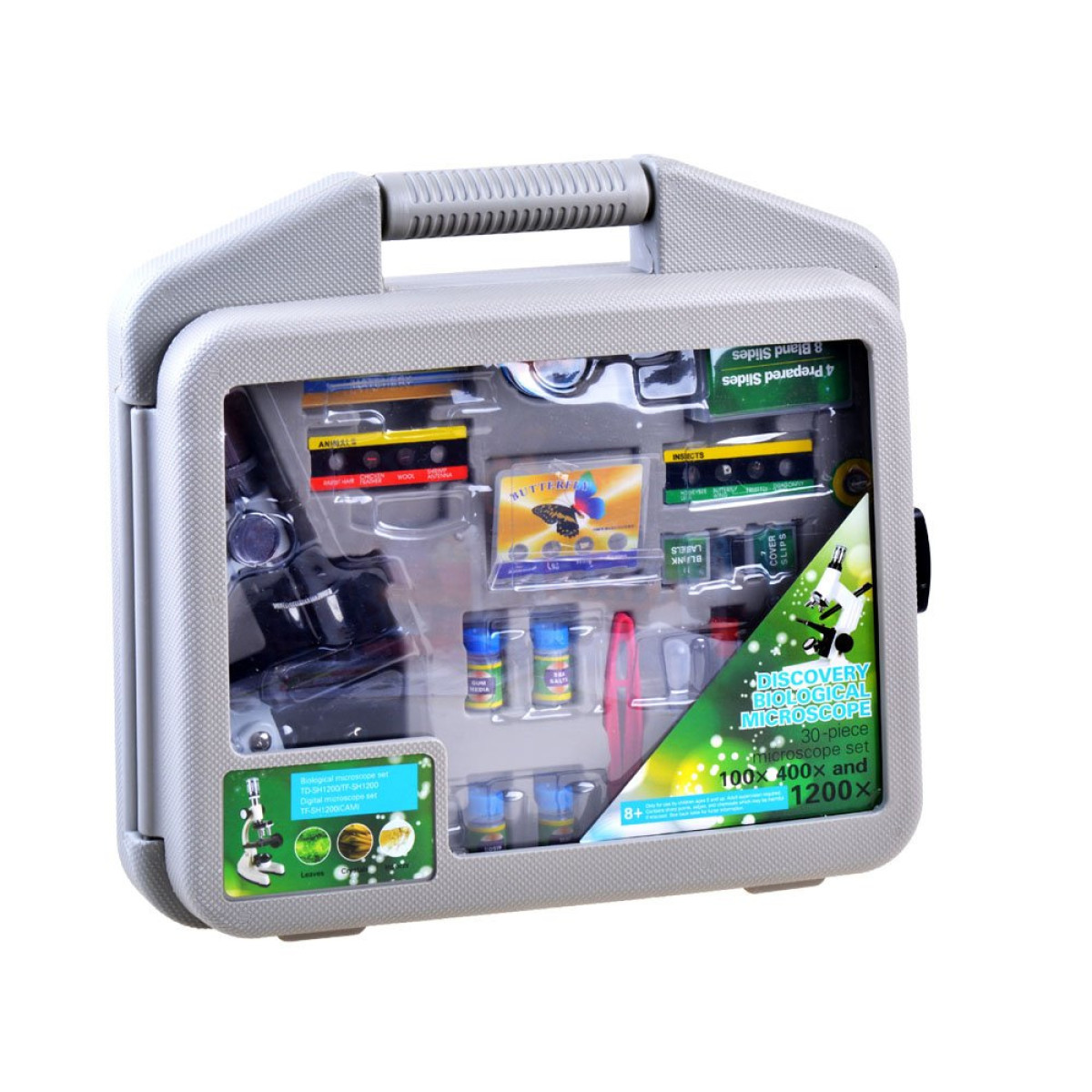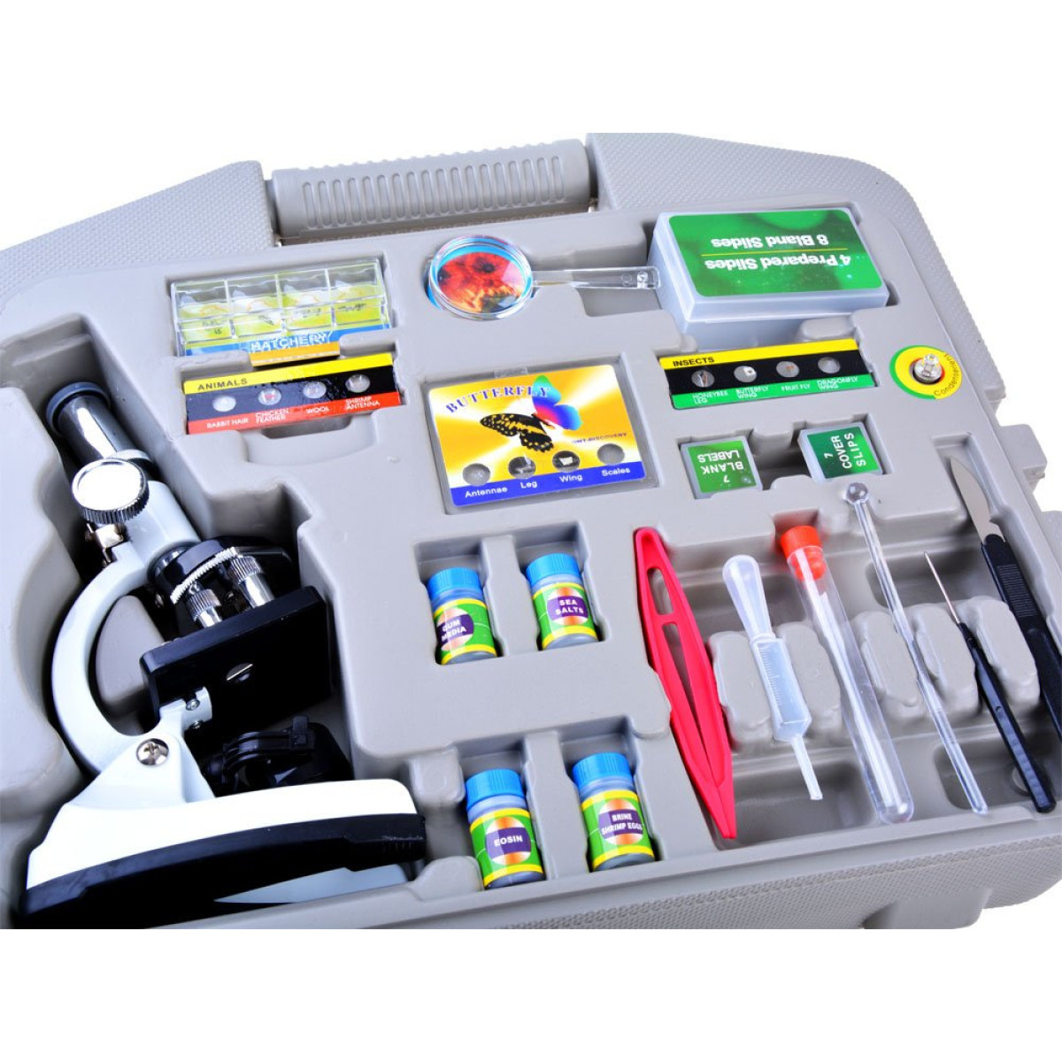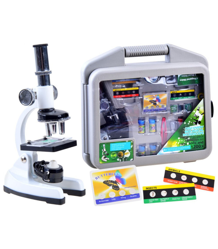 Izglītojošs komplekts mazajiem zinātniekiem, kas sastāv no mikroskopa ar piederumiem, ir lielisks veids, kā iepazīstināt bērnu ar zinātnes un dabas pasauli. Tas ļaus ieraudzīt to, ko ar neapbruņotu aci nevar saskatīt. Mikroskops ir rūpīgi izgatavots no metāla un plastmasas, pievēršot uzmanību detaļām. Mikroskopam ir rotējoša galva ar 3 objektīviem, kas nodrošina palielinājumu 100x/600x/1200x, un iebūvēta spuldze, lai izgaismotu apskatāmos preparātus.