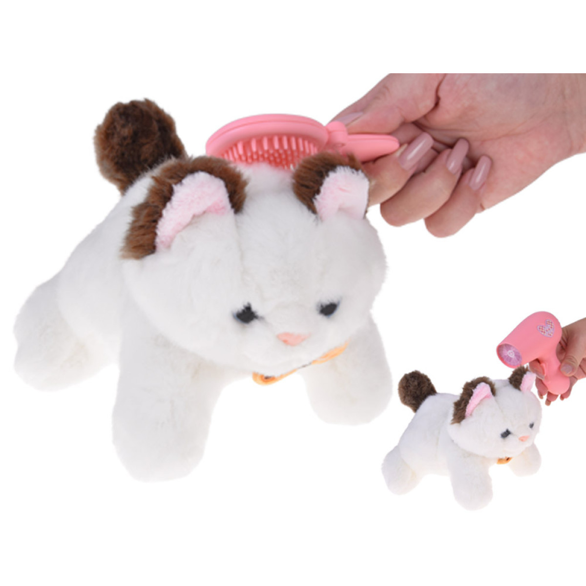 - Komplektā ietilpst kopšanas piederumi, piemēram, fēns un suka, ar kuriem bērns var rūpēties par sava mīluļa izskatu.