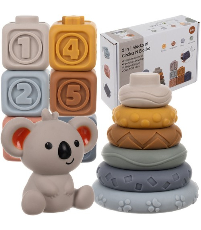 - Funkcionalitāte - komplektā ietilpst 12 elementi un koalas rotaļlieta, ko var novietot uz klucīšiem. 6 mīksti un elastīgi klucīši, kas var pildīt vairākas funkcijas. Katrs klucītis darbojas kā svilpe – spiežot, mīcot vai graužot, no tā izplūst maigs skaņas signāls, kas piesaista bērna uzmanību un papildus stimulē dzirdi. Izvirzītie elementi uz klucīšu virsmas palīdz attīstīt taustes sajūtas, nodrošinot dažādas sensācijas. Klucīšu sienās ir dažādi raksti: burti, dzīvnieki, augļi skaitļos no 1 līdz 6, kas atvieglo bērnam pasaules agrīnu iepazīšanu izklaidējošā un izglītojošā veidā. Klucīši ir ideāli piemēroti tornīšu būvēšanai, pielāgojot pareizas formas caurumiem, kas attīsta loģisko domāšanu un vizuāli-motorisko koordināciju.