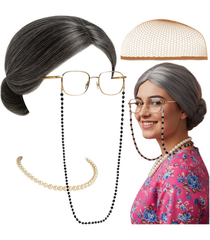 Klasisks vecmāmiņas stils ar pelēku parūku, brillēm ķēdē un pērļainu kaklarotu, kas ir gatavs kostīms, lieliski piemērots Halovīnam, masku ballēm vai skatuves uzvedumiem. Universāls izmērs un viegla konstrukcija nodrošina ērtumu valkāšanā, bet raksturīgais izskats uzreiz izraisa smaidu un piesaista uzmanību – ideāla izvēle jautrām ballītēm.