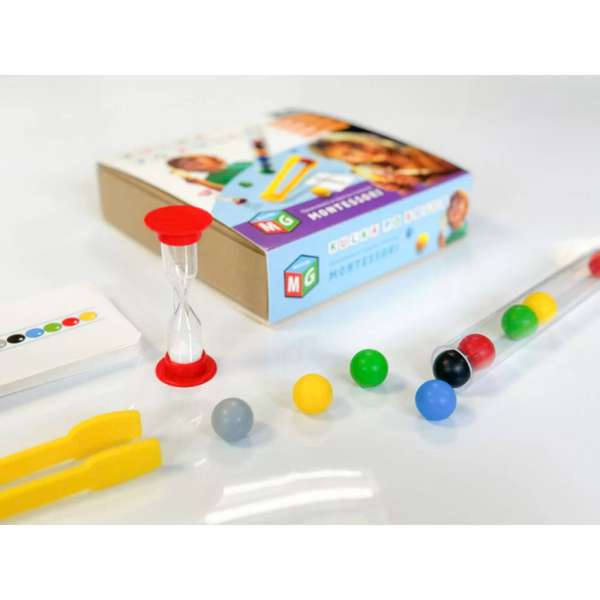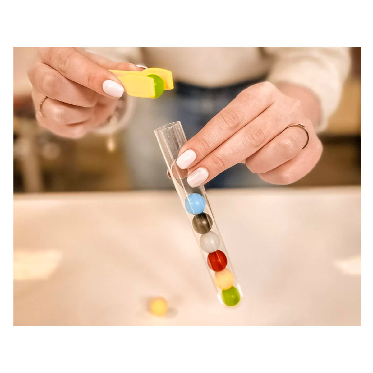 Spēles pamatā ir krāsainu bumbiņu paņemšana ar pinceti un to ievietošana mēģenē. Bērni var to darīt jebkādā secībā vai atdarināt konkrētus modeļus, kas attēloti uz karšu paraugiem. Šī aktivitāte palīdz trenēt kustību precizitāti, pacietību un roku-acu koordināciju.