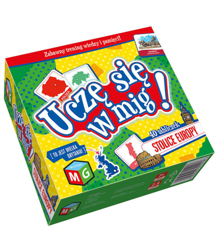 "MĀCOS ĀTRI - EIROPAS GALVASPILSĒTAS" ir lieliska spēle, kas attīsta jūsu bērna atmiņu un uzmanību. Turklāt tā paplašina viņa ģeogrāfijas zināšanas un palīdz atmodināt patiesa ceļotāja dabu, nodrošinot daudz prieka un emociju. Uzvar tas, kurš vislabāk atceras valstu un to galvaspilsētu pāru atrašanās vietas, kas uz brīdi atklājas starp visām ilustrētajām plāksnītēm, kas novietotas uz galda ar attēlu uz leju.