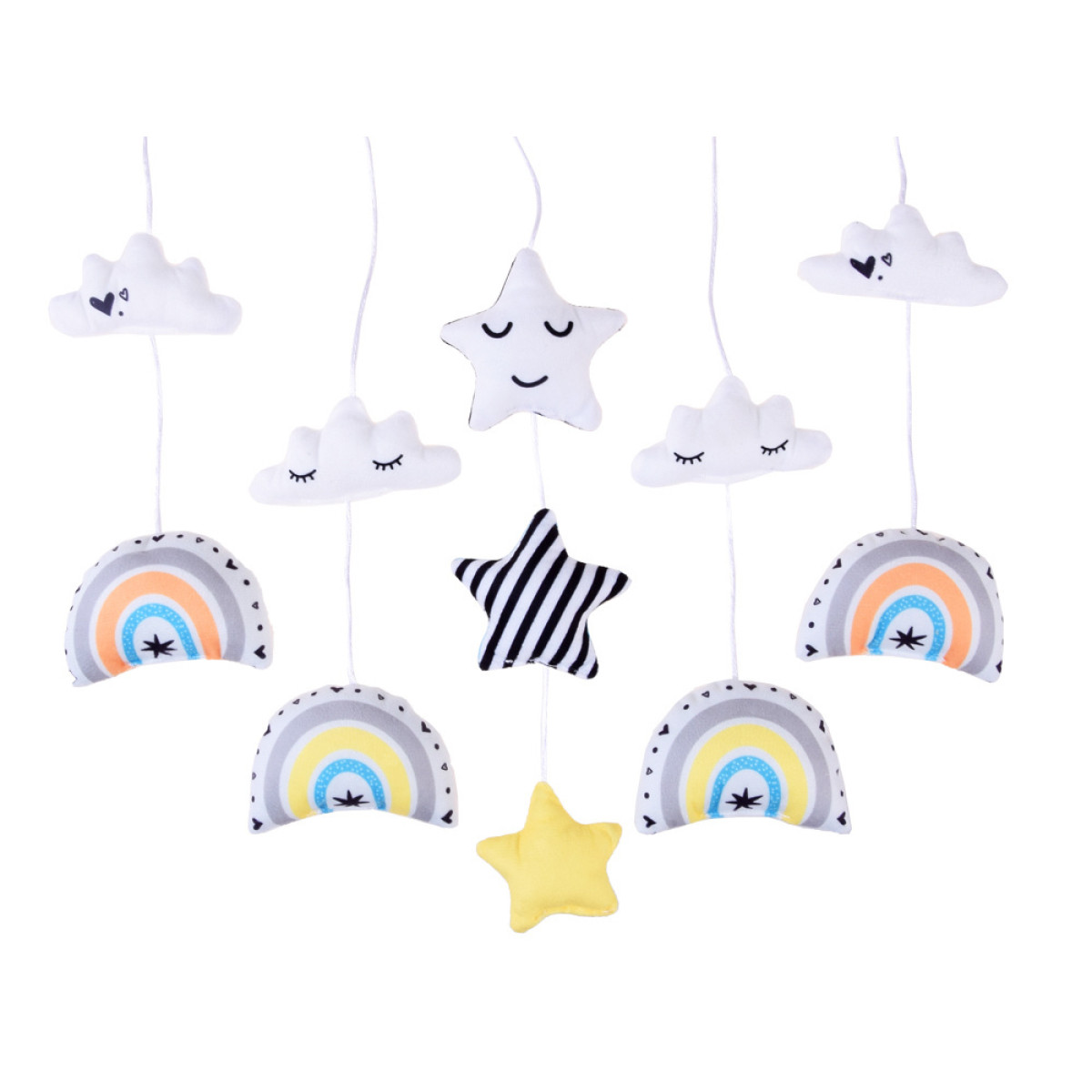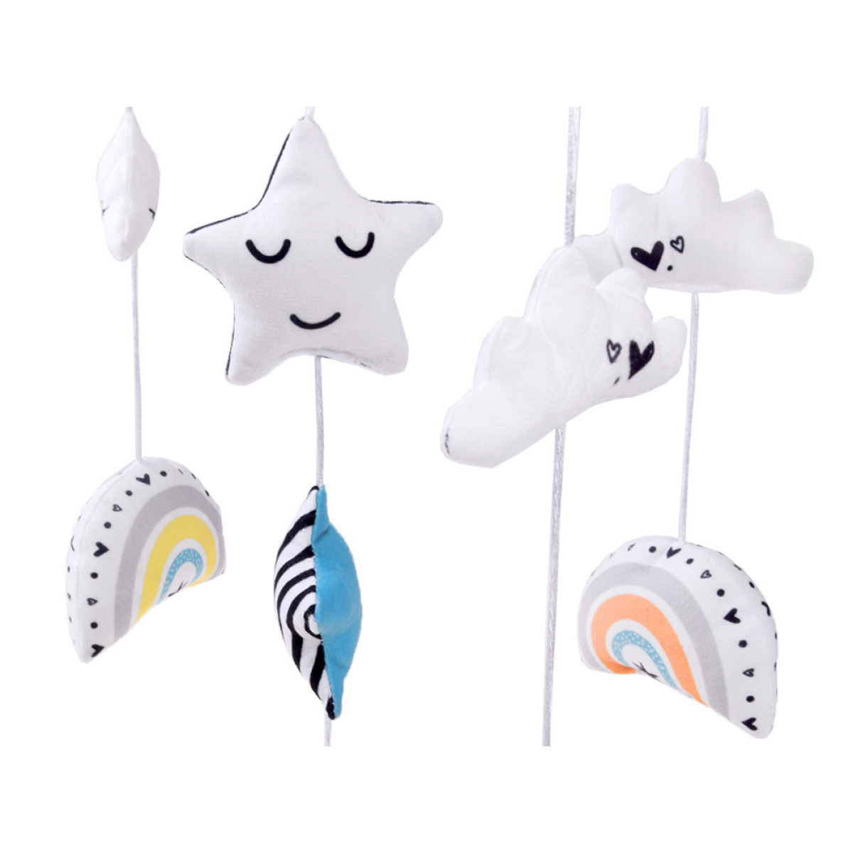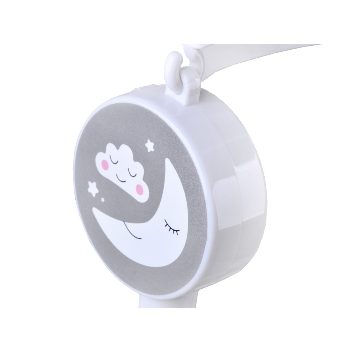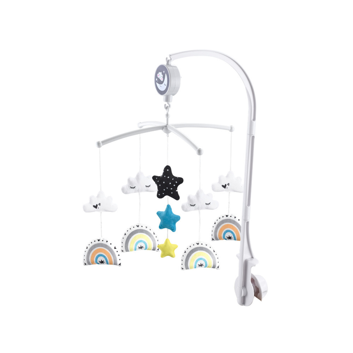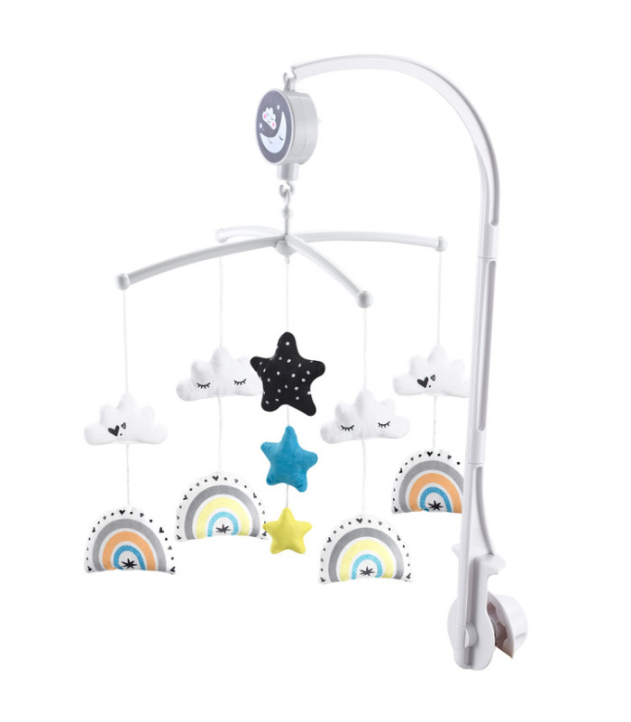 Šis skaists karuselis gultiņai ar mīkstiem mākoņiem ir ideāla rotaļlieta mazulim. Ar krāsainiem mākoņiem, varavīksni un zvaigznēm tas noteikti iepriecinās jūsu mazuli. Maigs kustības un mierīga melodija palīdzēs mazulim nomierināties un aizmigt vieglāk. Pēc uzvilkšanas karuselis griežas 360° un visu laiku spēlē melodiju. Tam ir ieslēgšanas/izslēgšanas slēdzis, kas ļauj ātri pārtraukt mūziku, ja nepieciešams.