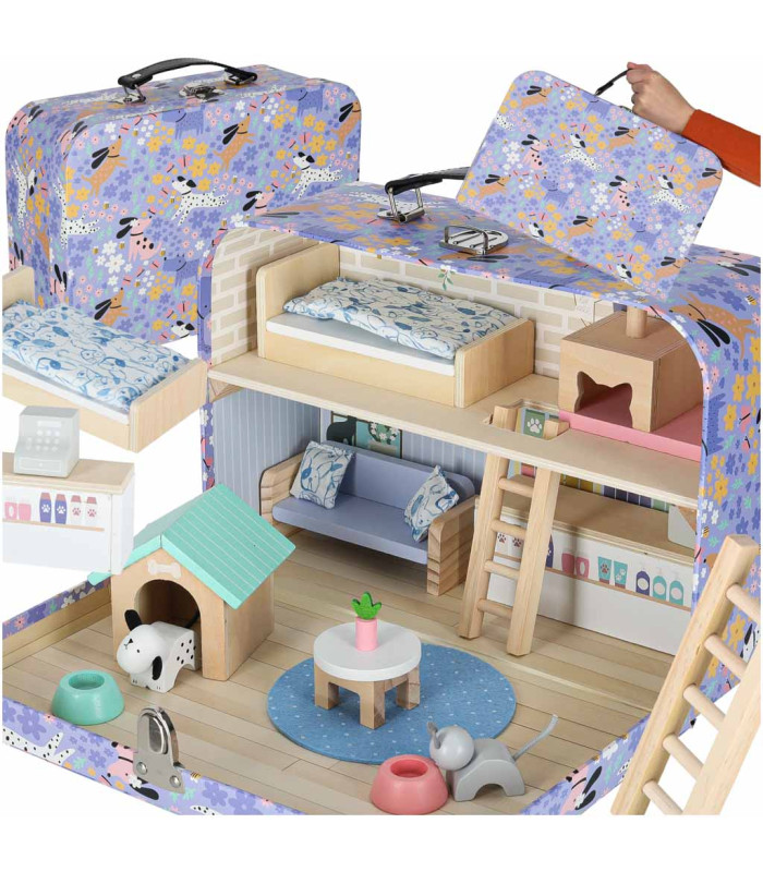 Mini dzīvnieku viesnīca koferī ir lieliska dāvana bērna dzimšanas dienā vai svētkos. Atverot koferi, tas pārvēršas par divstāvu māju. Komplektā ir iekštelpu mēbeles, piemēram, gulta ar segām un dīvāns, kā arī veikala elementi kā letes vai kases aparāts.