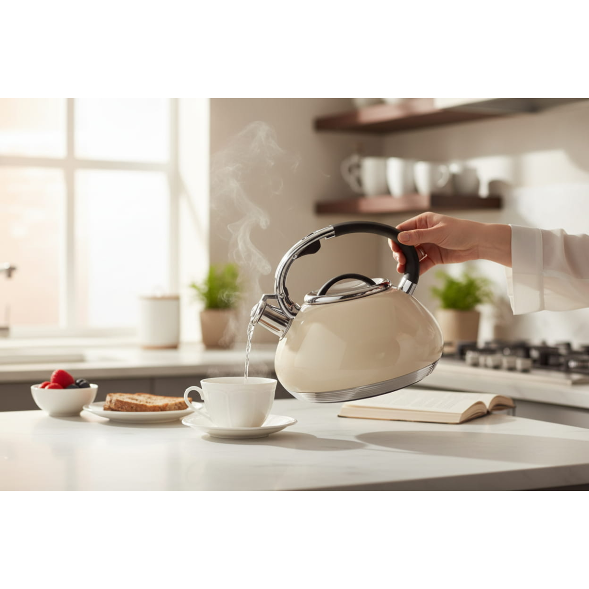 Noņemamais vāks ļauj ērti piepildīt tējkannu ar ūdeni un vienkārši to iztīrīt. Integrētā paceļamā svilpe ar skaņas signālu paziņo, kad ūdens ir uzvārījies. Priekšrocība: drošāka un ērtāka lietošana. Ieguvums: nav nepārtraukti jāuzrauga vārīšanās process.