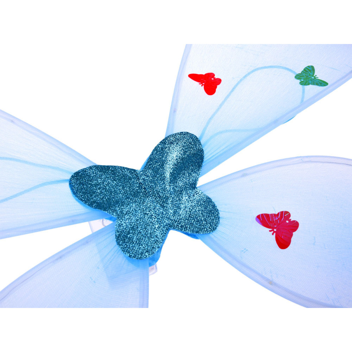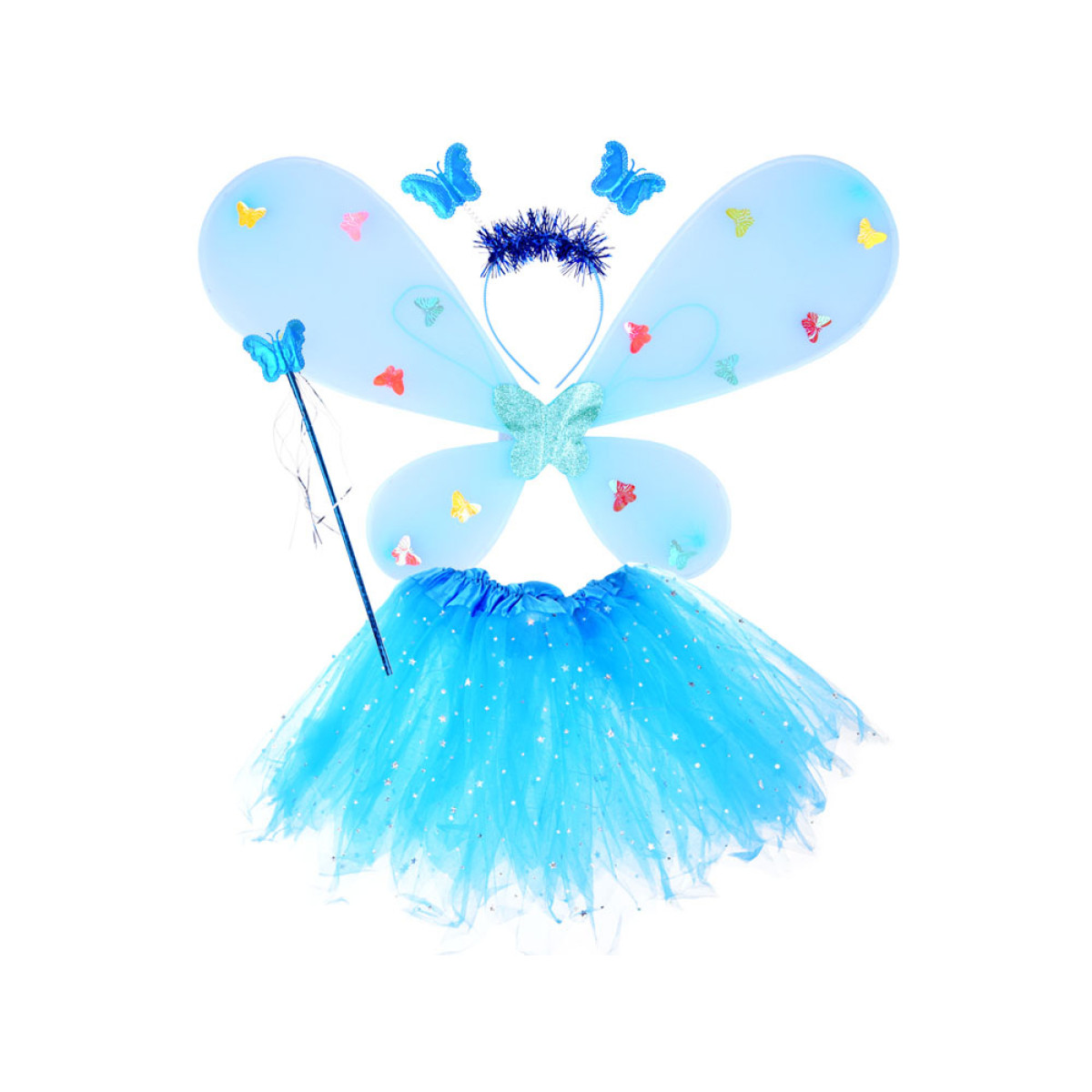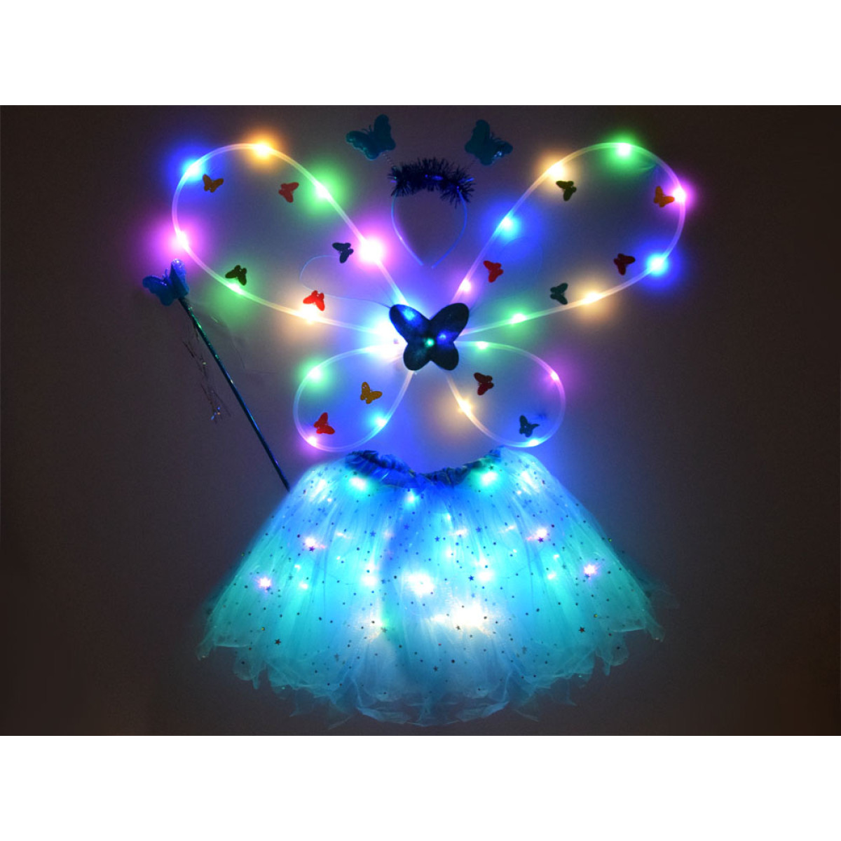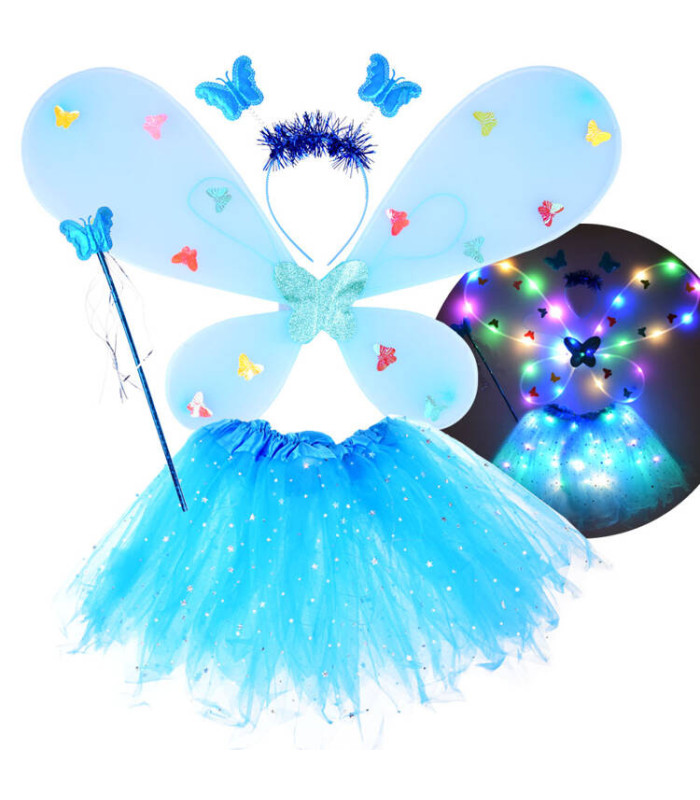 Zilas spīdošs kostīms mazajai fejiņai ar spārniem tauriņš noteikti apburs jebkuru mazu meiteni. Komplektā ietilpst skaista zilas krāsas tilla svārki ar gumiju, pārklāti ar maziem sudraba zvaigznītēm, un zili spārni, pie kuriem piestiprināti mazi krāsaini tauriņi, galvas lente un burvju nūjiņa. Šis skaistais komplekts burtiski spīdēs ballē, dzimšanas dienas svinībās, pateicoties LED gaismām, kas izvietotas svārkos un spārnos.