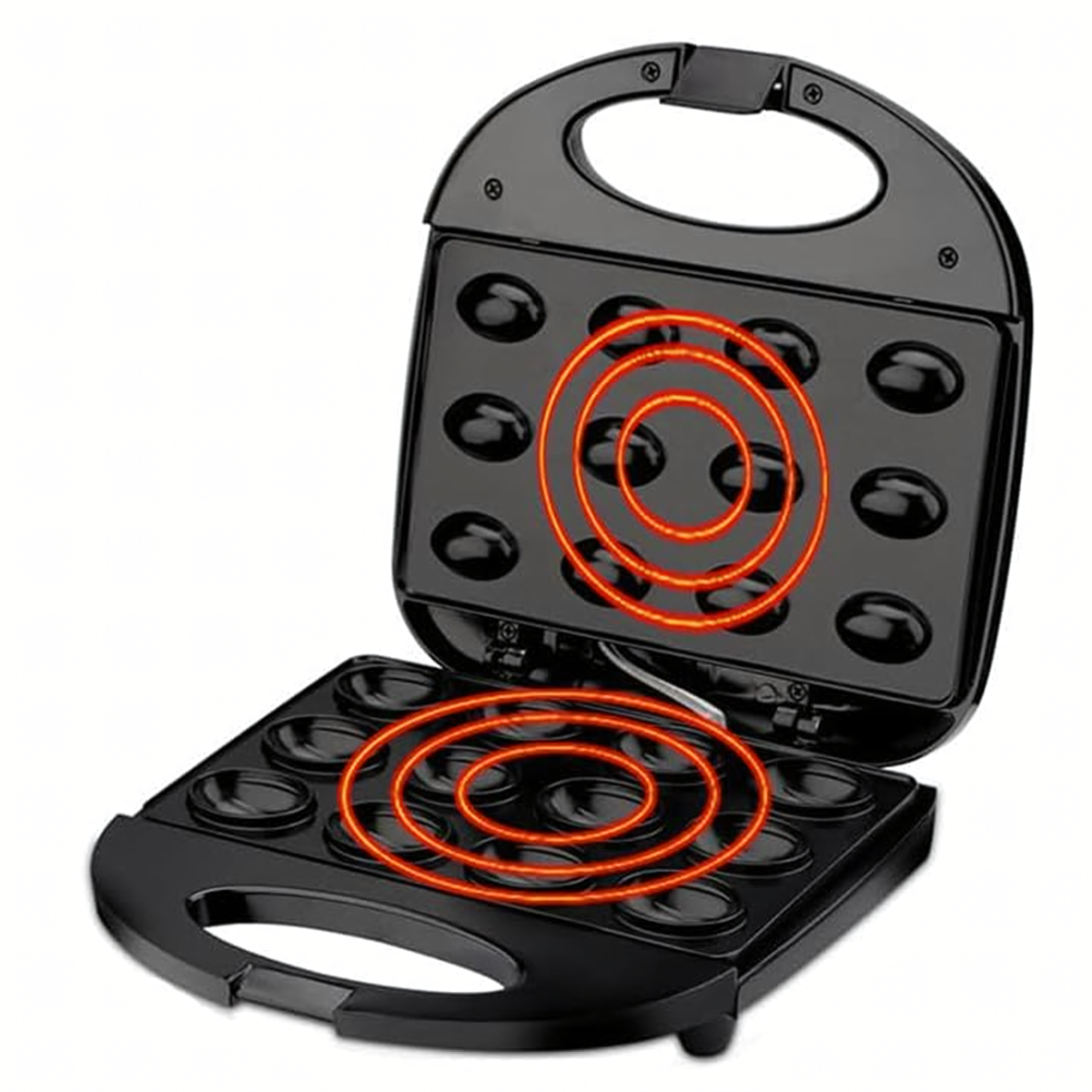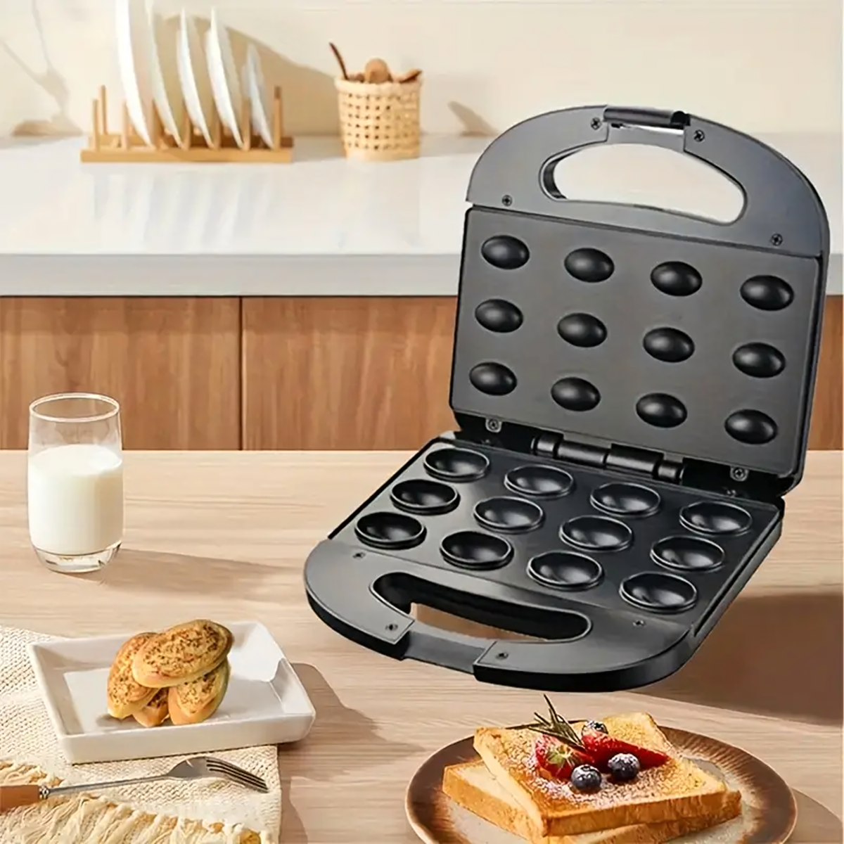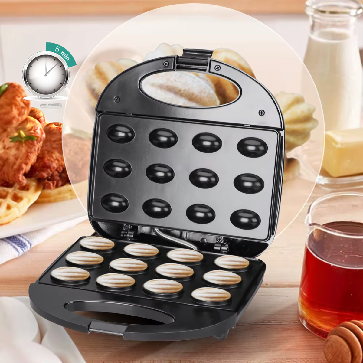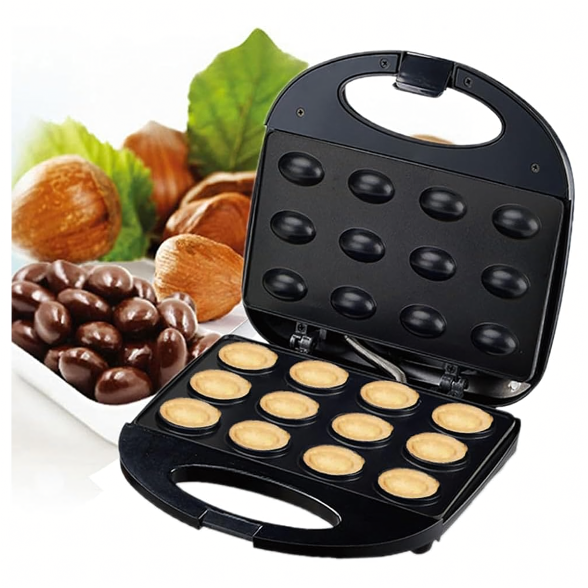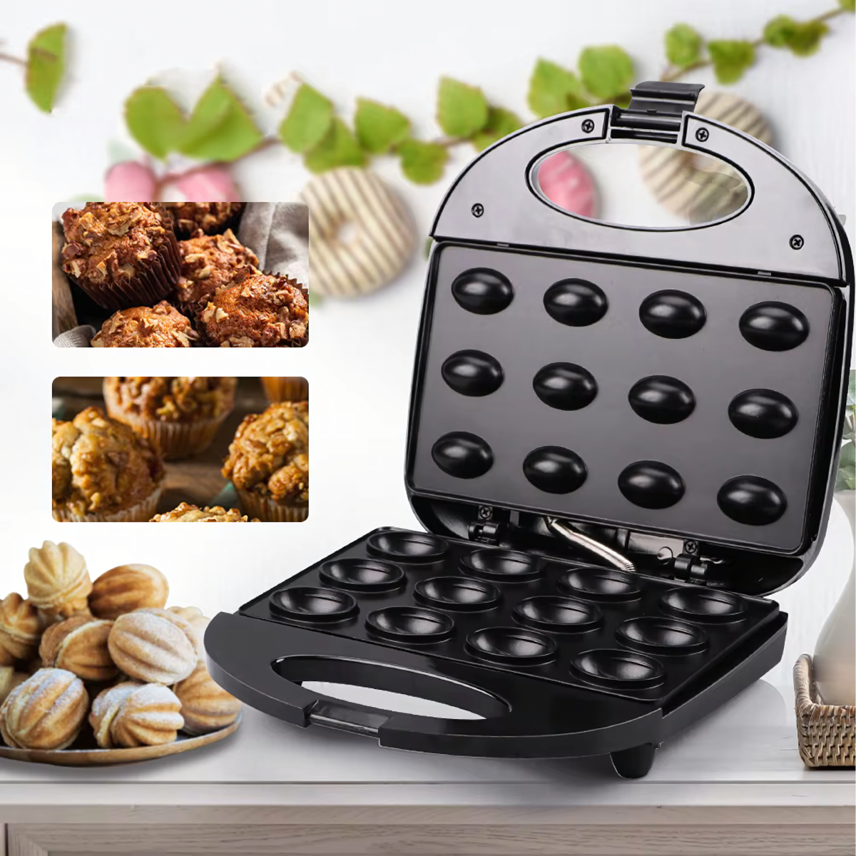 Orzeszkų Formos Kepimo Aparatas 750W - kepkite iki 6 pyragėlių vienu metu per kelias minutes! Neprideganti danga, kompaktiškas dydis, apsauga nuo perkaitimo ir intuityvus valdymas. Puikiai tinka bet kuriai virtuvei!