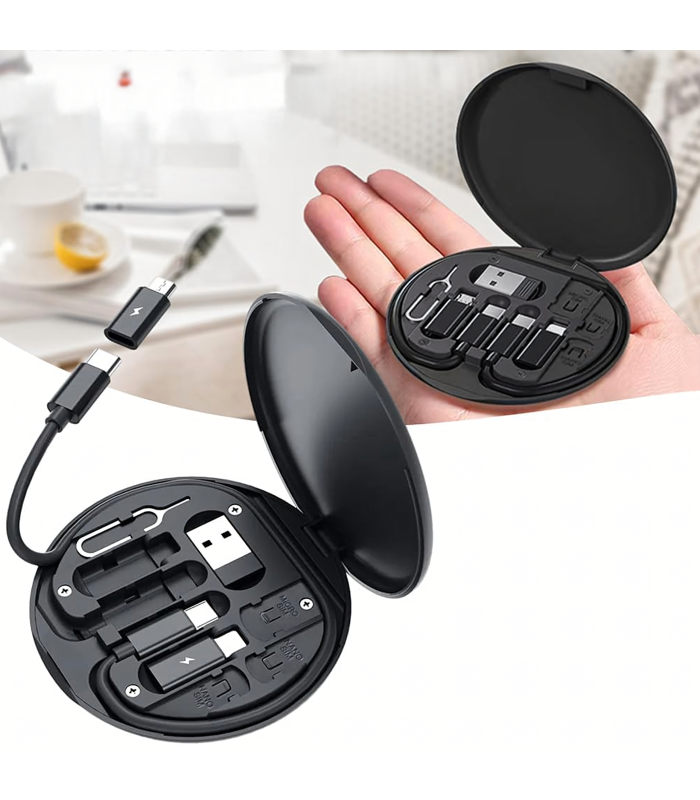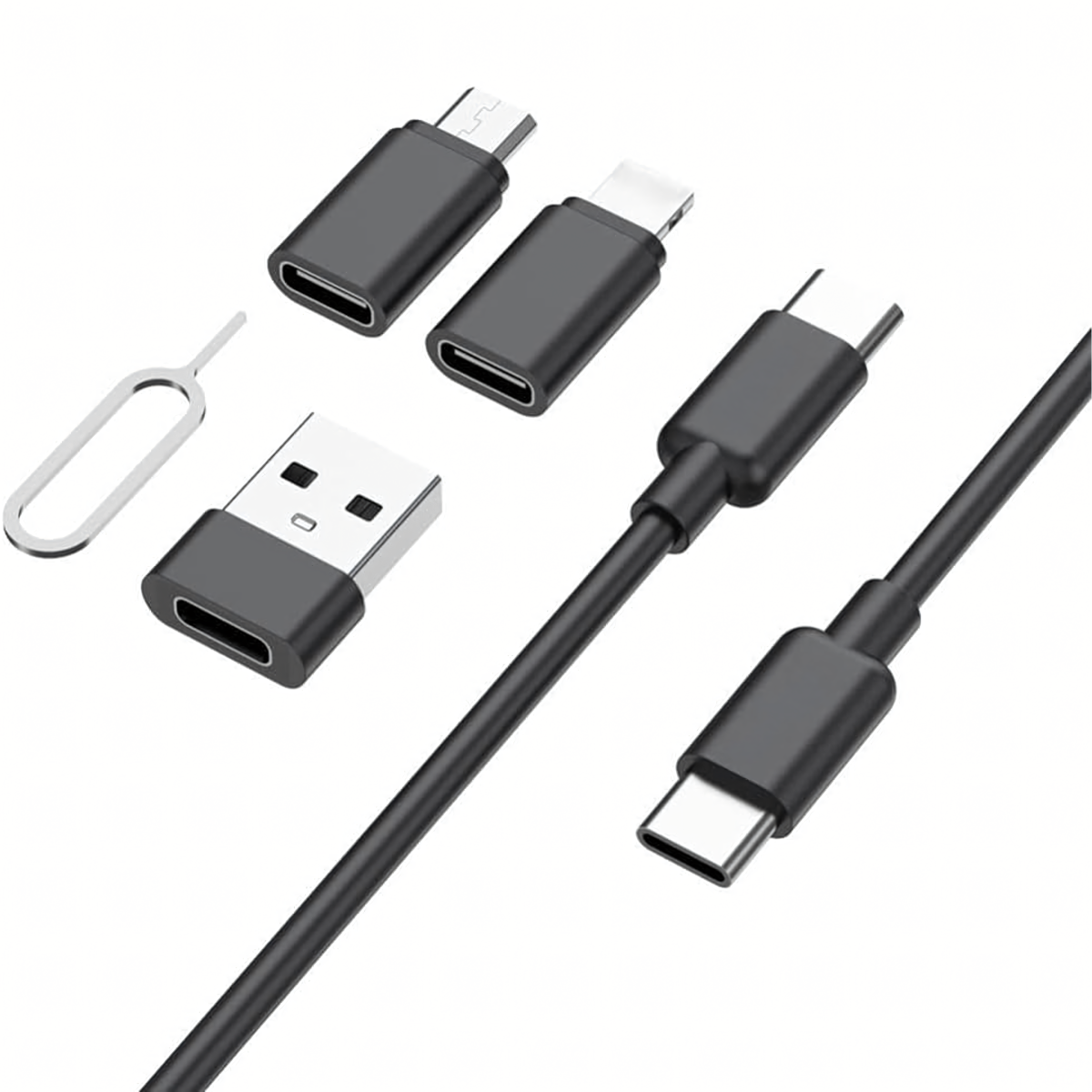 Ceļojumu Organizators 5-in-1 ar USB-C, Lightning, Micro USB un USB-A adapteriem – kompakts komplekts uzlādei un datu pārsūtīšanai, ideāli piemērots ceļojumiem. Aprīkots ar SIM kartes paliktņa adatu un vietu 3 kartēm, nodrošinot ērtību un kārtību vienmēr pa rokai.