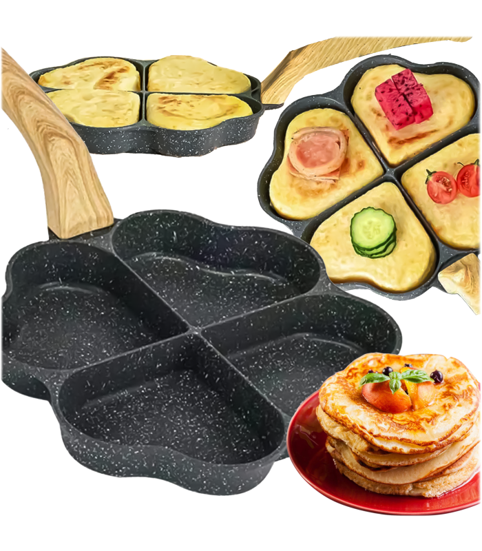 Sirds formas pannas pankūkām un olām ir inovatīvs un unikāls virtuves piederums, kas piešķirs jūsu virtuvei mūsdienīgumu un funkcionalitāti. Ar 17,5 x 17,5 cm izmēriem un četriem 9 cm diametra atverēm, šī panna ļauj perfekti pagatavot ceptas olas, pankūkas un plāceņus, piešķirot tiem ideālu, apaļu formu.